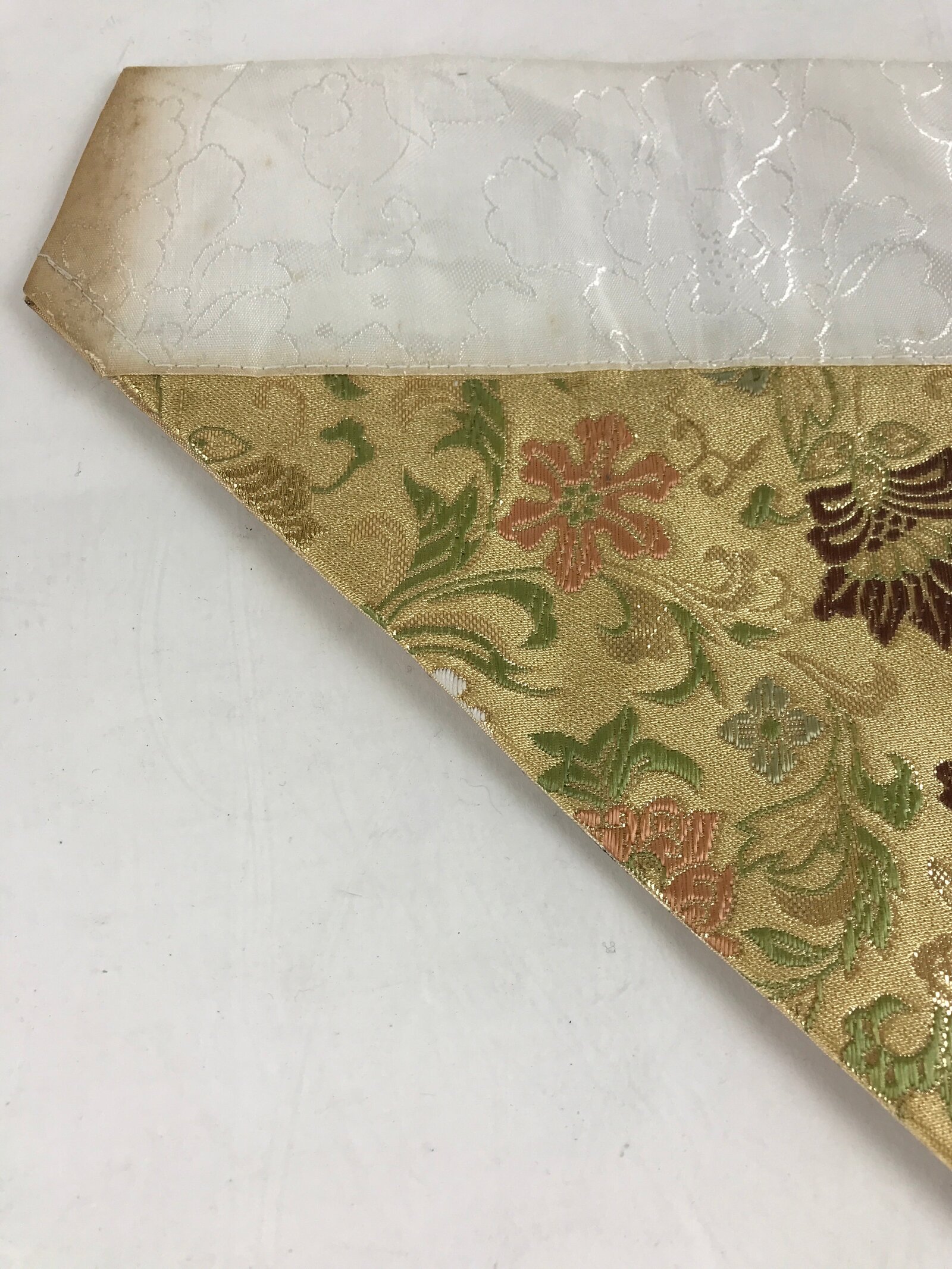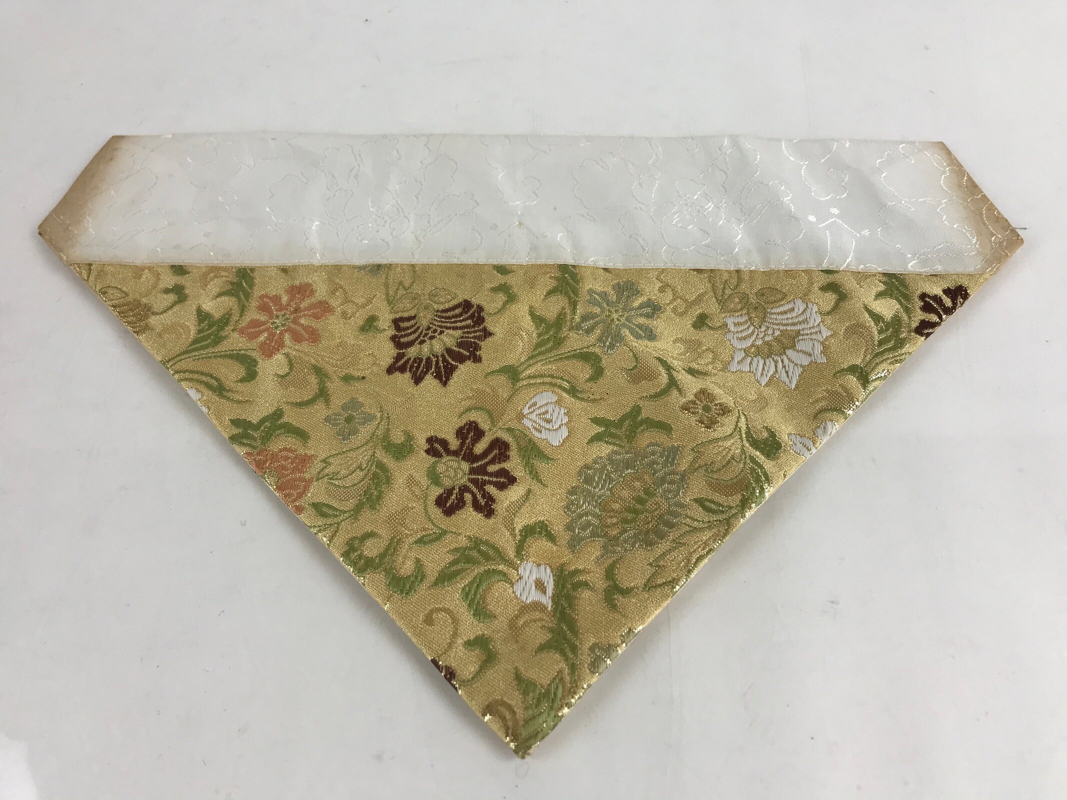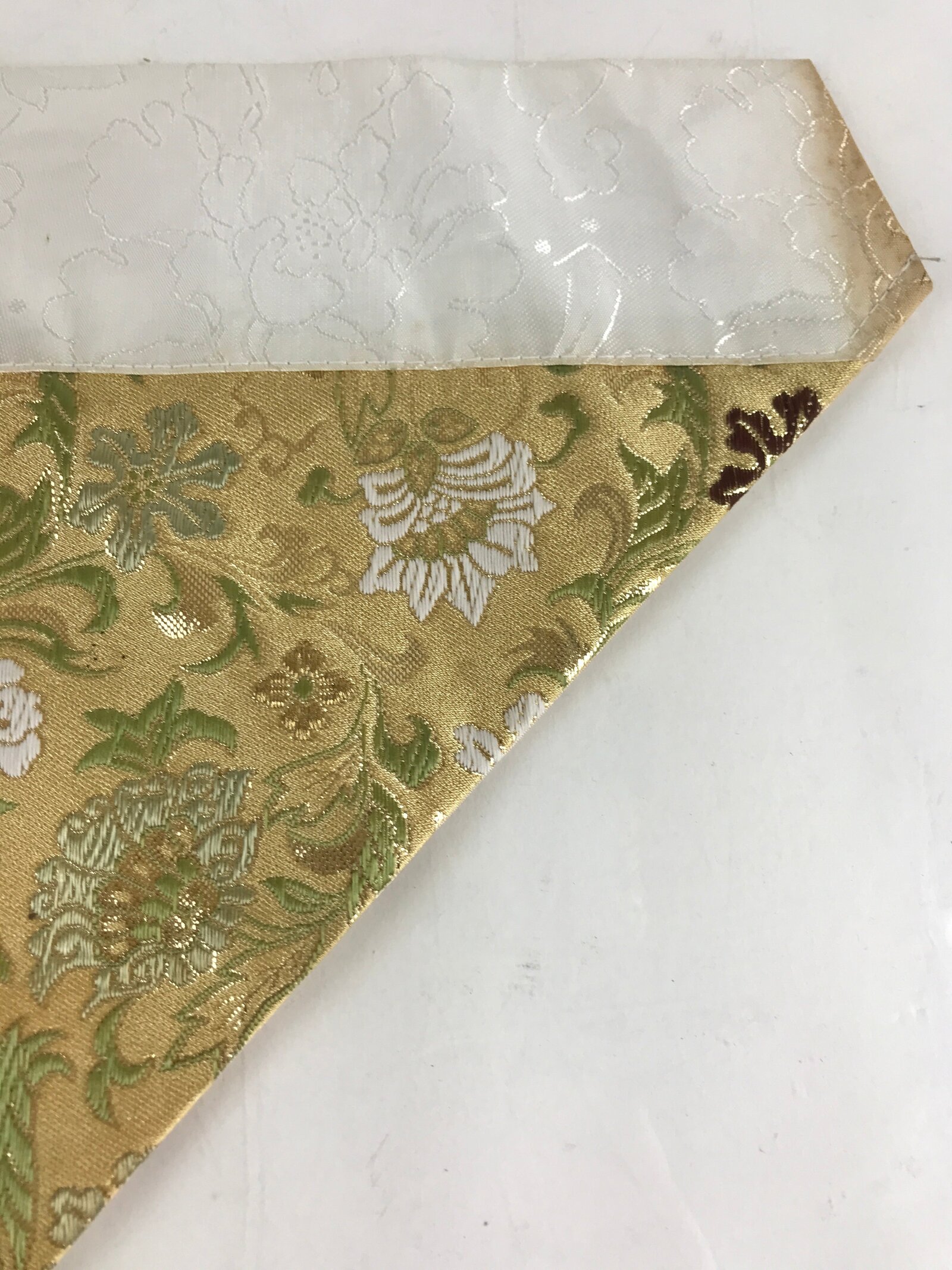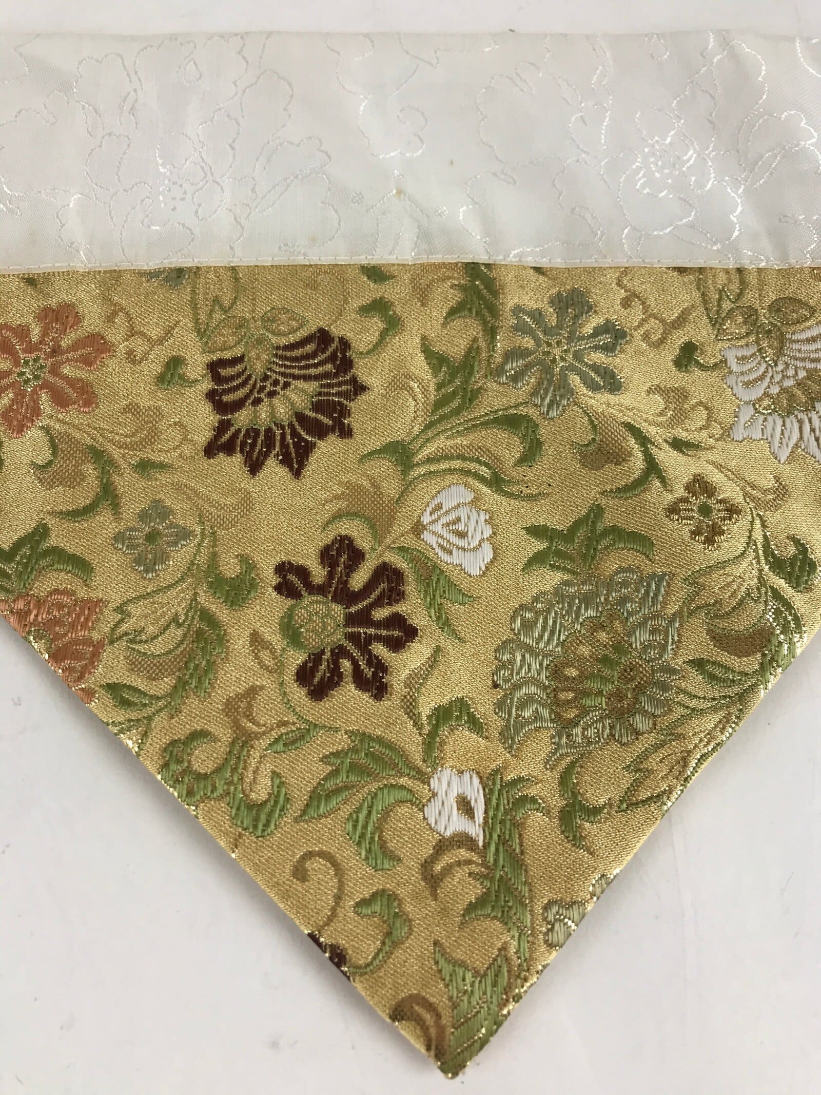 This is a vintage Japanese Buddhist altar tablecloth Uchishiki. This is gold flower embroidery. Triangular uchishiki is mainly used by followers of Jodo Shinshu Buddhism as the upper table (Maejyoku) and the front table (Uwajyoku) in the Buddhist altar during events such as New Year’s Day, the equinoctial week, Obon, and memorial services.