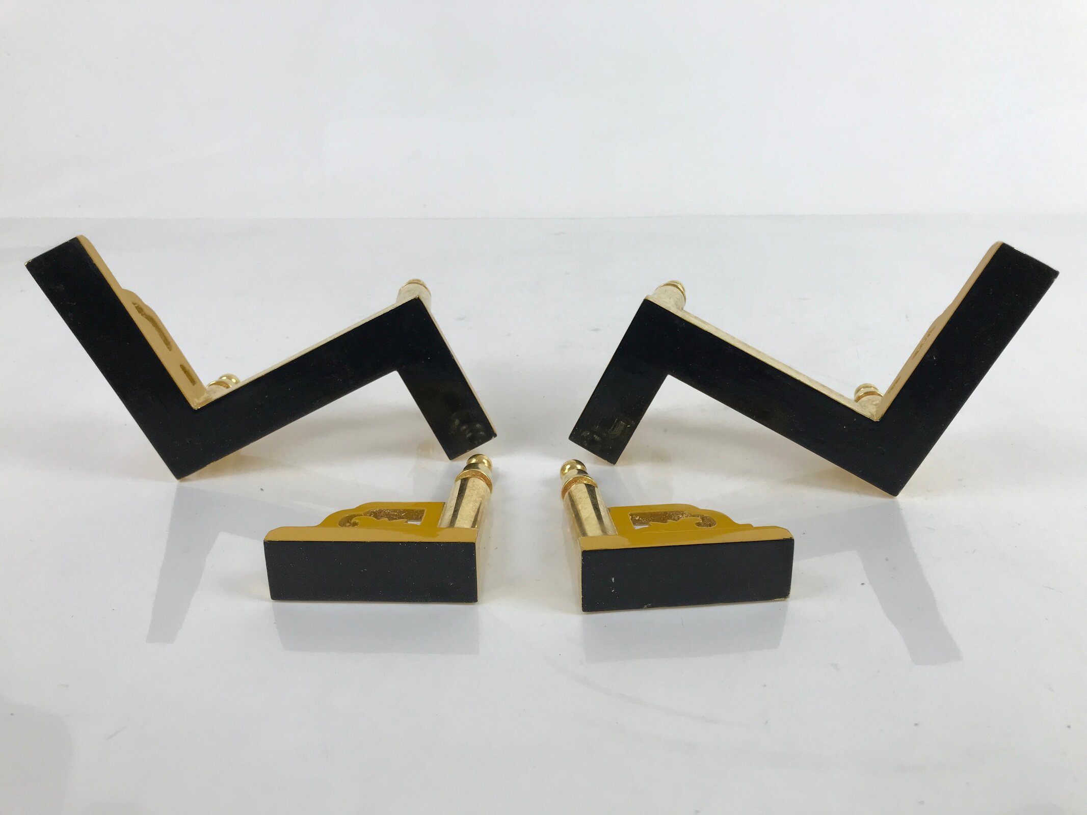 This is a vintage Japanese part of a Buddhist altar called kouran. It is the decorative railing that decorates the front part of the top step of the butsudan. It is a set of four pieces made of wood; two large angled pieces and two small end pieces. It is lacquered with a gold color and the bottom base is black. It can be used as spare parts for repair or as a general decoration.