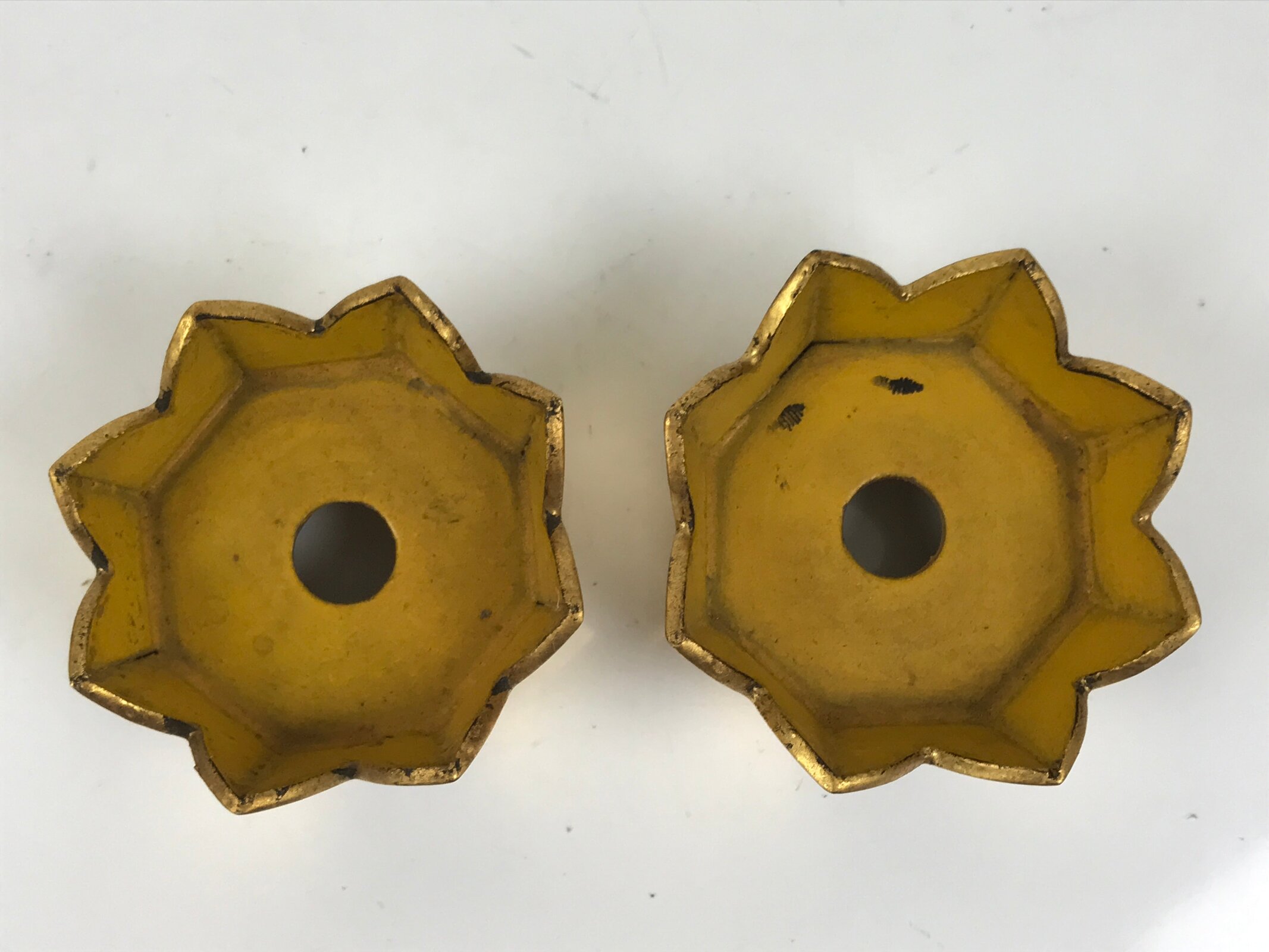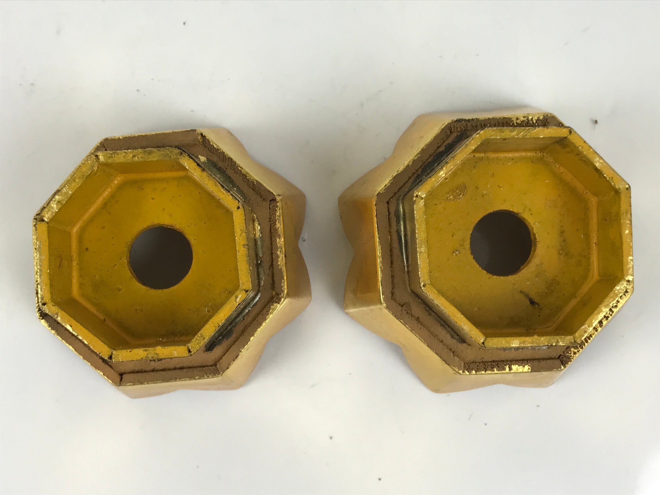 This is a pair of vintage offering stands called Kuge for the Buddhist altar in Japan. Cut in a floral shape with a removable top piece resembling a flower, this pair is painted with gold and yellow lacquer. It is a utensil for offering rice cakes, fruits, Rakugan sweets, etc, and is mainly used by the Jodo Shinshu Honganji sect of Buddhism. Each of the stands easily comes apart. This pair is cased in a wooden box and there is an handwritten sentence on the backside of the lid.