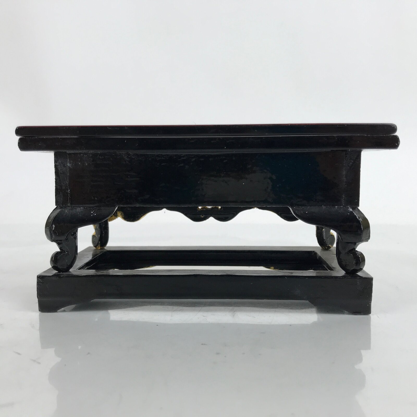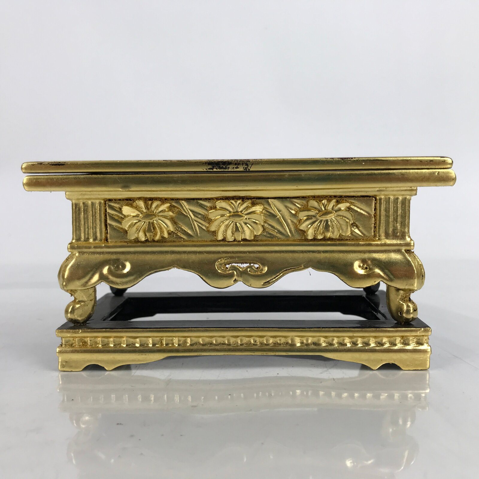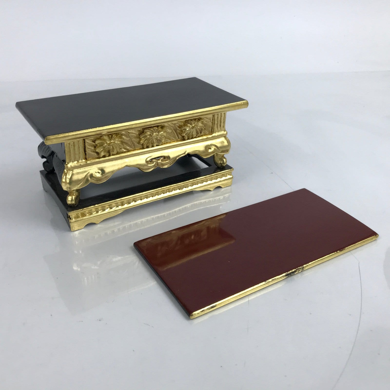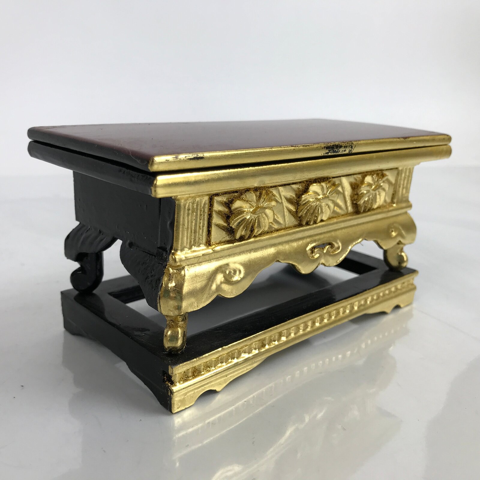 This is a vintage small Japanese Buddhist altar offering table (Maejoku). It is mostly gold with the top surface coated in a glossy black lacquer. On the front side has carved chrysanthemums also painted gold. It has a reversible top panel with black on one side and red on the other.