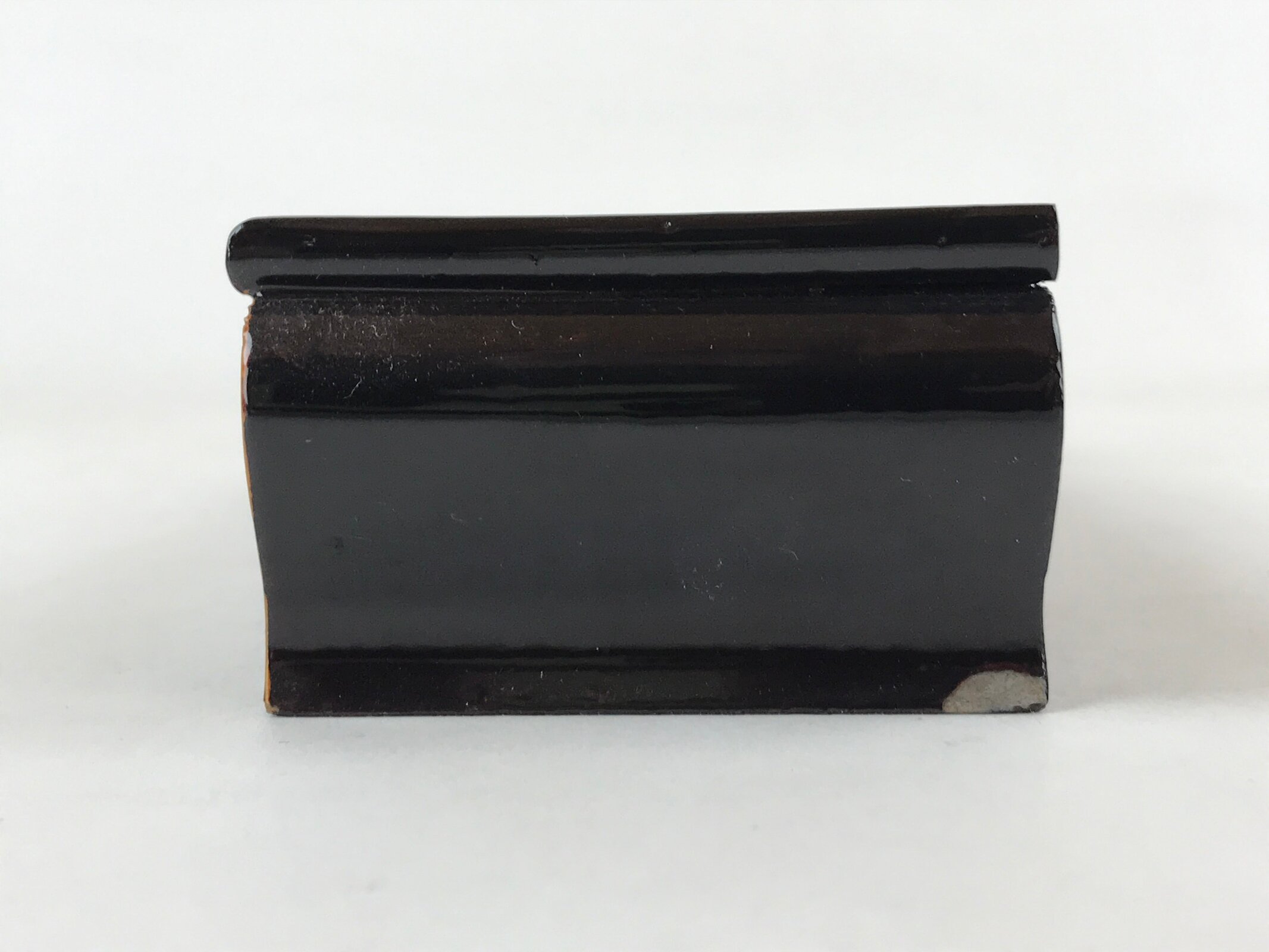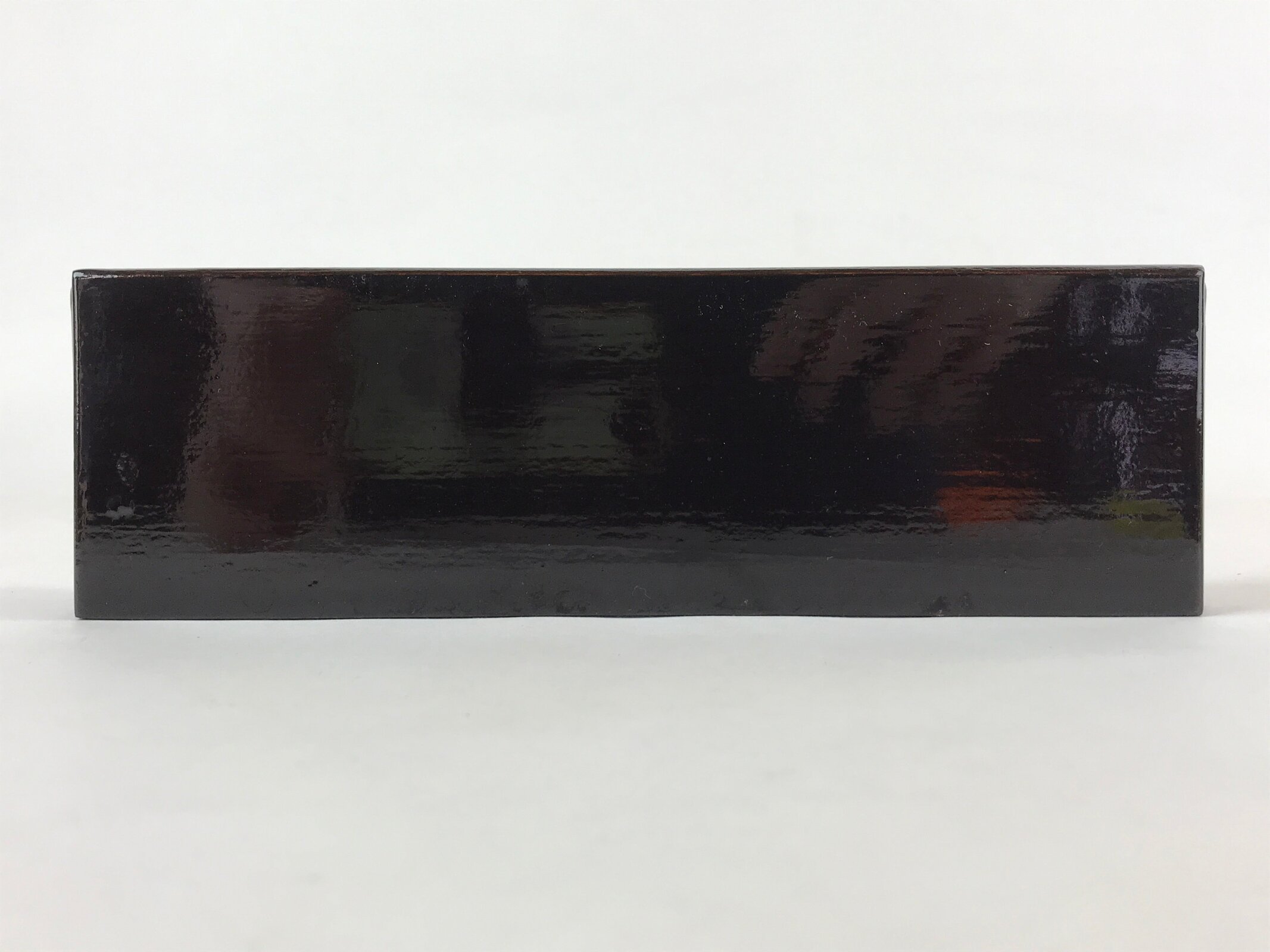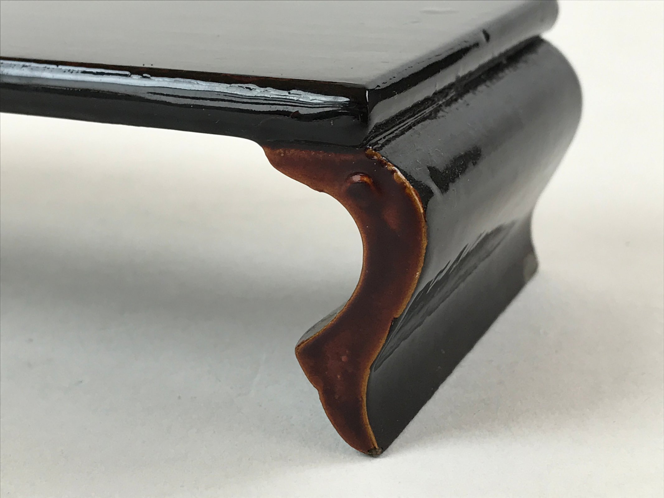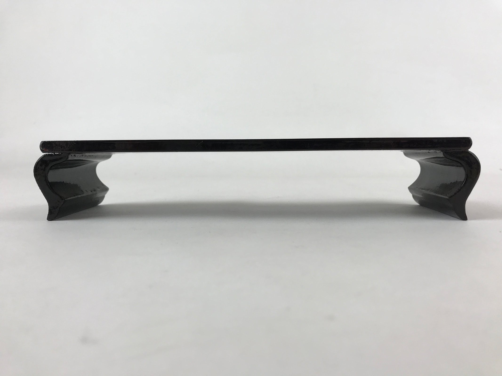This is a vintage Japanese Buddhist altar offering table (Maejyoku). It is coated with black lacquer with a brown lacquer accent on the front legs. It is a minimalist rectangular shape with no extra embellishments.