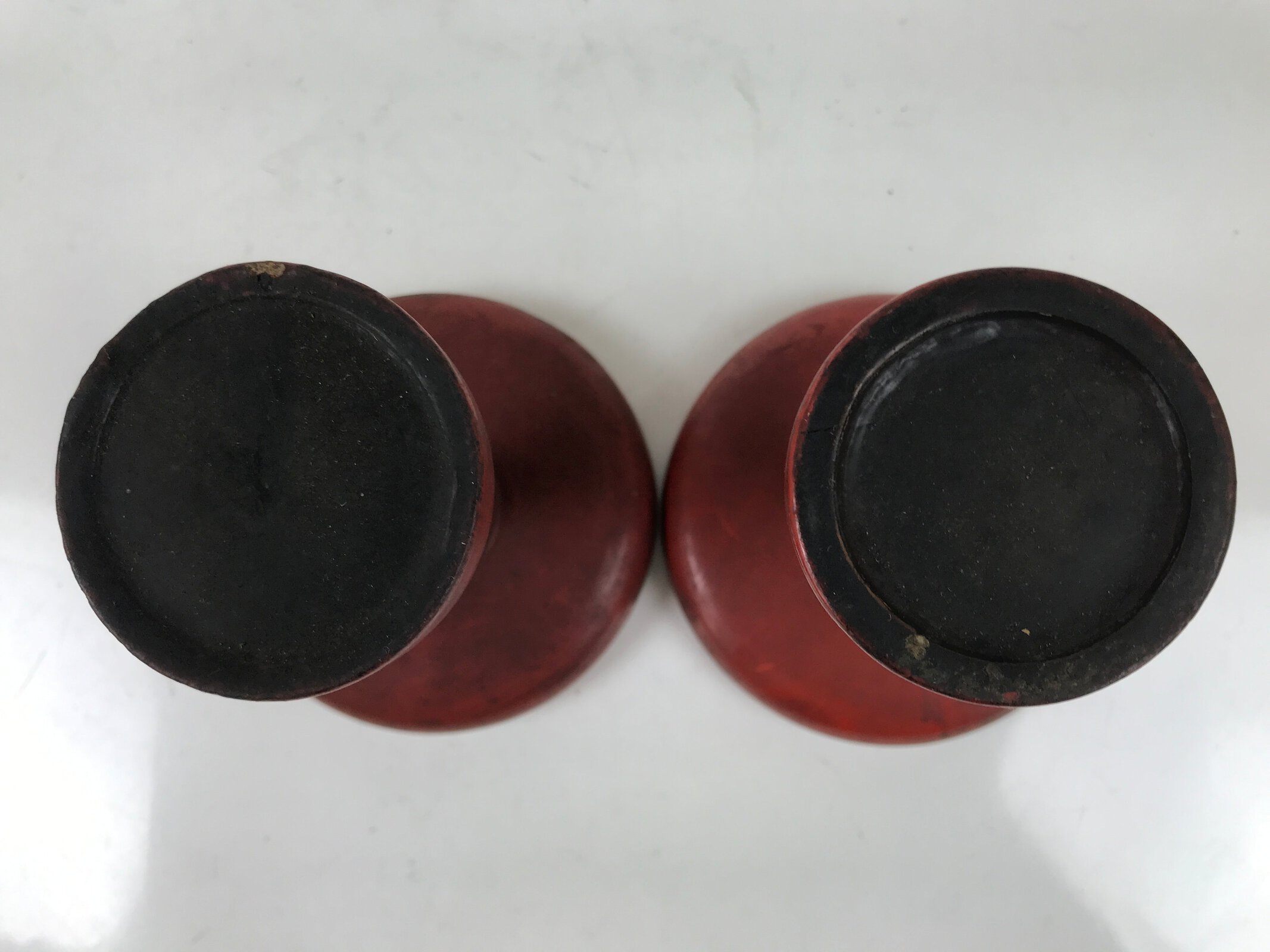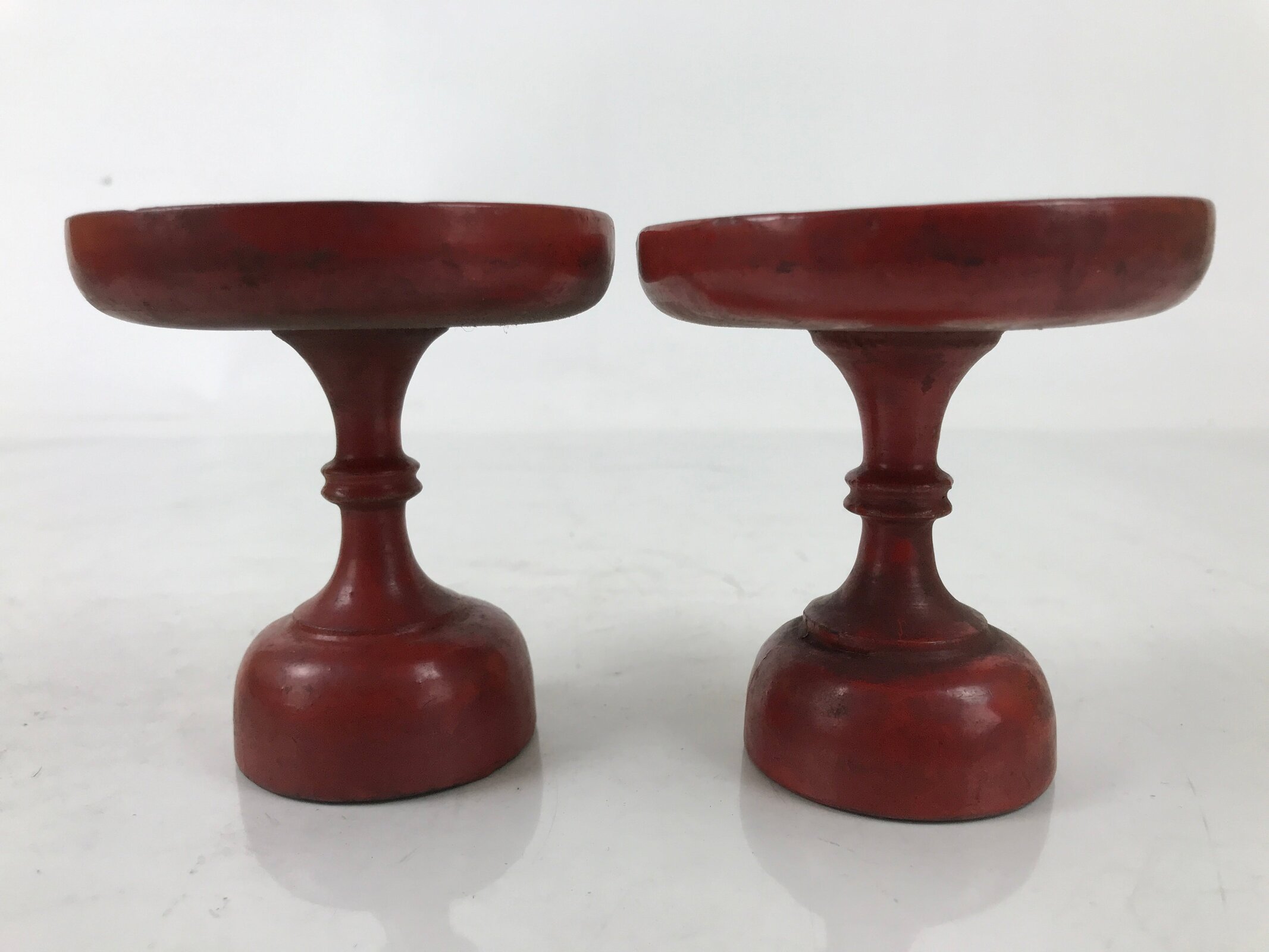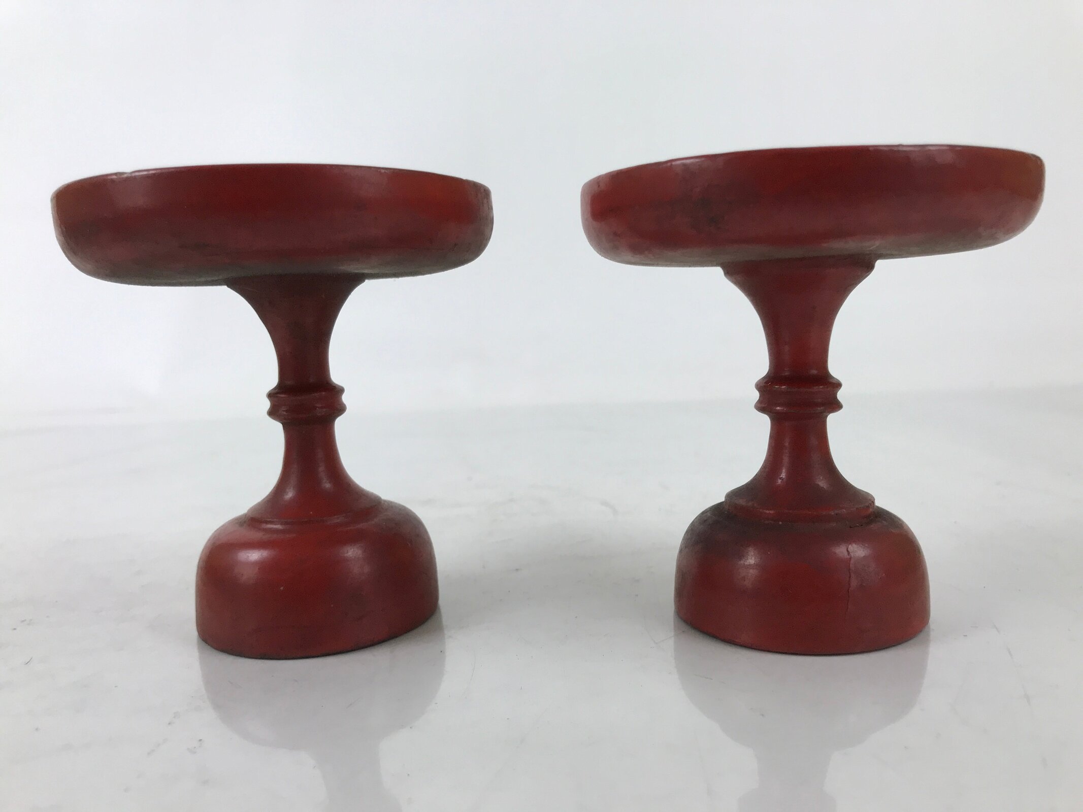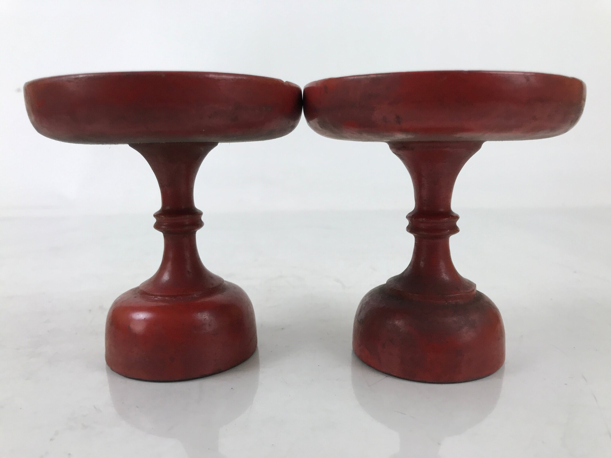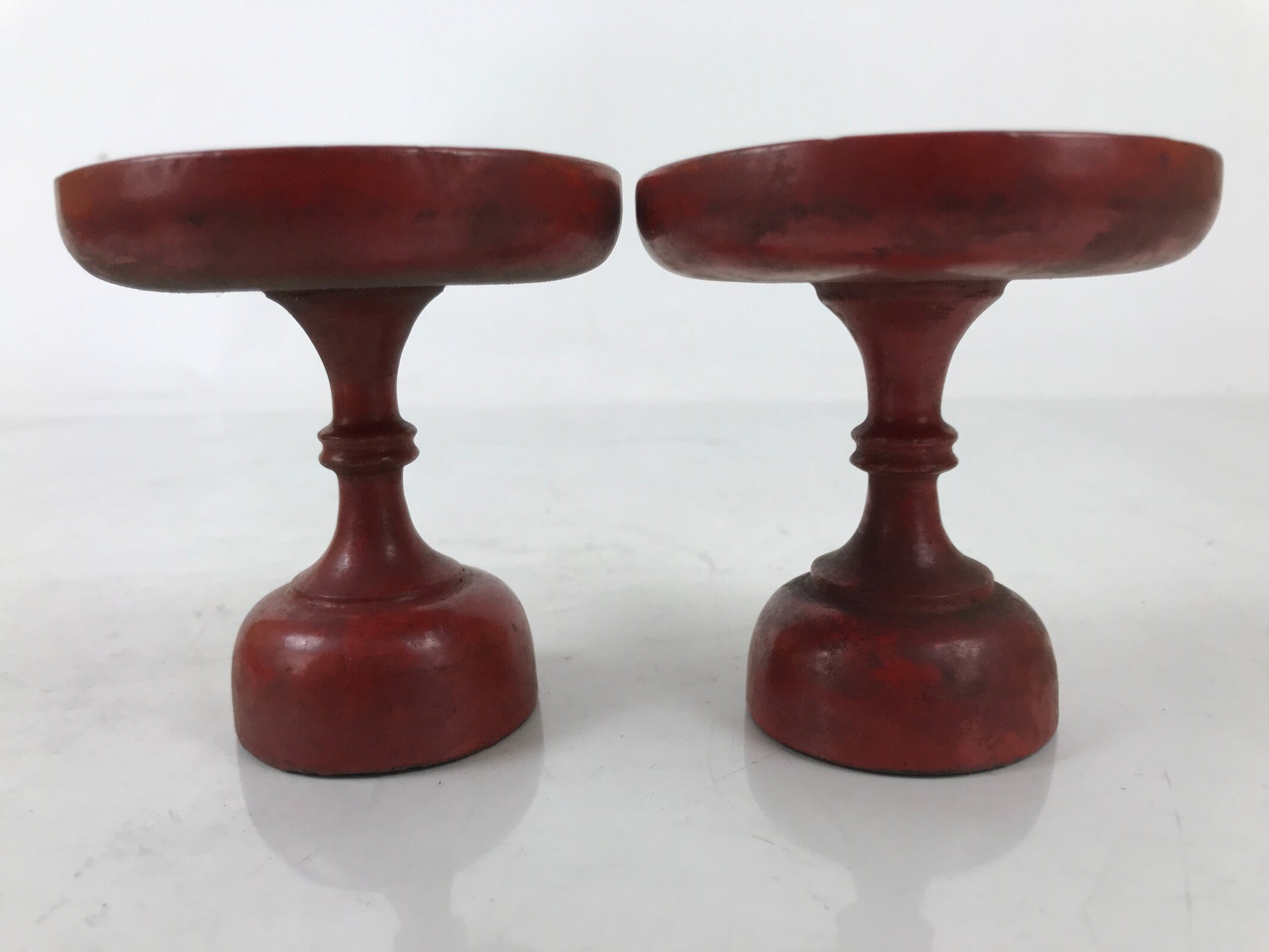 This is a pair of vintage Buddhist altar fittings called takatsuki (offering high cups). This simple set is made of wood and lacquered in red. When using takatsuki, paper is laid out, and sweets or fruits are placed on it to offer to ancestors. It is set inside or in front of a Buddhist altar.