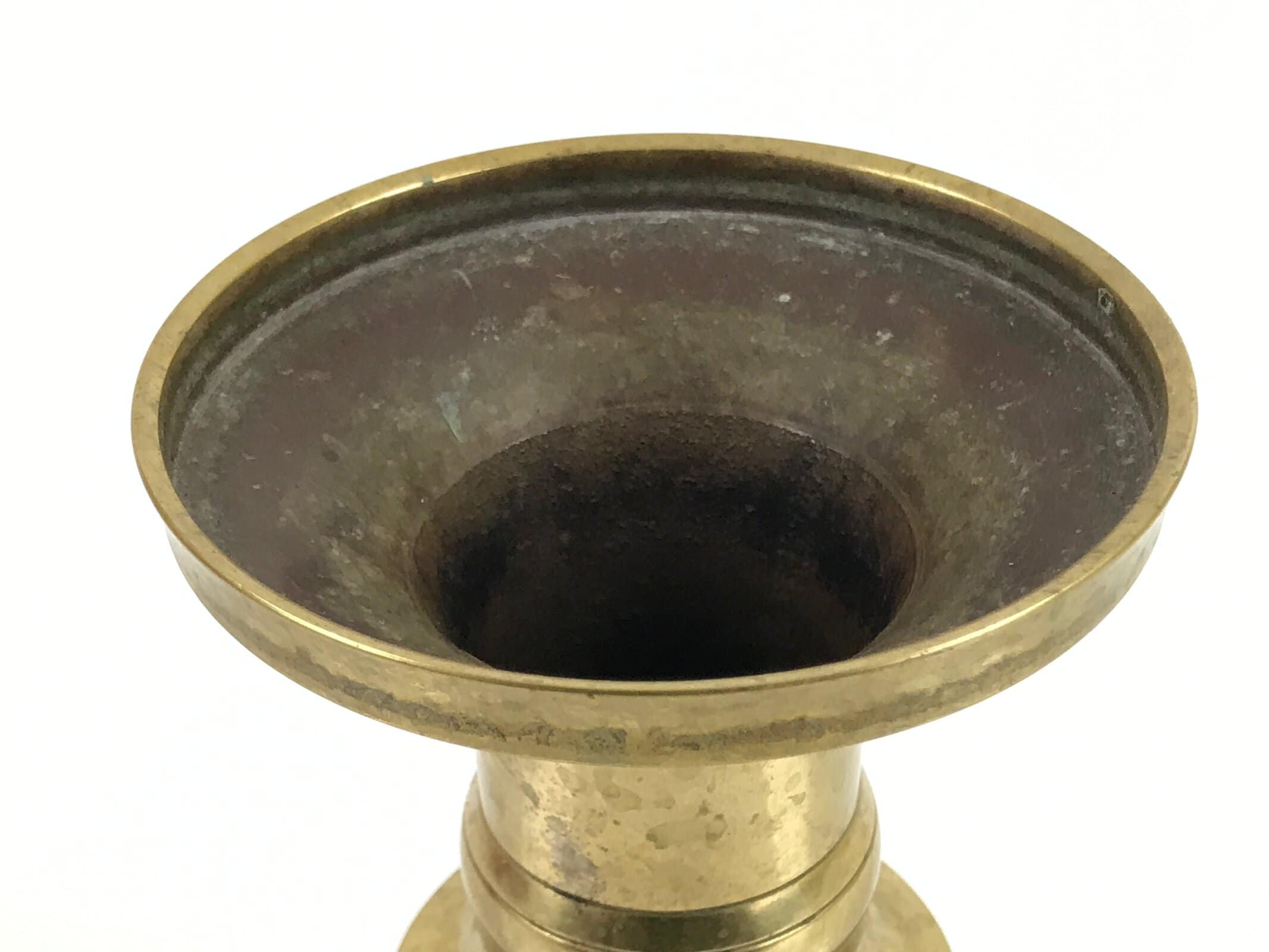 This is a brass flower vase, hanatate, for Buddhist altars. It is common to offer a range of seasonal and symbolic flowers in front of a Buddhist altar. It is also a vessel for Sakaki leaves or Shashagi leaves in Shinto. The meaning of offering sakaki tree leaves is that the gods living in the sakaki tree will protect the grave and the soul. This particular vase is larger and has a classic shape with no added embellishments or designs.