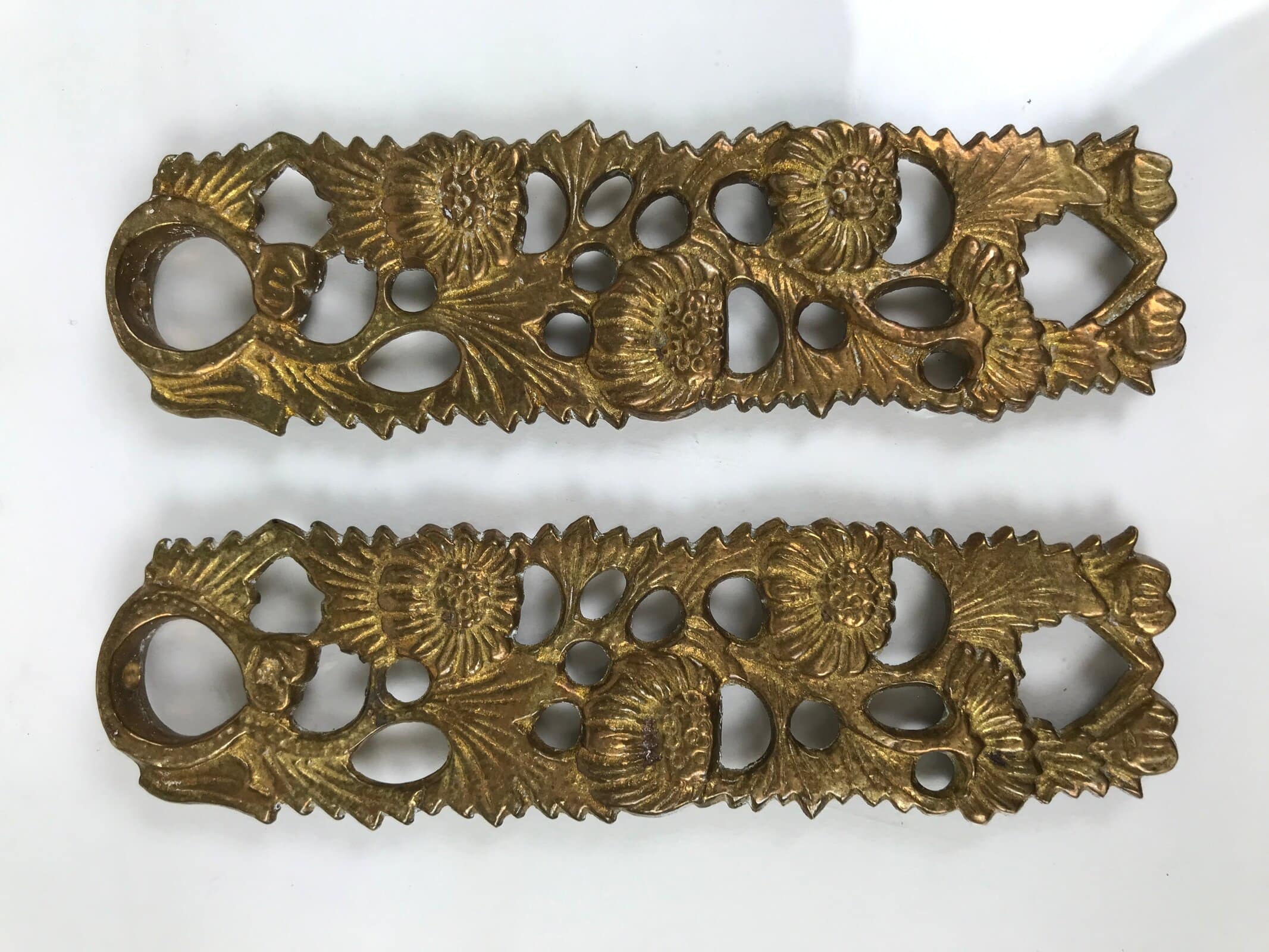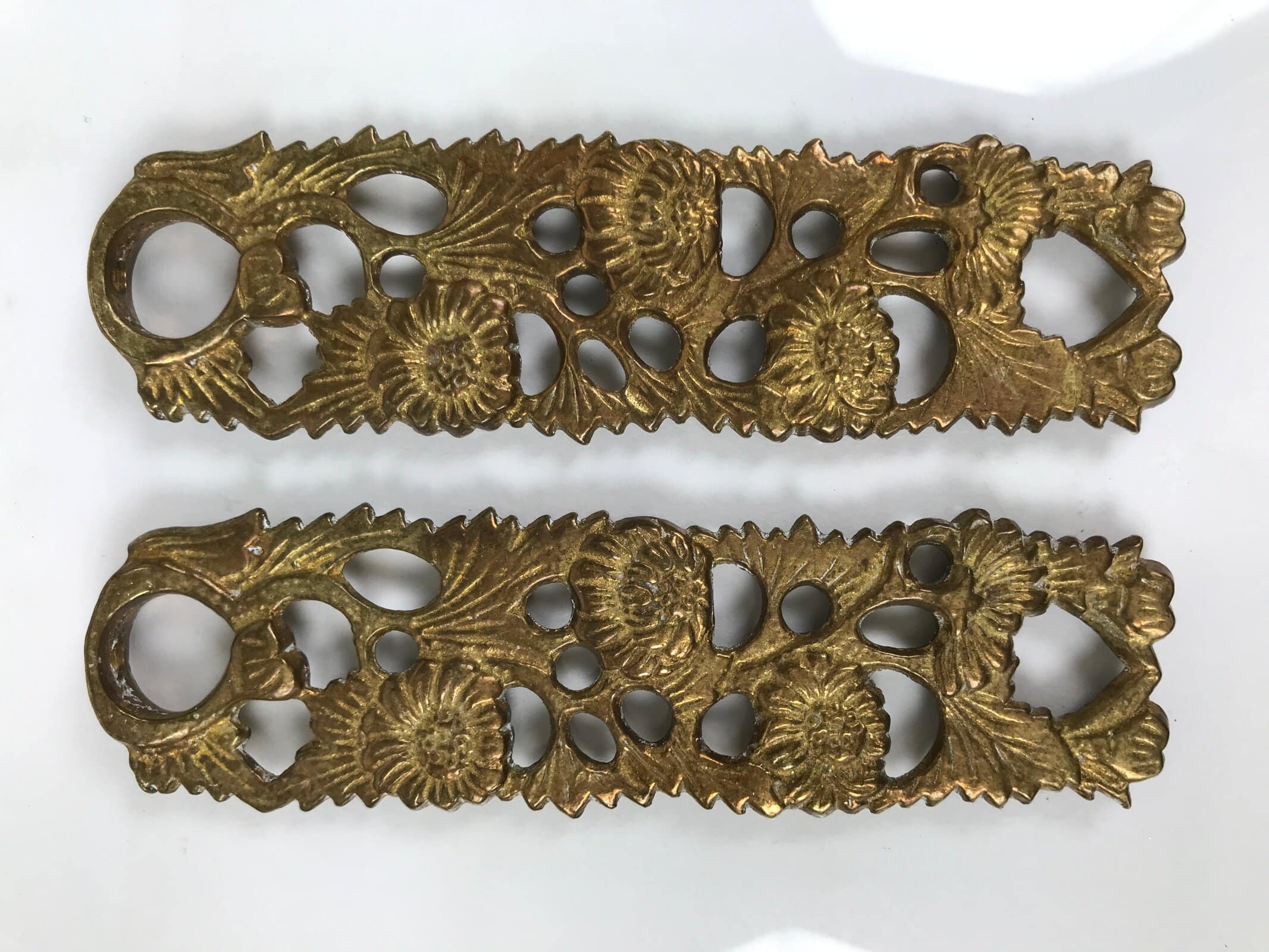 - Good condition considering age. Some scratches throughout. Hooks on middle panels missing. Tarnish. Wear and tear due to age. Please see the photos.