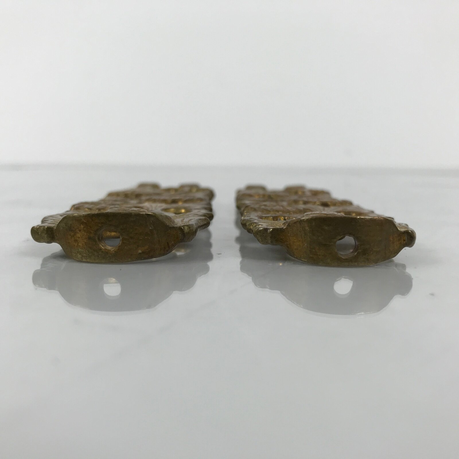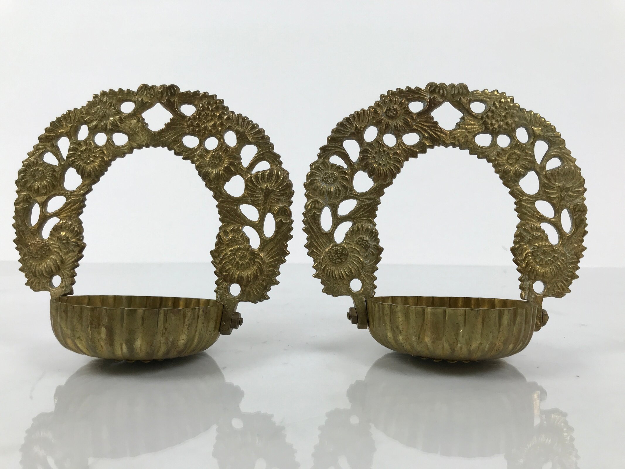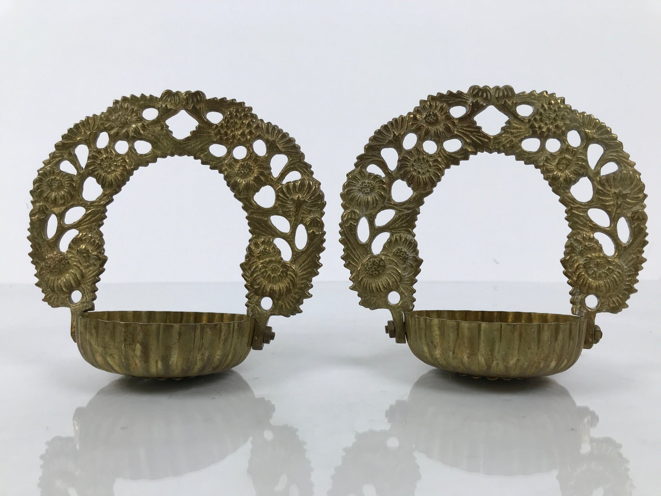 This is a set of spare parts from a vintage Japanese Buddhist brass metal hanging lantern, or rinto, made to be hung in Buddhist altars (butsugu). This set comes with the bottom pieces as well as the middle panels (sans hooks). Each has intricate chrysanthemum and peony designs throughout, as well as the chrysanthemum shape of the bowls. They have a raised circular piece on the inside of the base meant to secure a small round metal bracket, which would then hold a small plate or bowl that holds weights, candles, or sometimes small electrical lights. **This is not a complete set.**