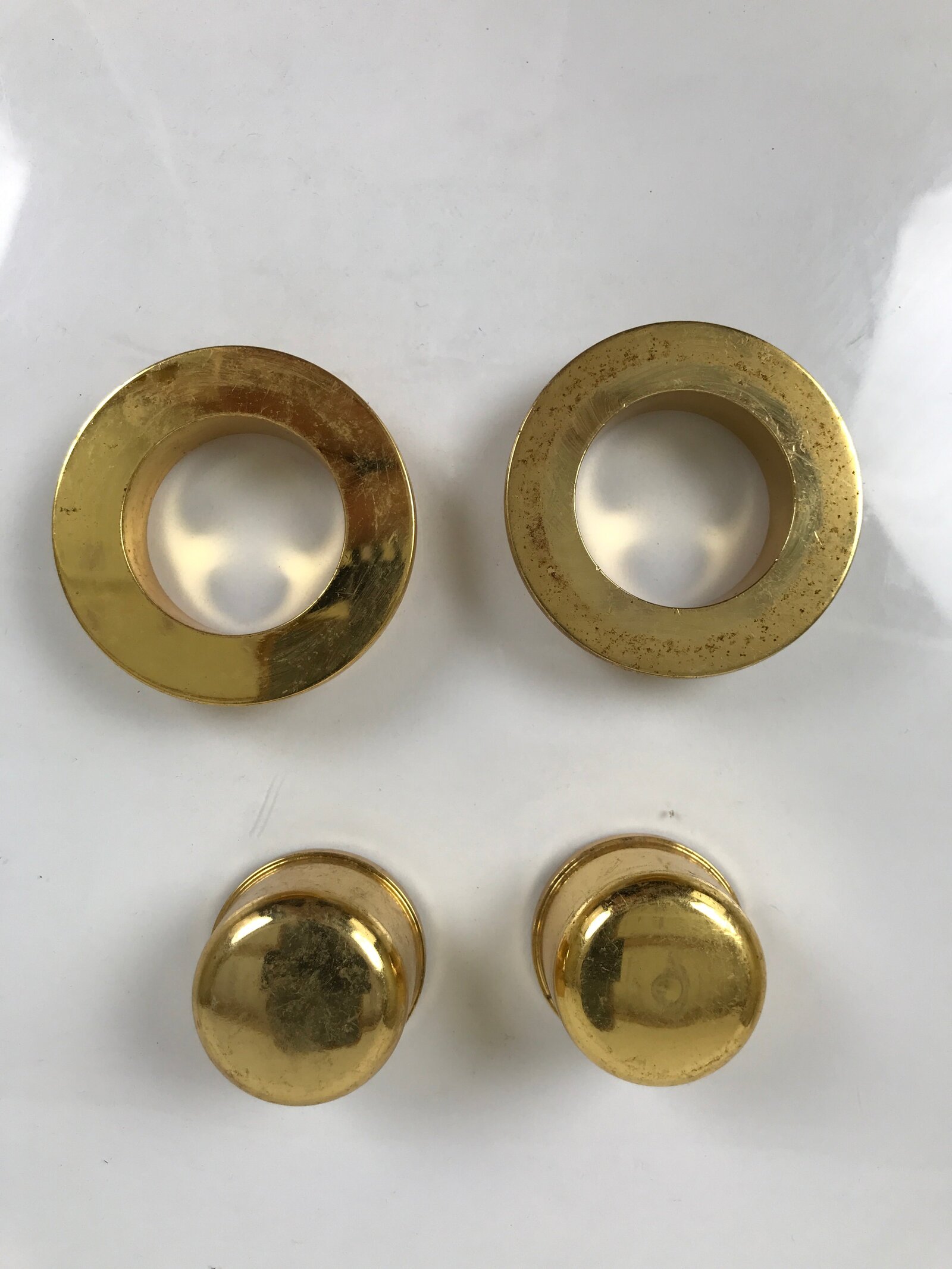 This is a vintage Japanese Buddhist brass hanging lantern, or rinto, made to be hung in Buddhist altars (butsugu). This brass lantern is gold in color and has minimal design detail. This set features small cups with platform stands likely to hold shallow candles. Rinto is a brass lantern used to light up the inside of a Buddhist altar with candles, and can sometimes be made electric. It is also a beautiful decorative item on its own.