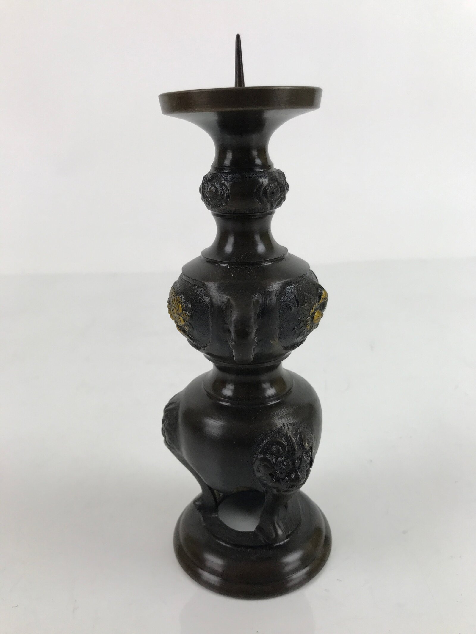 This item is a Japanese vintage Buddhist altar candle holder stand. This bronze metal candlestick is brown and decorated with engraved images of peacocks on the sides and shishi lion heads on the three legs. It has two small handles for decoration. Candlestands or candlesticks are basic Buddhist tools used in most sects and an essential for Buddhist altars (Butsudan).