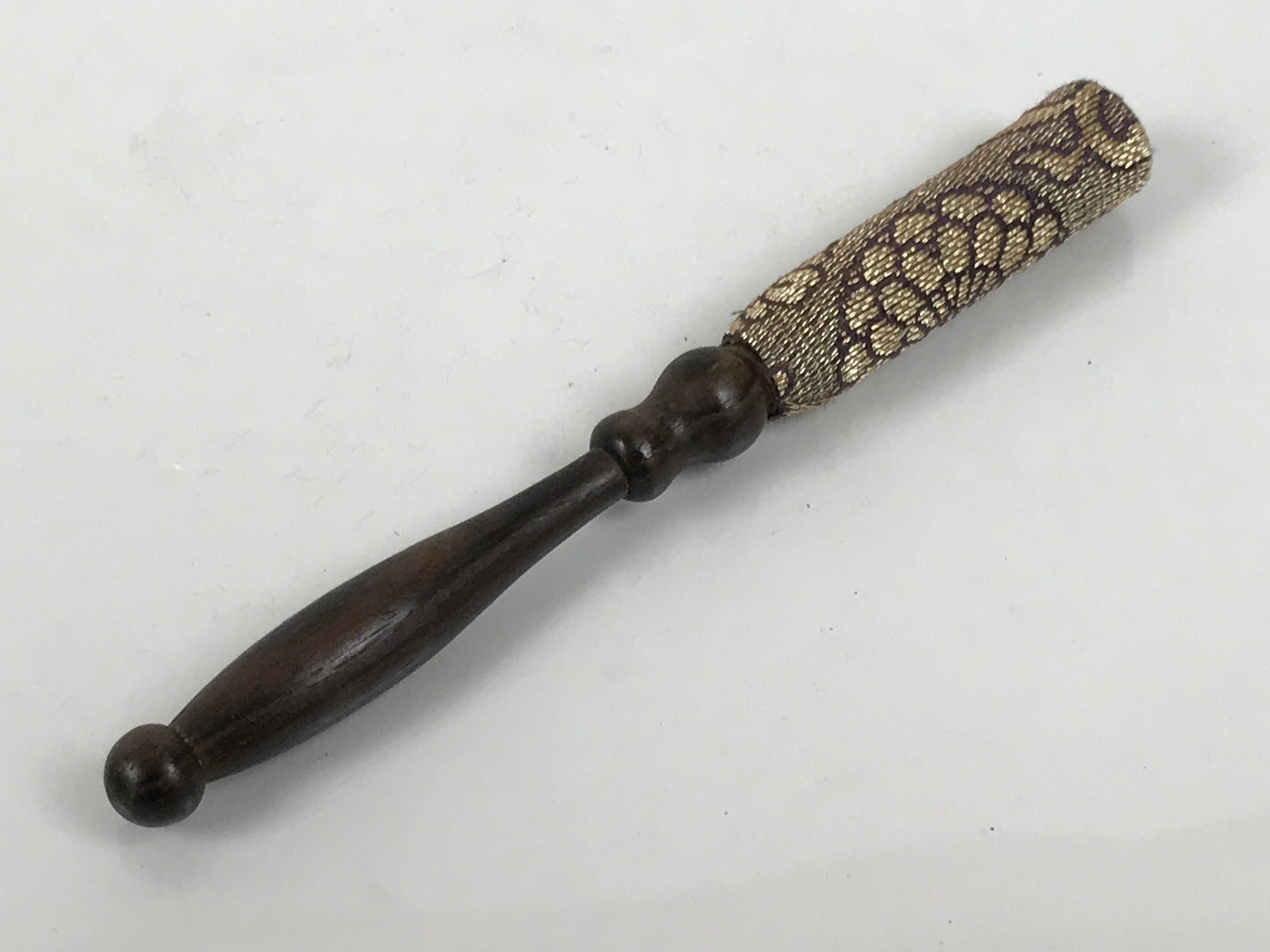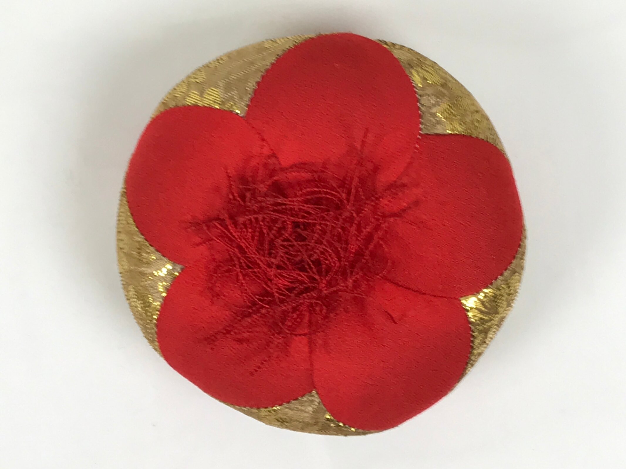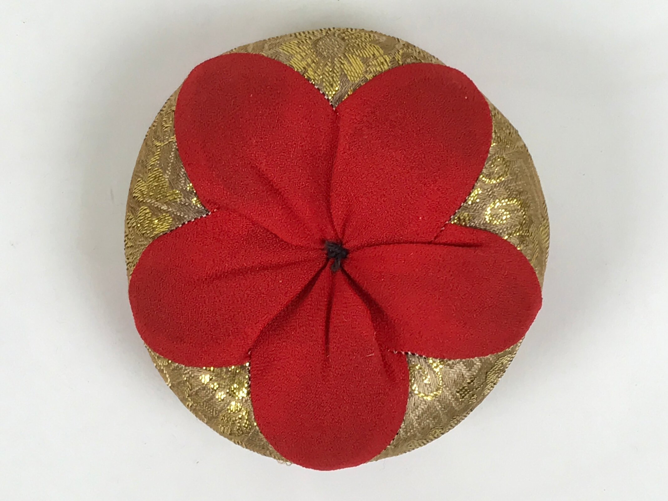 This is a vintage Japanese orin bell for Buddhist altars. It contains a plain bronze bowl with a wooden striker covered in a gold and purple chrysanthemum fabric. It rests on a platform-type pillow made of red and gold fabric with chrysanthemum designs. Singing bowls are sounded during ritual prayer.