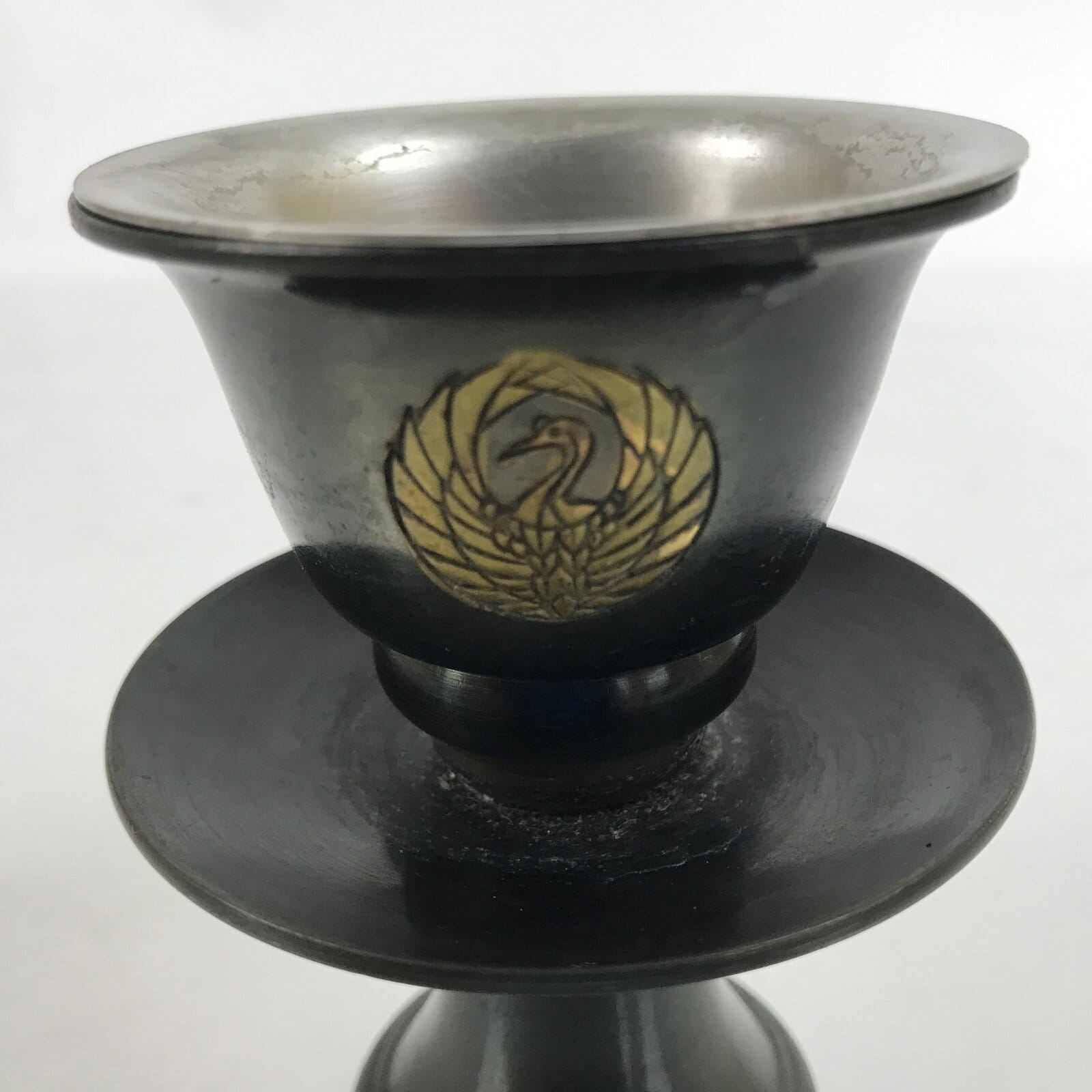 This is a vintage Japanese Buddhist bronze water/tea offering cup (chaki) commonly used in Buddhist altars. It is a unique shape that consists of a bronze platform base, a bronze cup and a cup insert made of metal. There is an engraved gold crane on the front side. The golden crane is the Nichiren Shoshu sect mon symbol. The lid is missing.