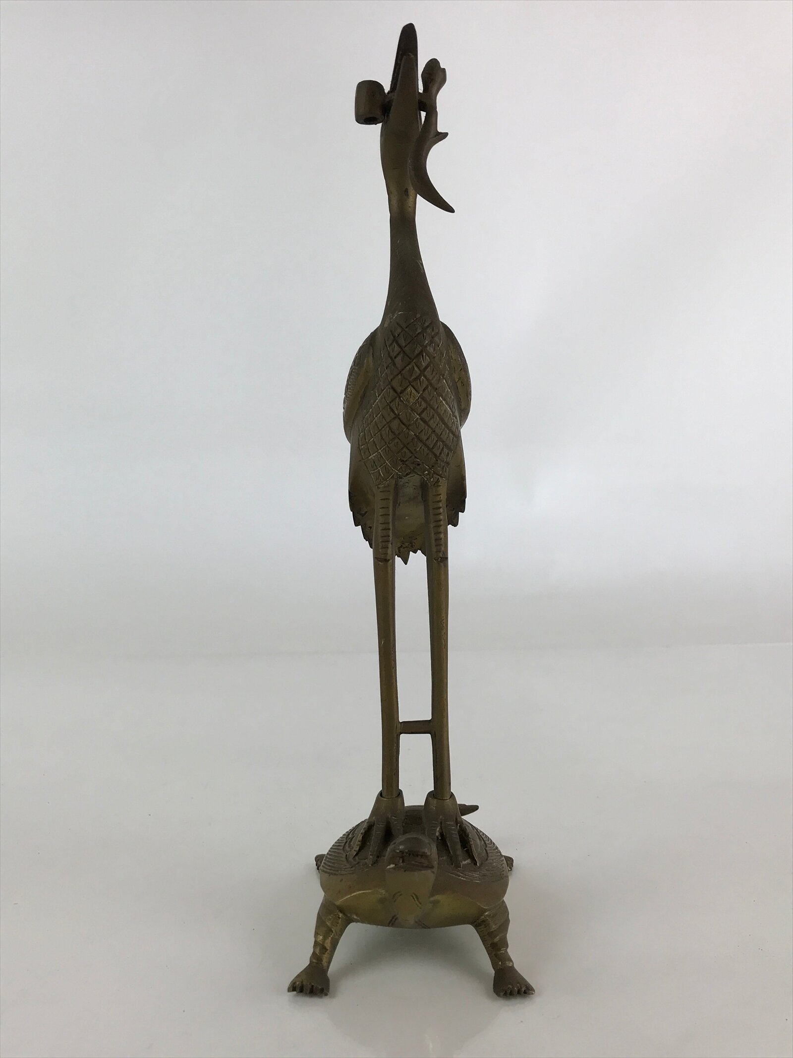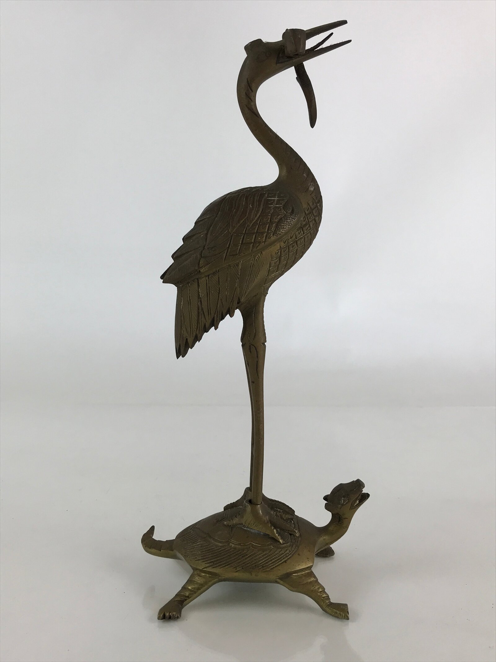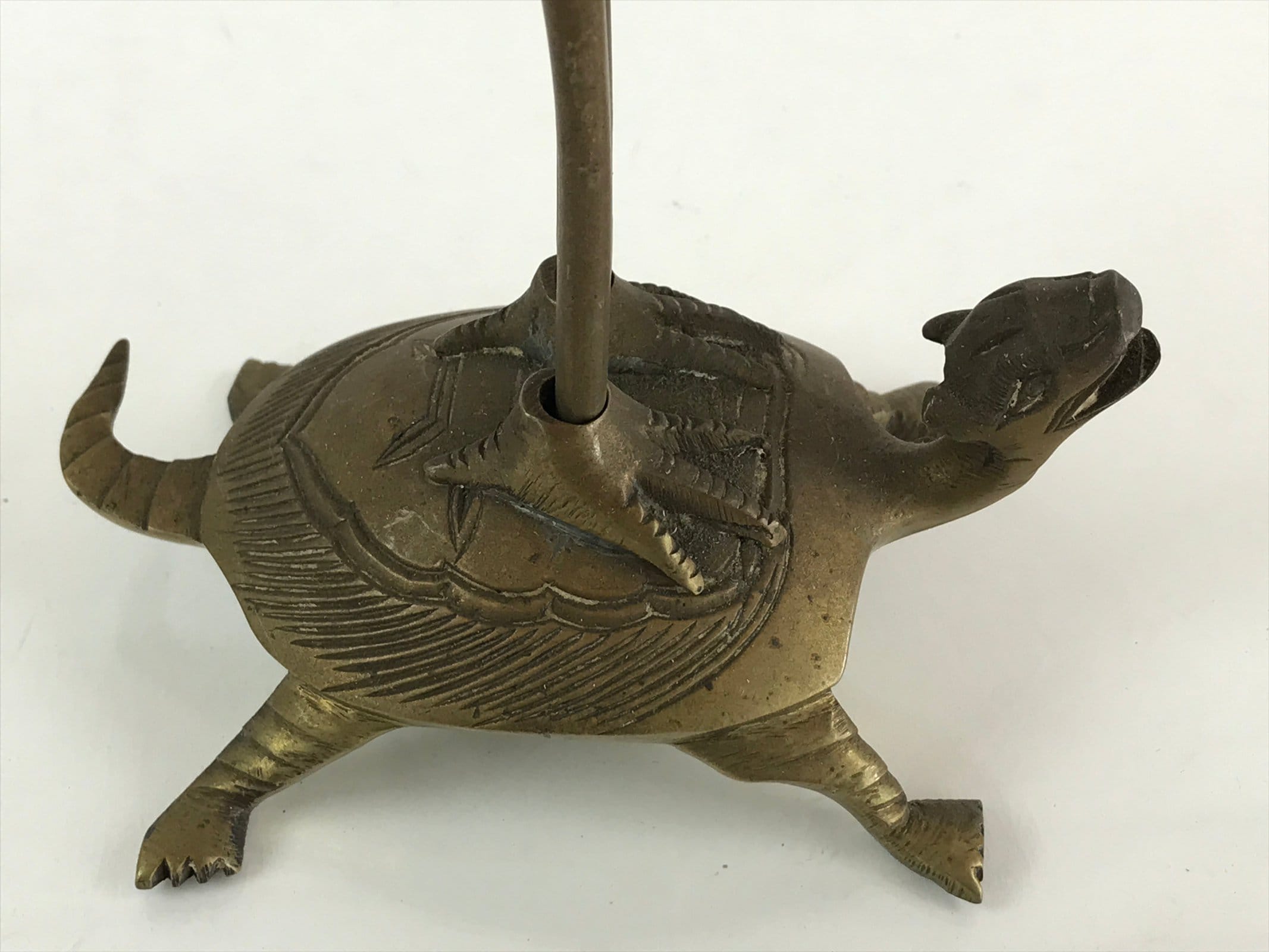 This is a Japanese antique candle holder stand. A stand is designed with a crane on top of a turtle and a crane holds a lotus flower. This is a Buddhist altar fittings.