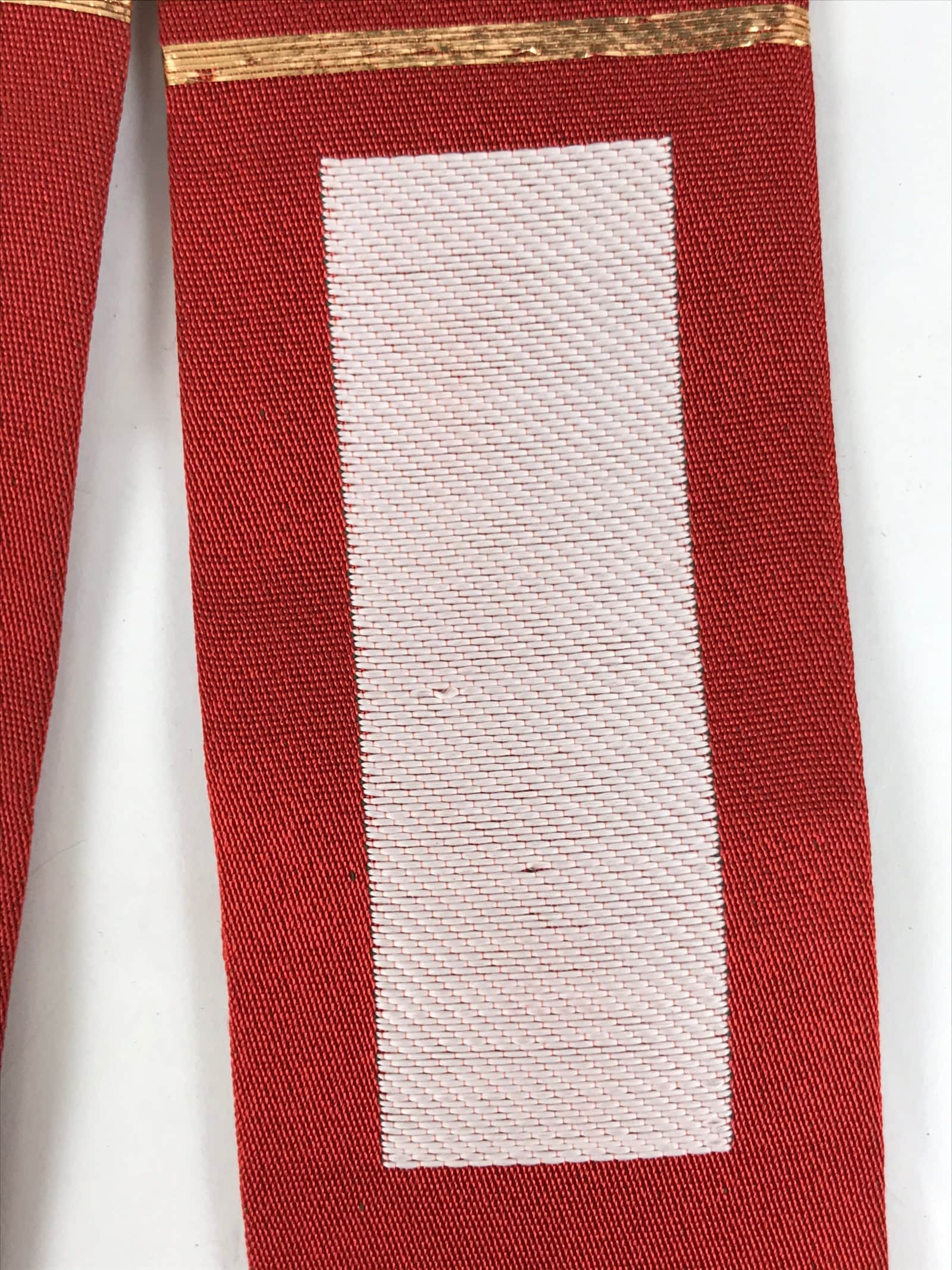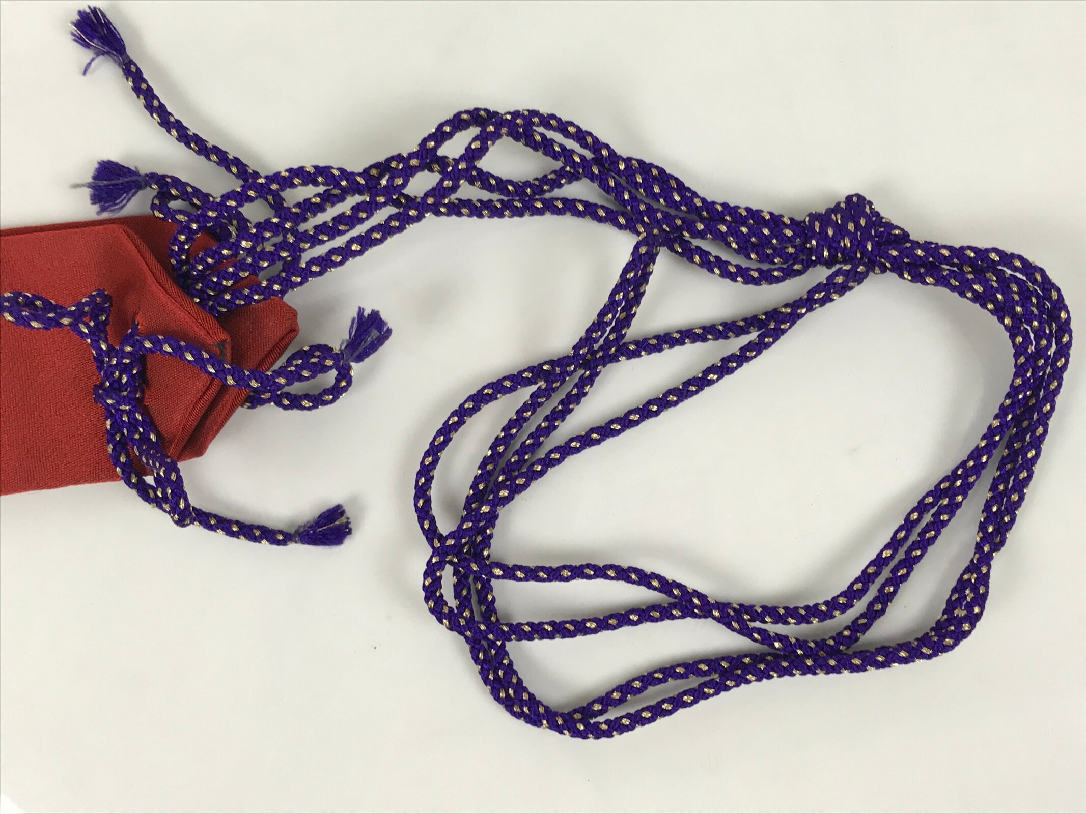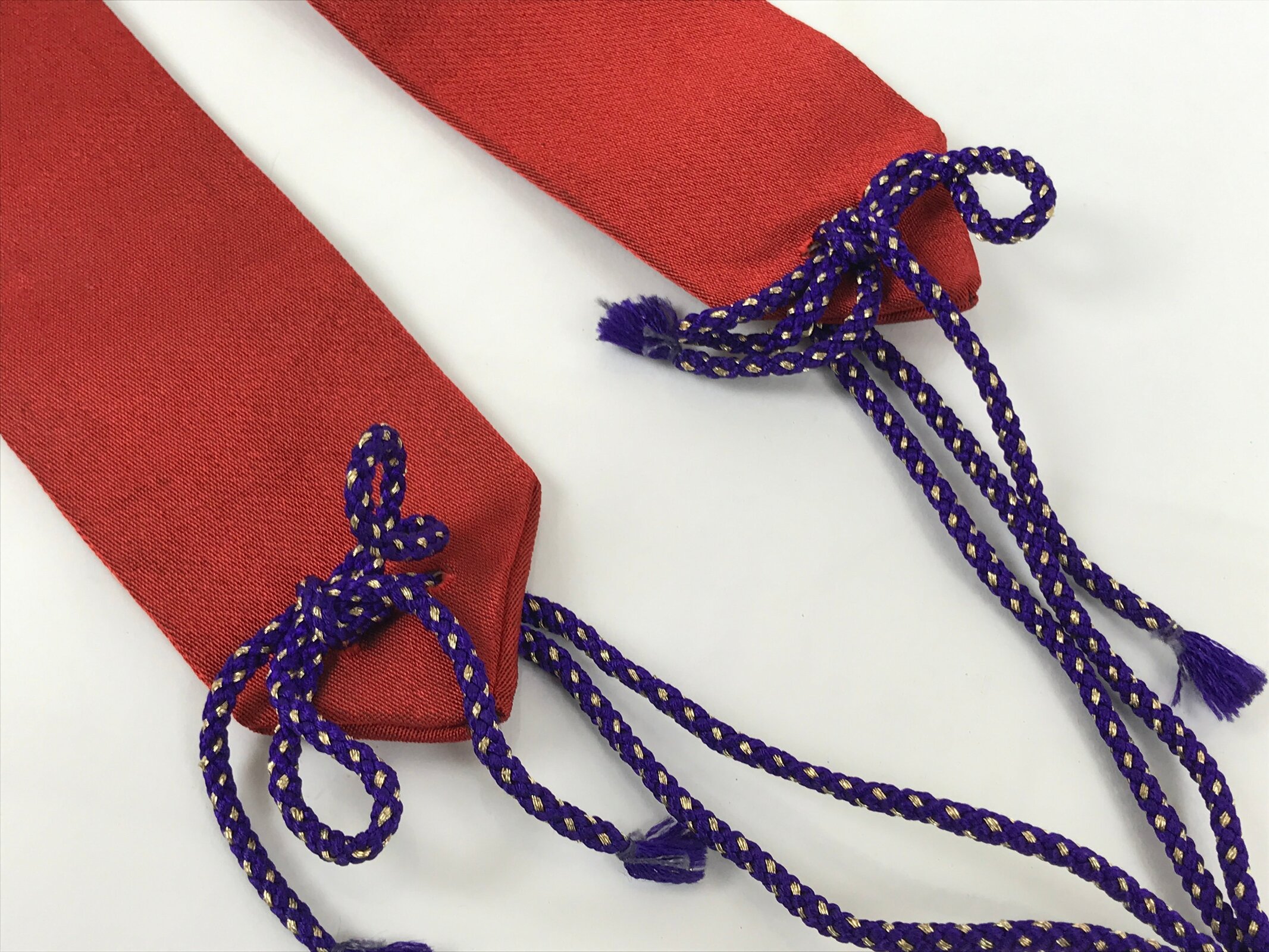 This Japanese Buddhist costume surplice (wagesa or hangesa) is worn around the neck. It is red with two gold stripes on each side and has a purple cord. There is a floral kamon (crest) on both sides close to the neck part. This particular sash is called kataginu and can be worn when appearing in front of the Buddha, and during services and ceremonies.