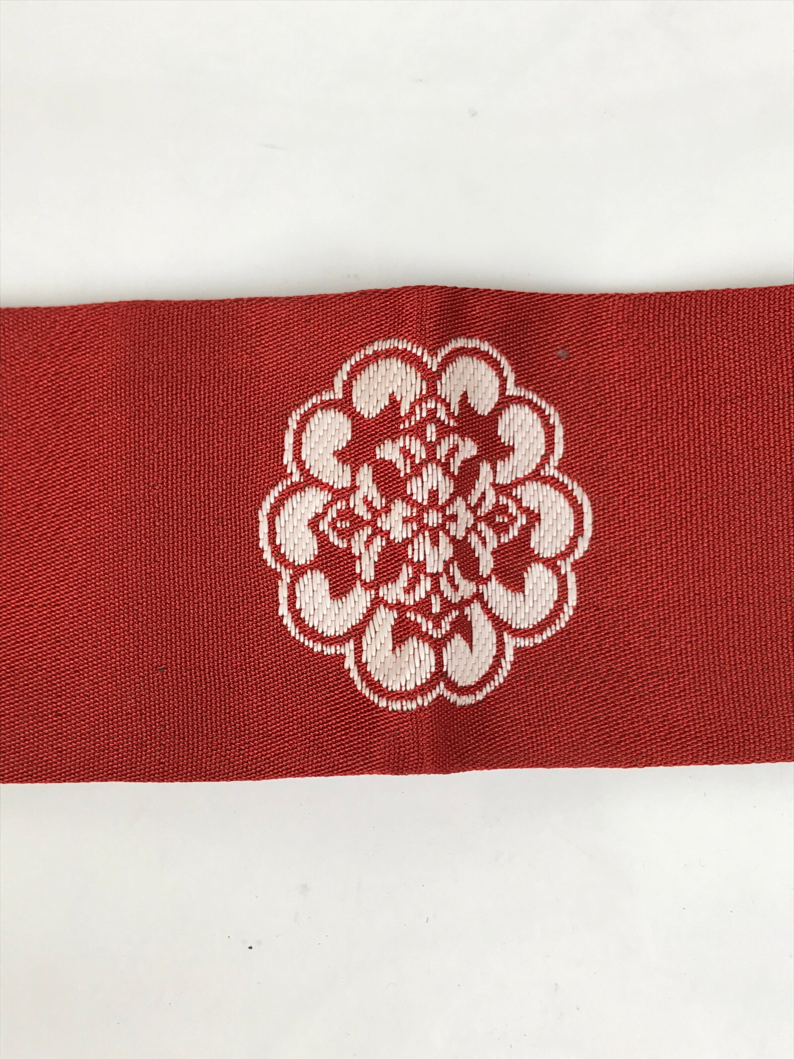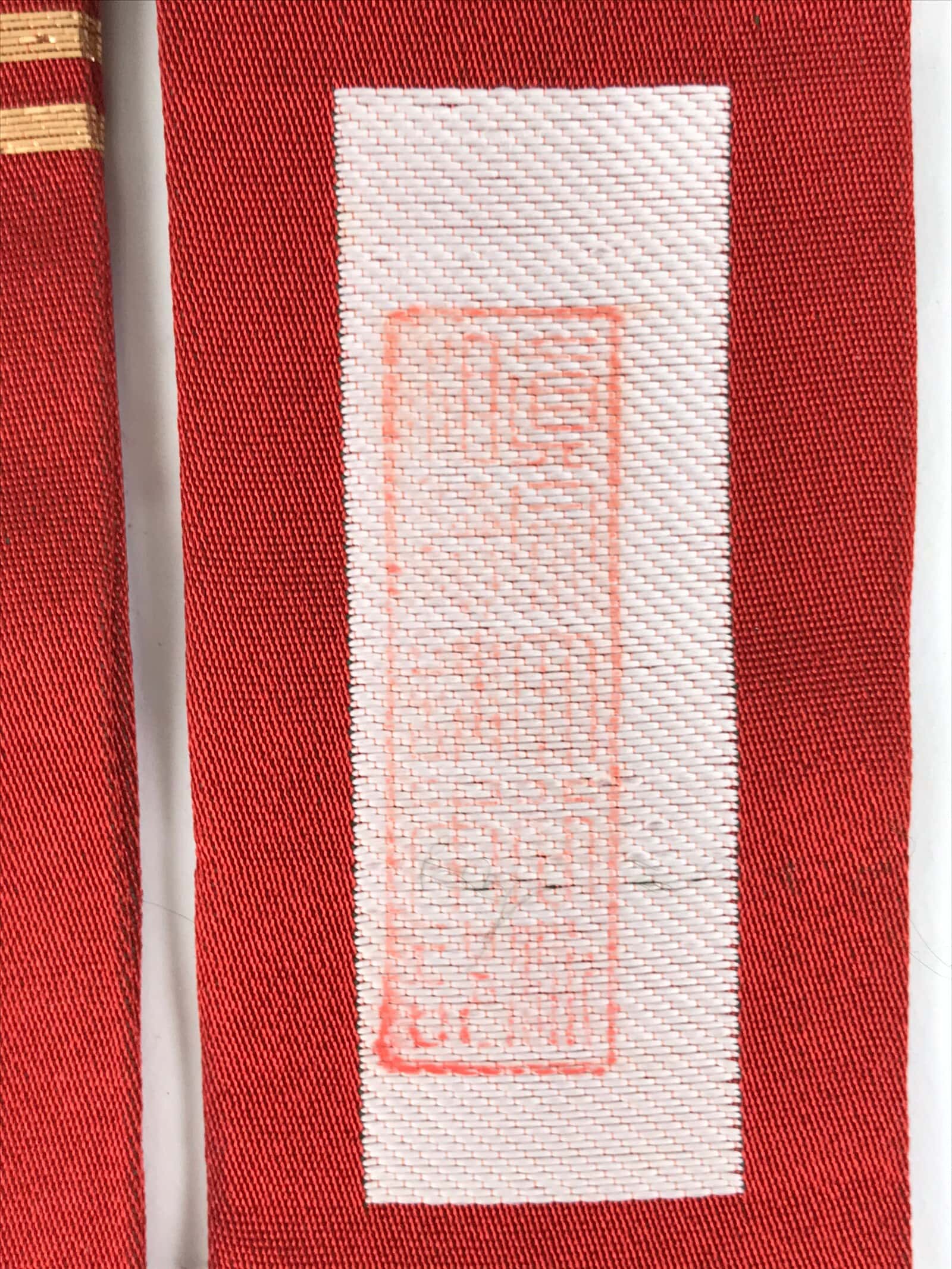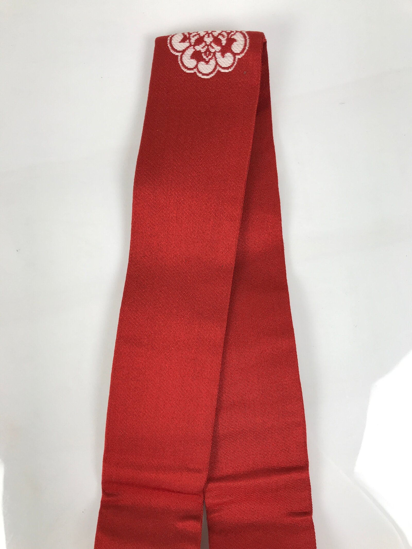 This Japanese Buddhist costume surplice (wagesa or hangesa) is worn around the neck. It is red with two gold stripes on each side and has a purple cord. There is a floral kamon (crest) on both sides close to the neck part. This particular sash is called kataginu and can be worn when appearing in front of the Buddha, and during services and ceremonies.