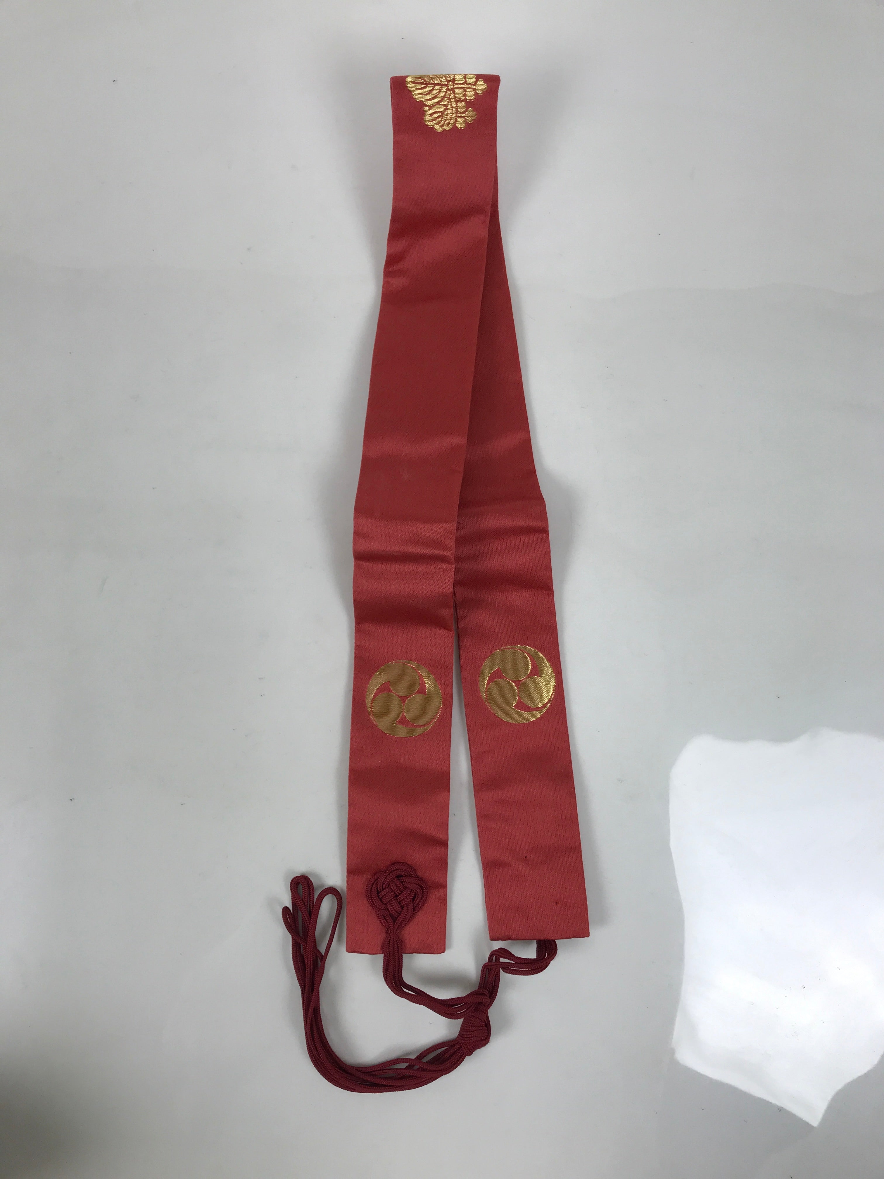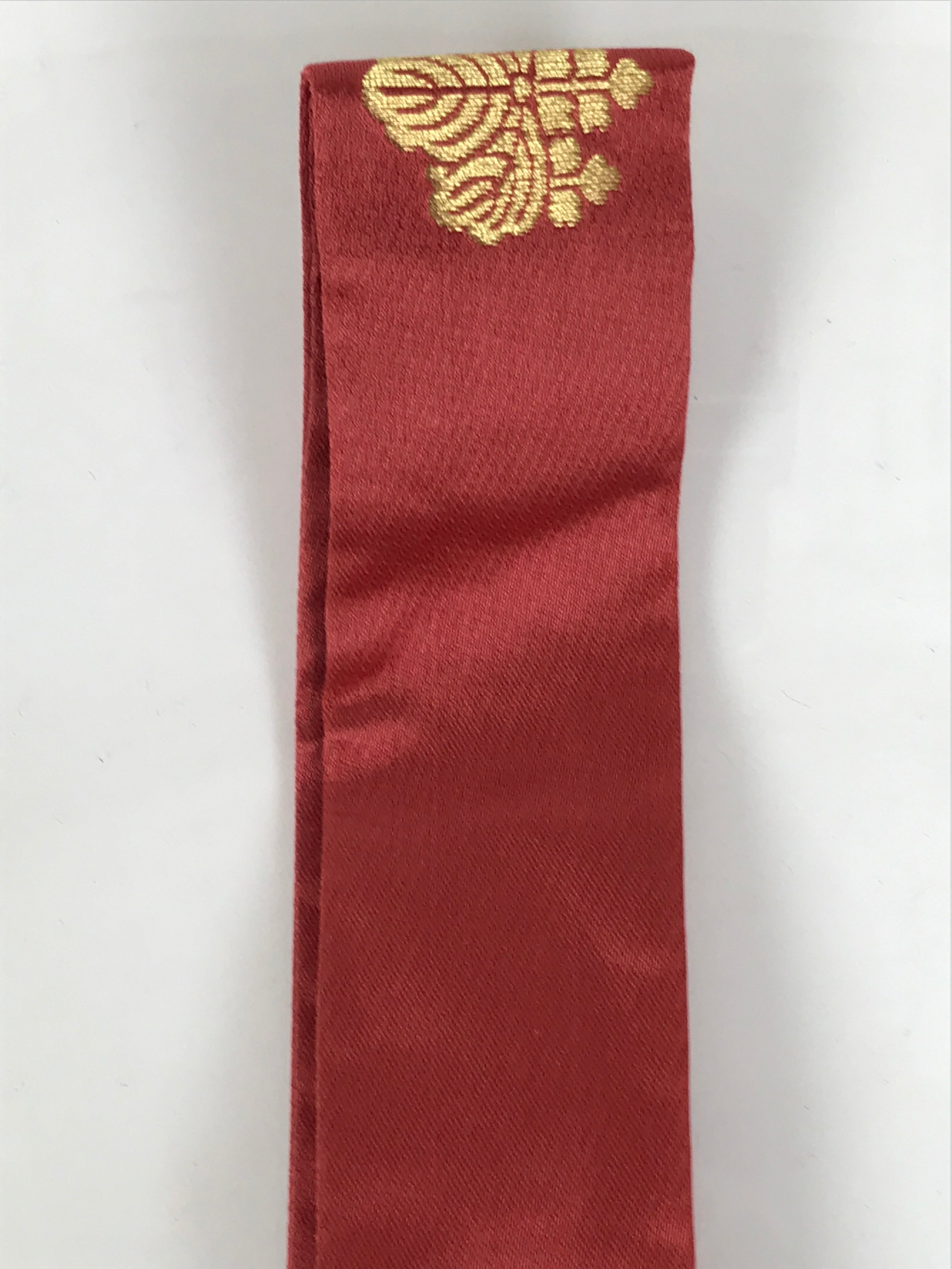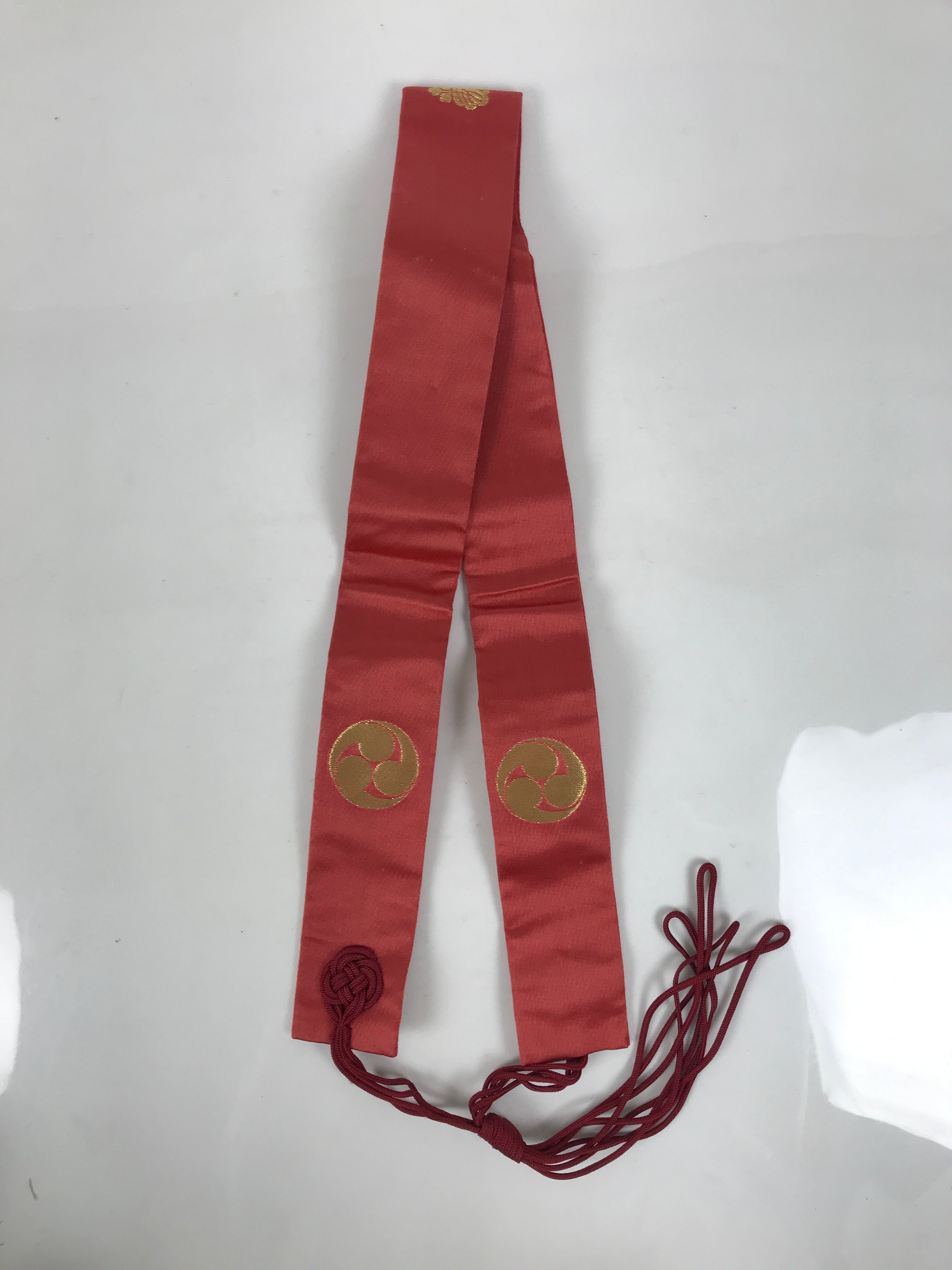 This Japanese Buddhist costume surplice (wagesa or hangesa) is worn around the neck. It is muted red with golden crests and has a red cord. There is a floral kamon (crest) at the back of the neck and 2 kamon on both sides close to the neck part. This particular sash is called kataginu and can be worn when appearing in front of the Buddha, and during services and ceremonies.