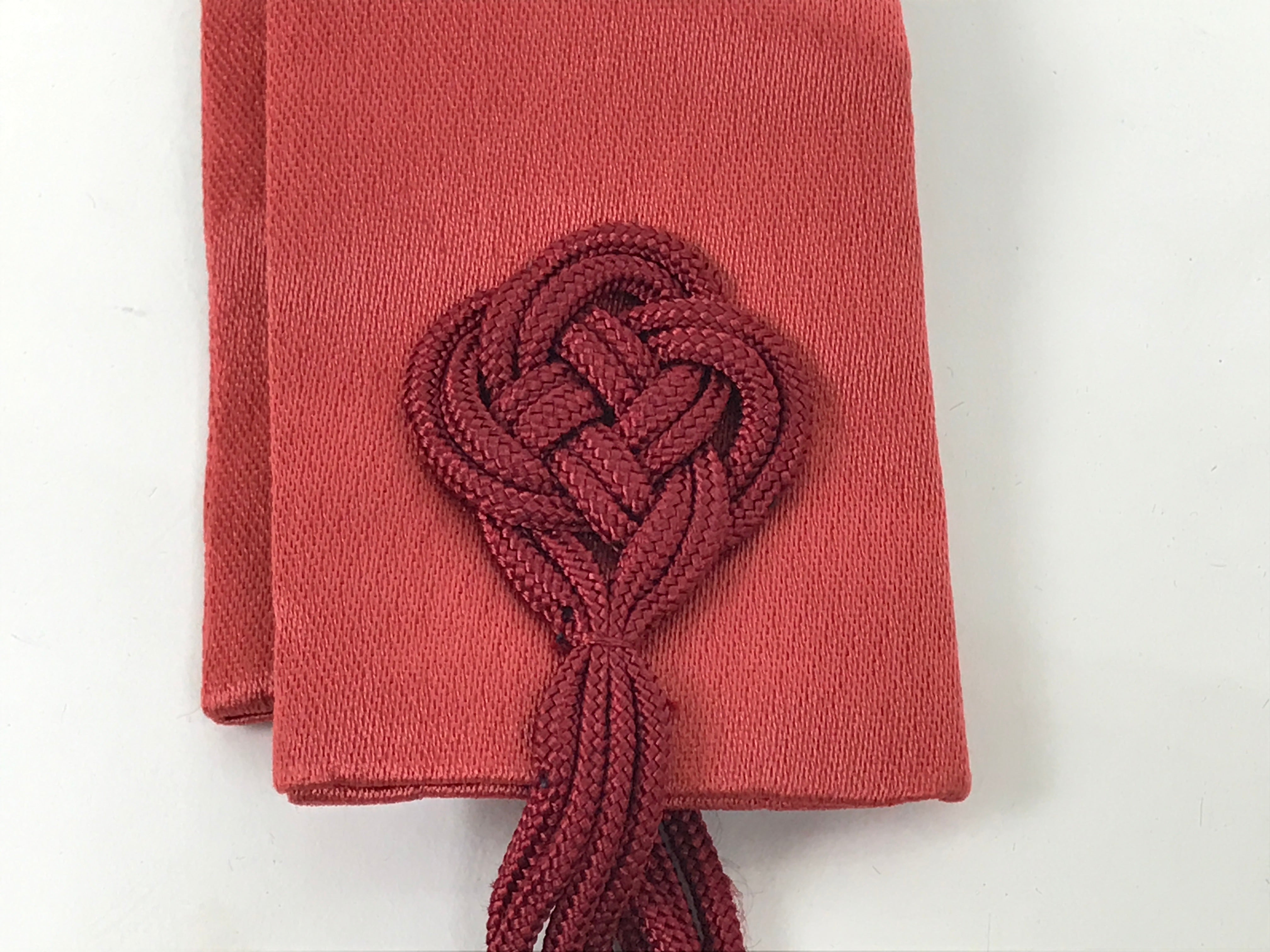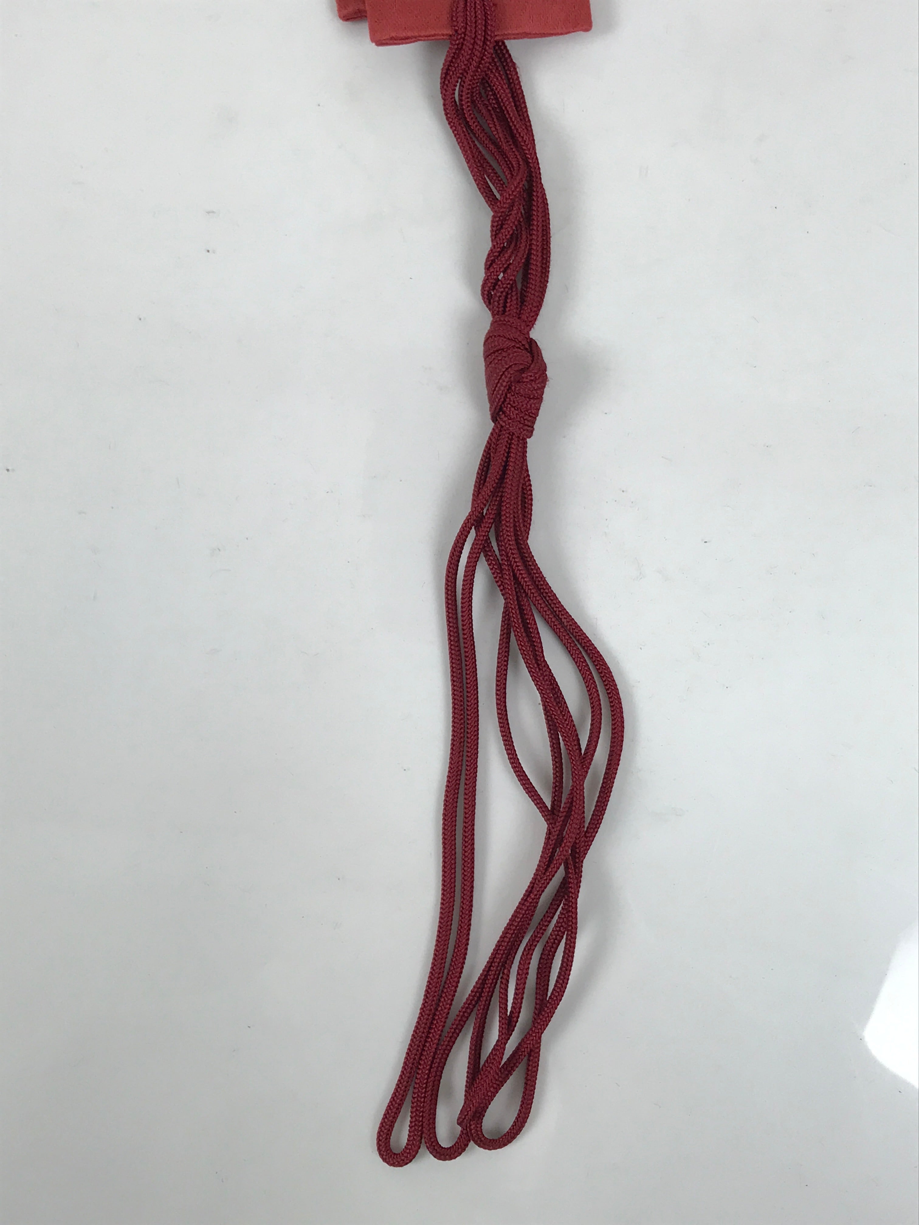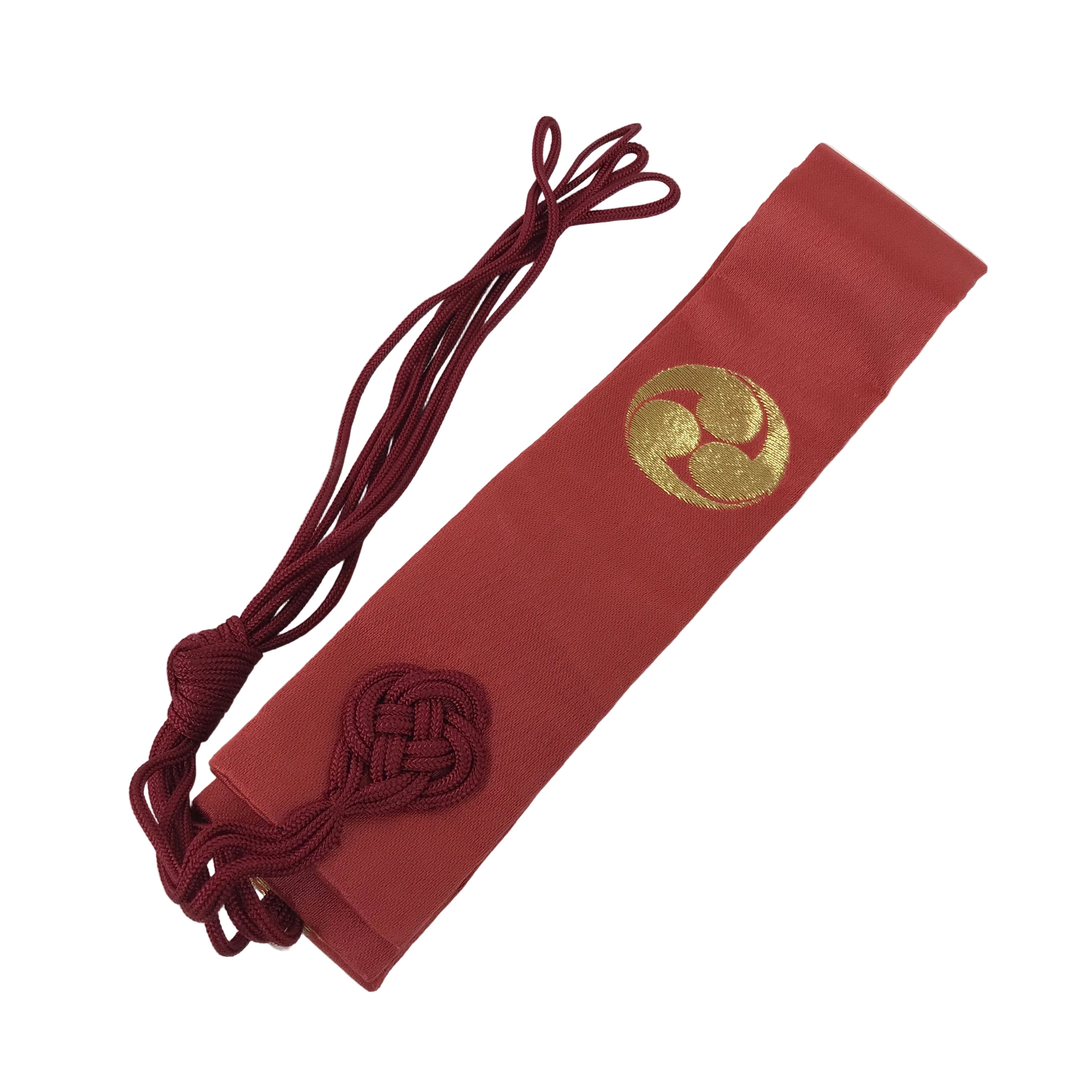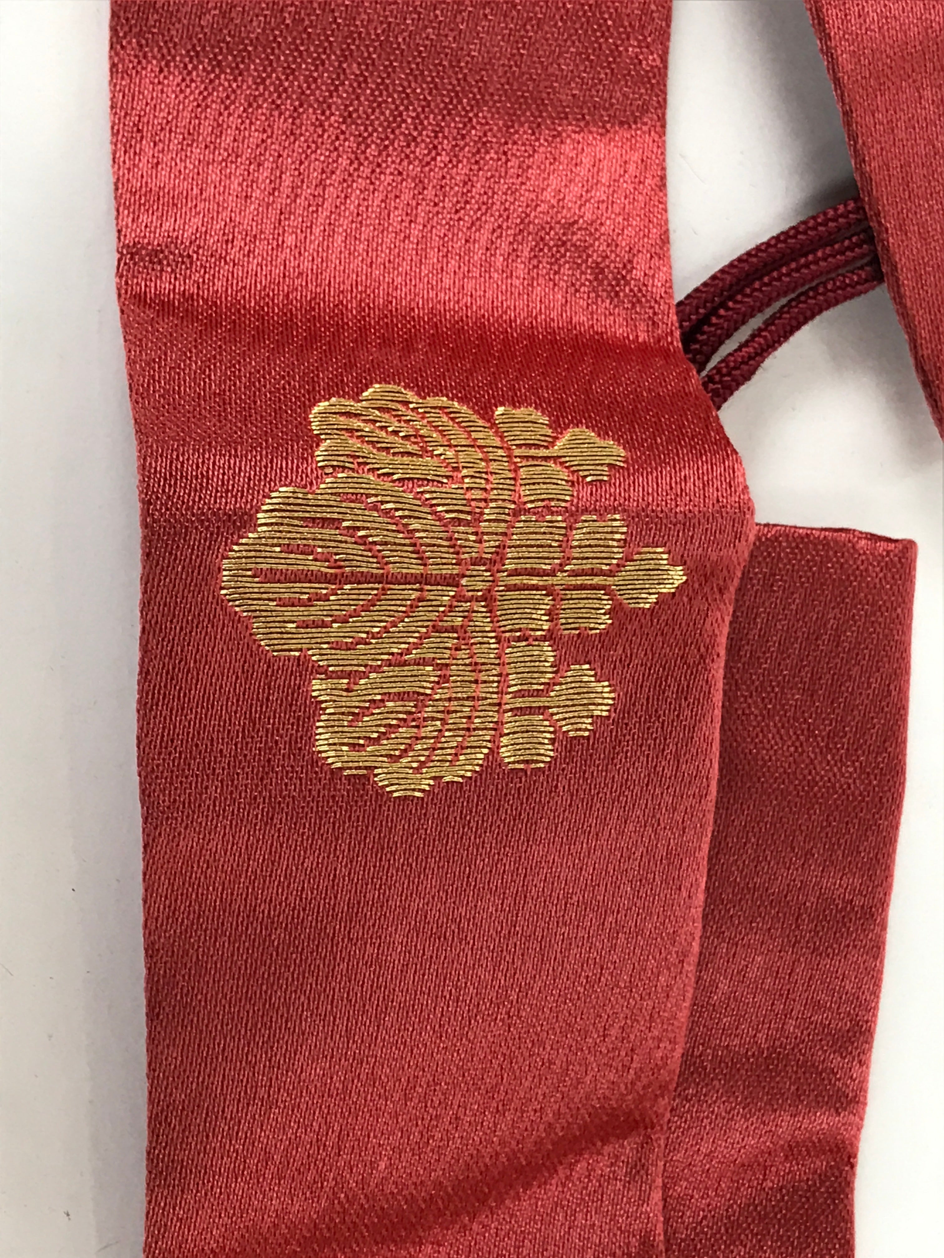 This Japanese Buddhist costume surplice (wagesa or hangesa) is worn around the neck. It is muted red with golden crests and has a red cord. There is a floral kamon (crest) at the back of the neck and 2 kamon on both sides close to the neck part. This particular sash is called kataginu and can be worn when appearing in front of the Buddha, and during services and ceremonies.