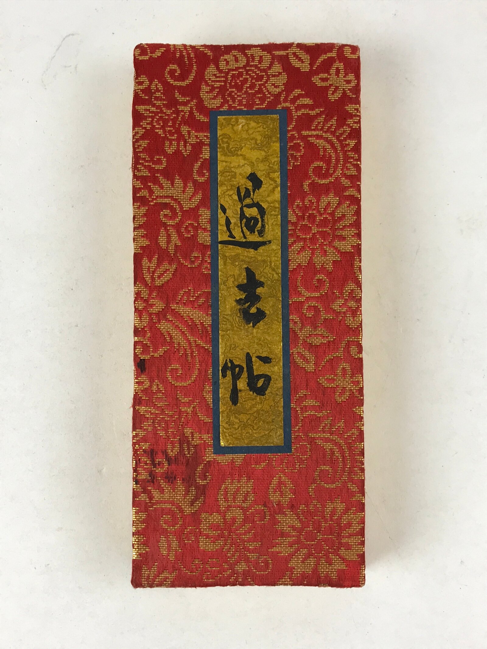 This is a vintage Japanese Buddhist death register or Kakocho. It has a red and gold silk cover. The title and the inside of the register are hand-written in black ink.