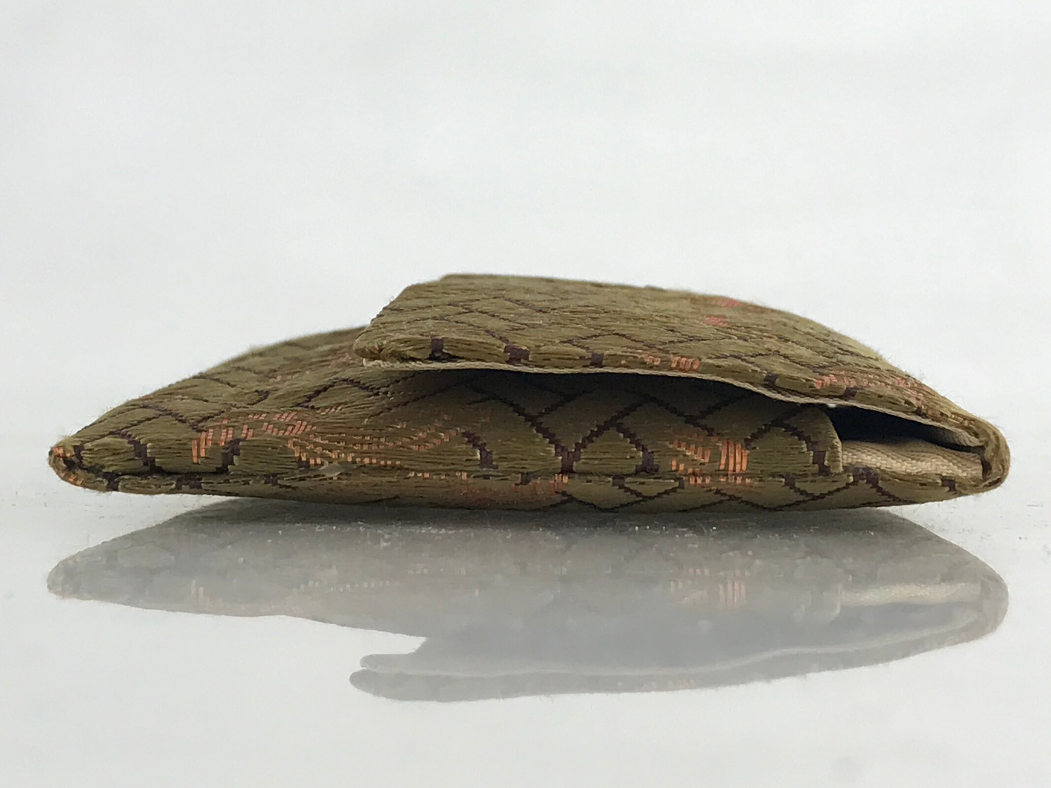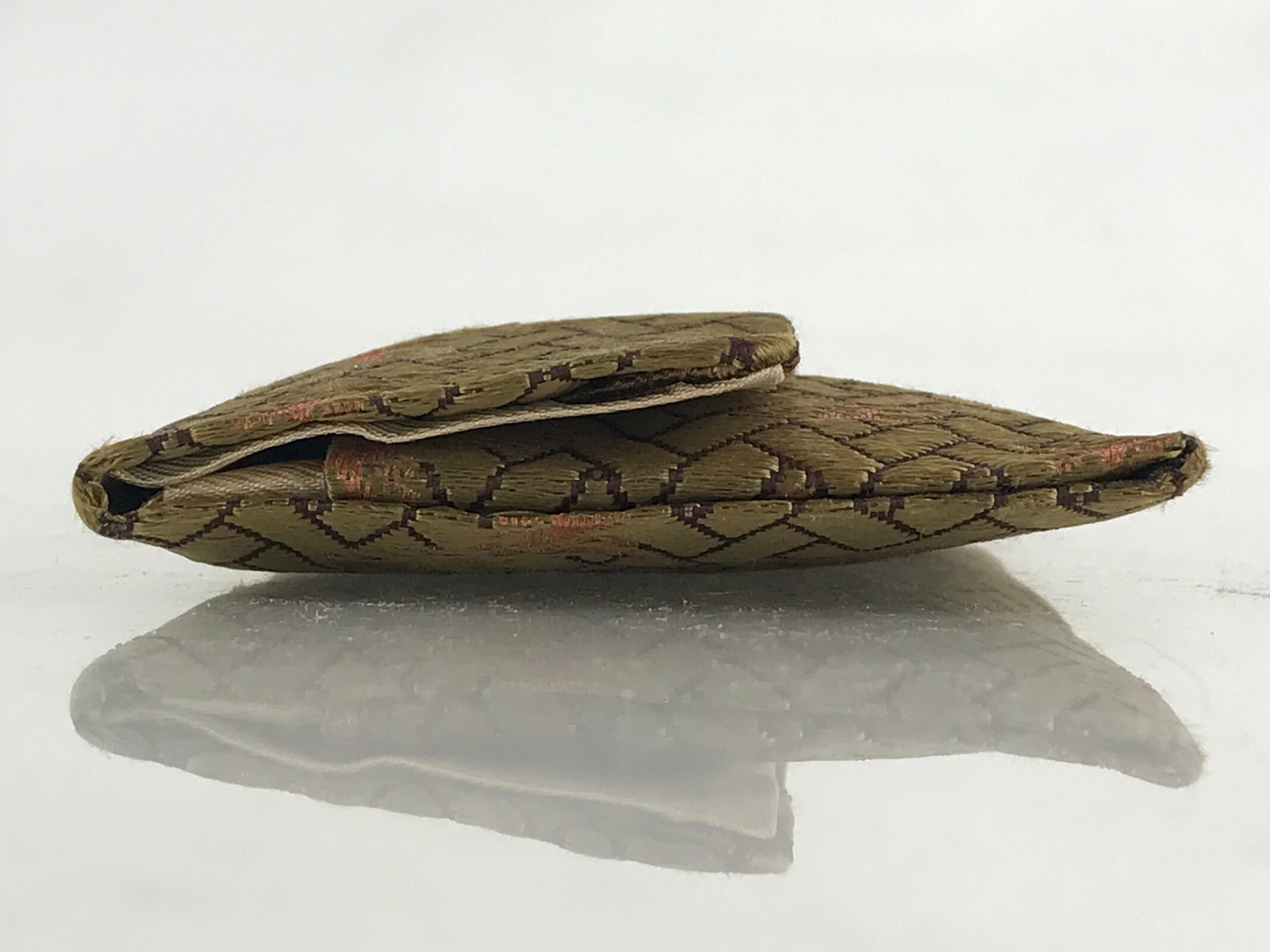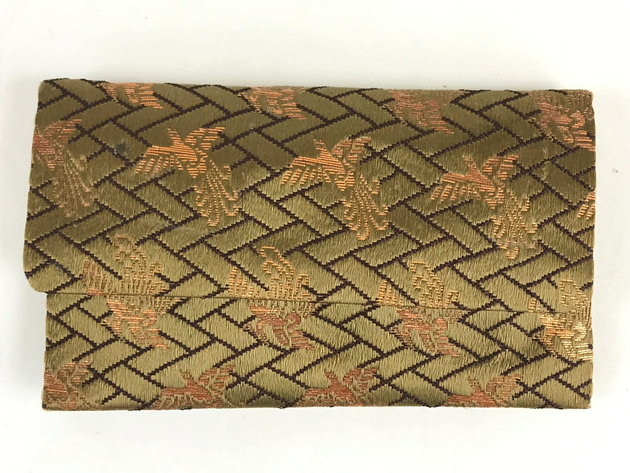 This is a Japanese vintage fabric prayer beads Juzu bag, Jyuzu-Bukuro. It is used to carry rosary beads used in memorial services such as funerals. It is a Nishijin-Ori bag woven with a phoenix pattern with green and gold thread.