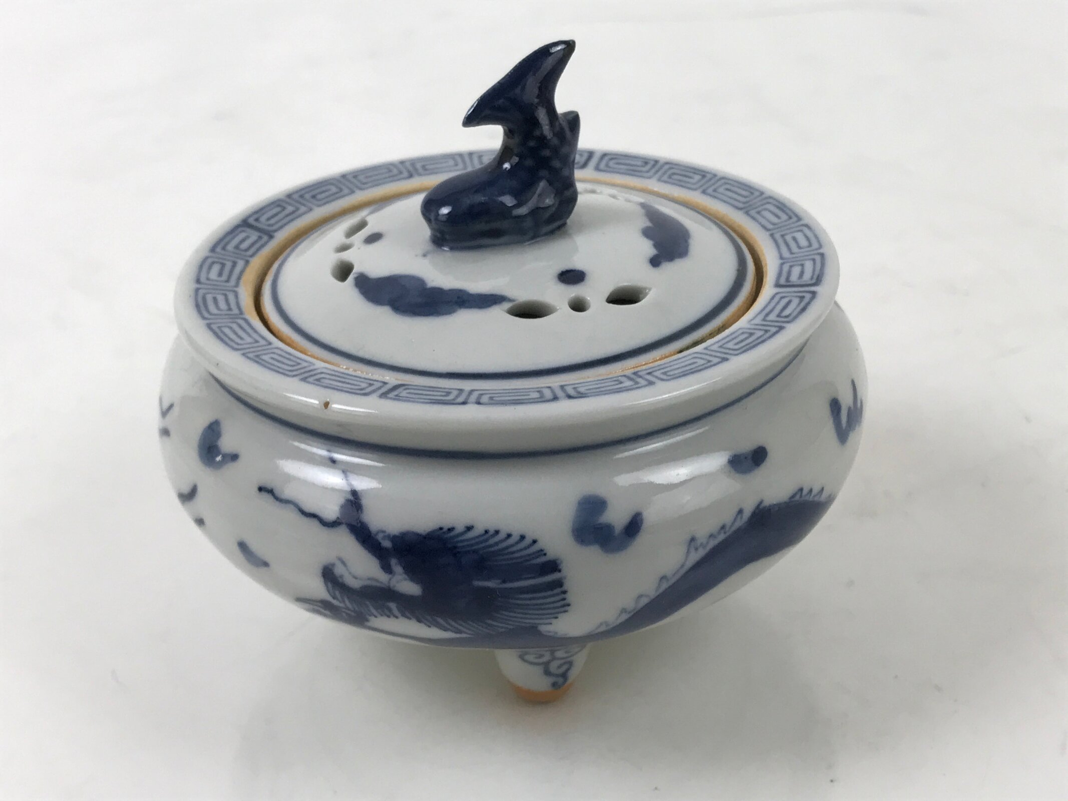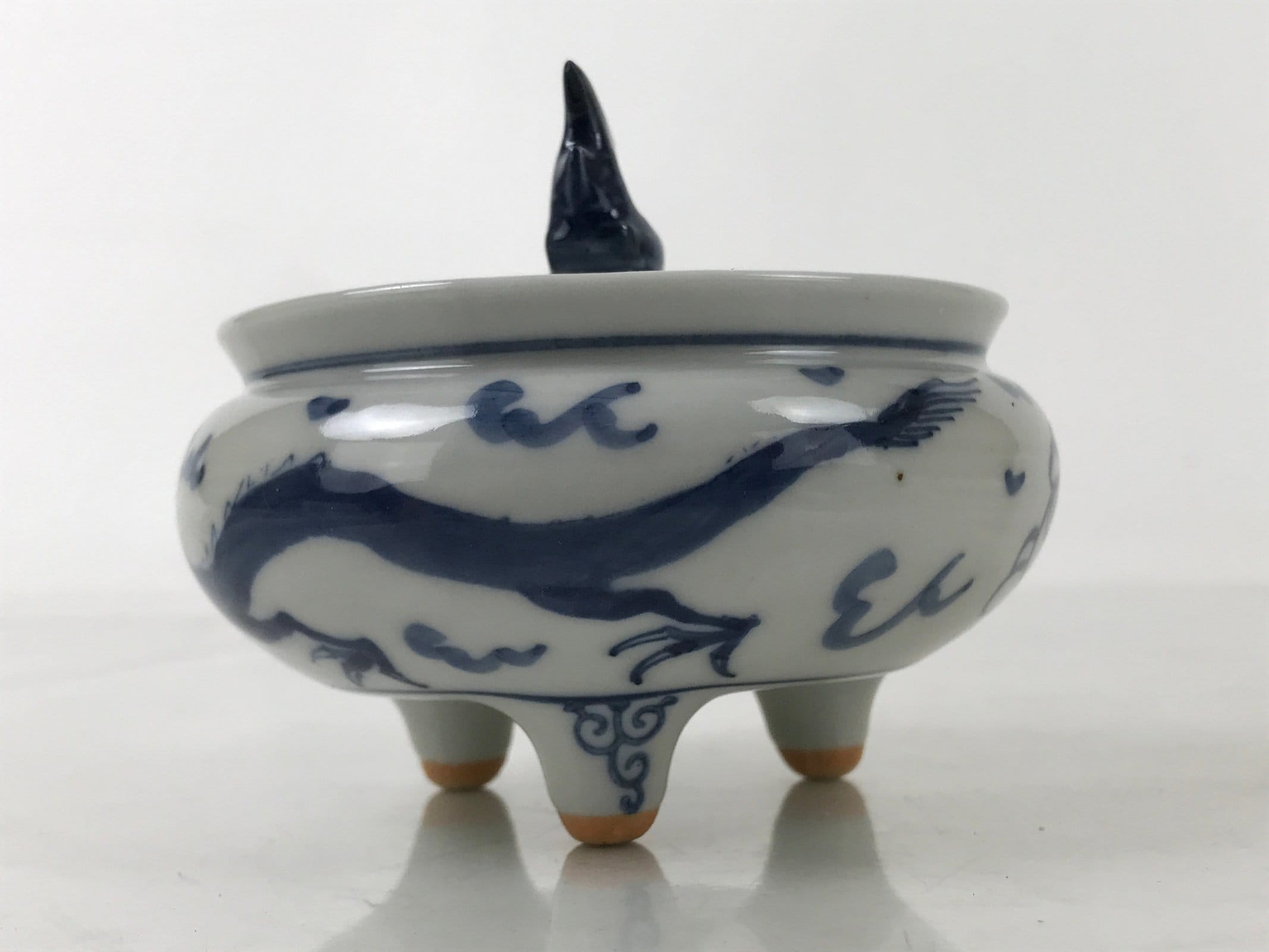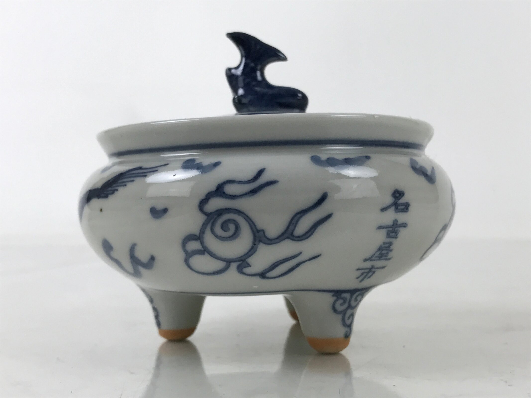 It is short, round, and made of fine Kutani porcelain. This koro features a sometsuke (blue and white) design of a dragon and has a Chinese-style top border. The lid has a shachihoko finial. Shachi are folk creatures with the head of a dragon and the body of a carp. This image is commonly seen in the form of statues at the tops of old buildings and are thought to be protectors against fire. Shachi are particularly famous in Nagoya.