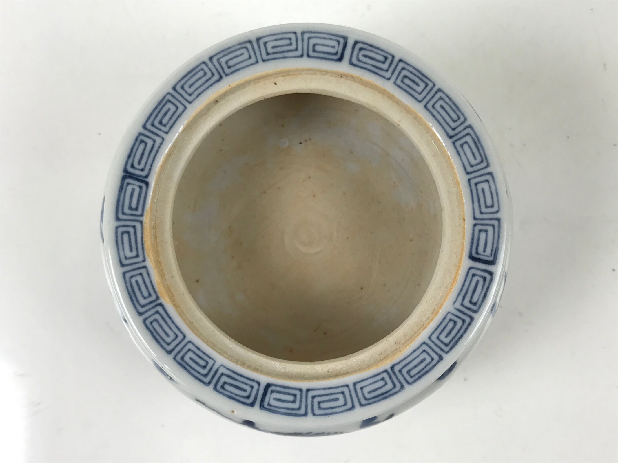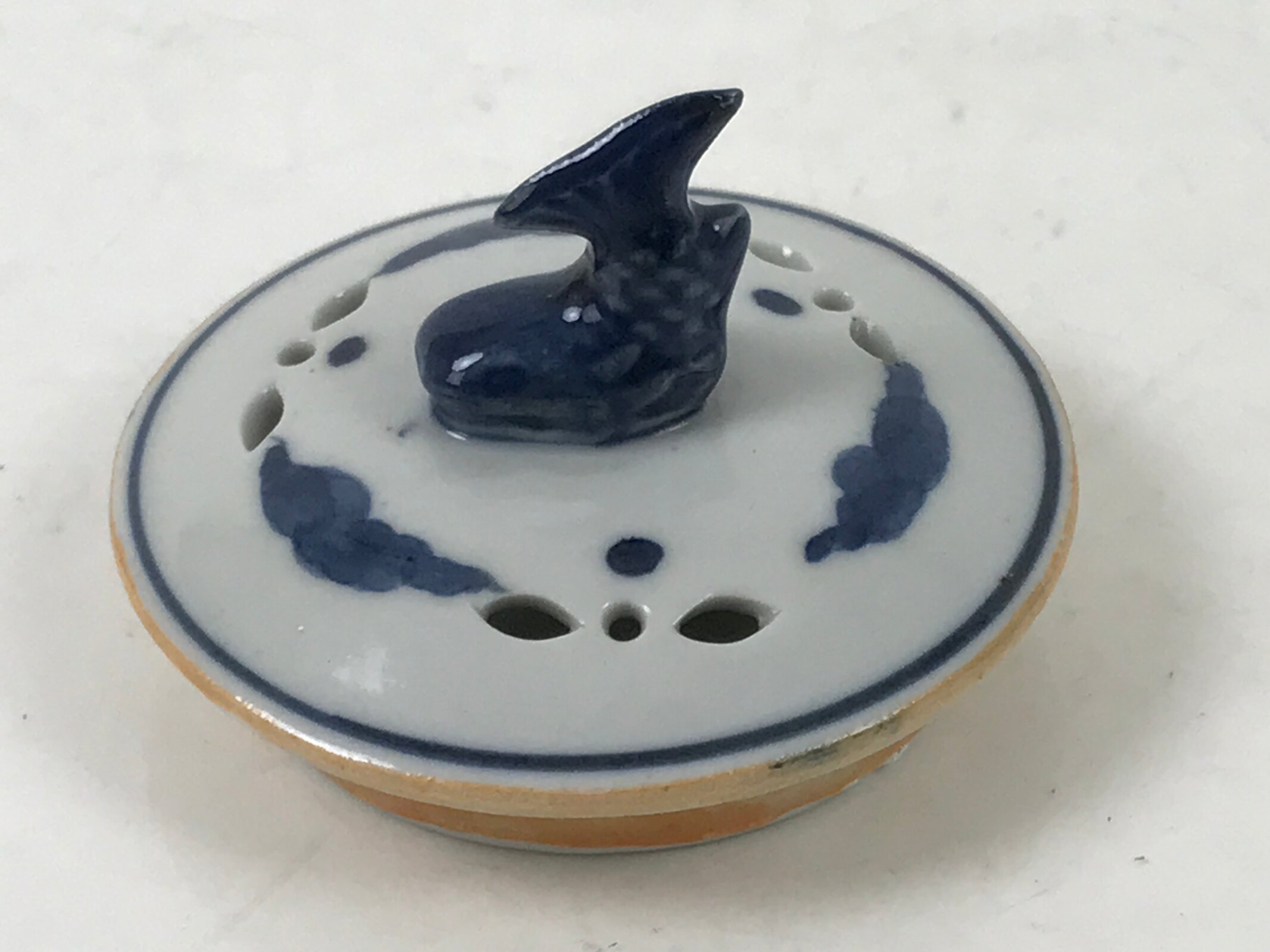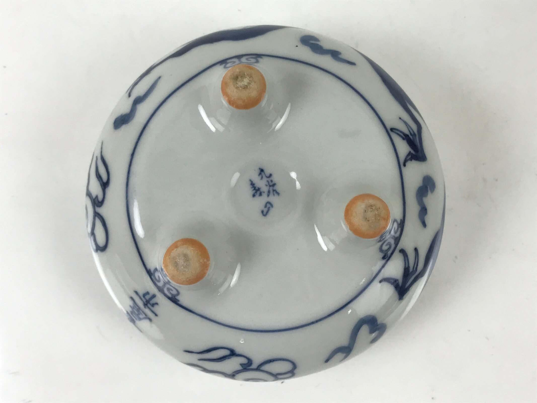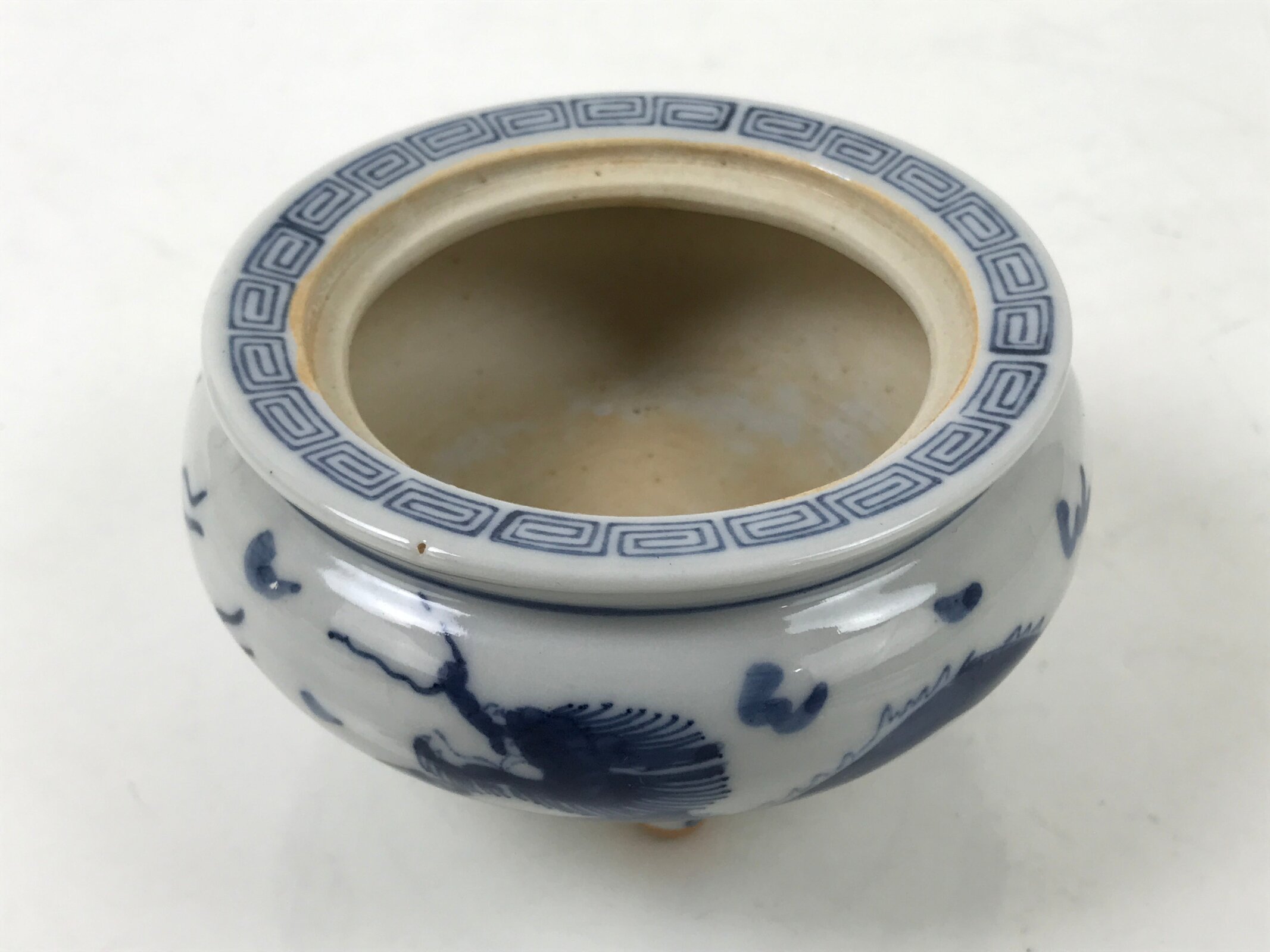 It is short, round, and made of fine Kutani porcelain. This koro features a sometsuke (blue and white) design of a dragon and has a Chinese-style top border. The lid has a shachihoko finial. Shachi are folk creatures with the head of a dragon and the body of a carp. This image is commonly seen in the form of statues at the tops of old buildings and are thought to be protectors against fire. Shachi are particularly famous in Nagoya.