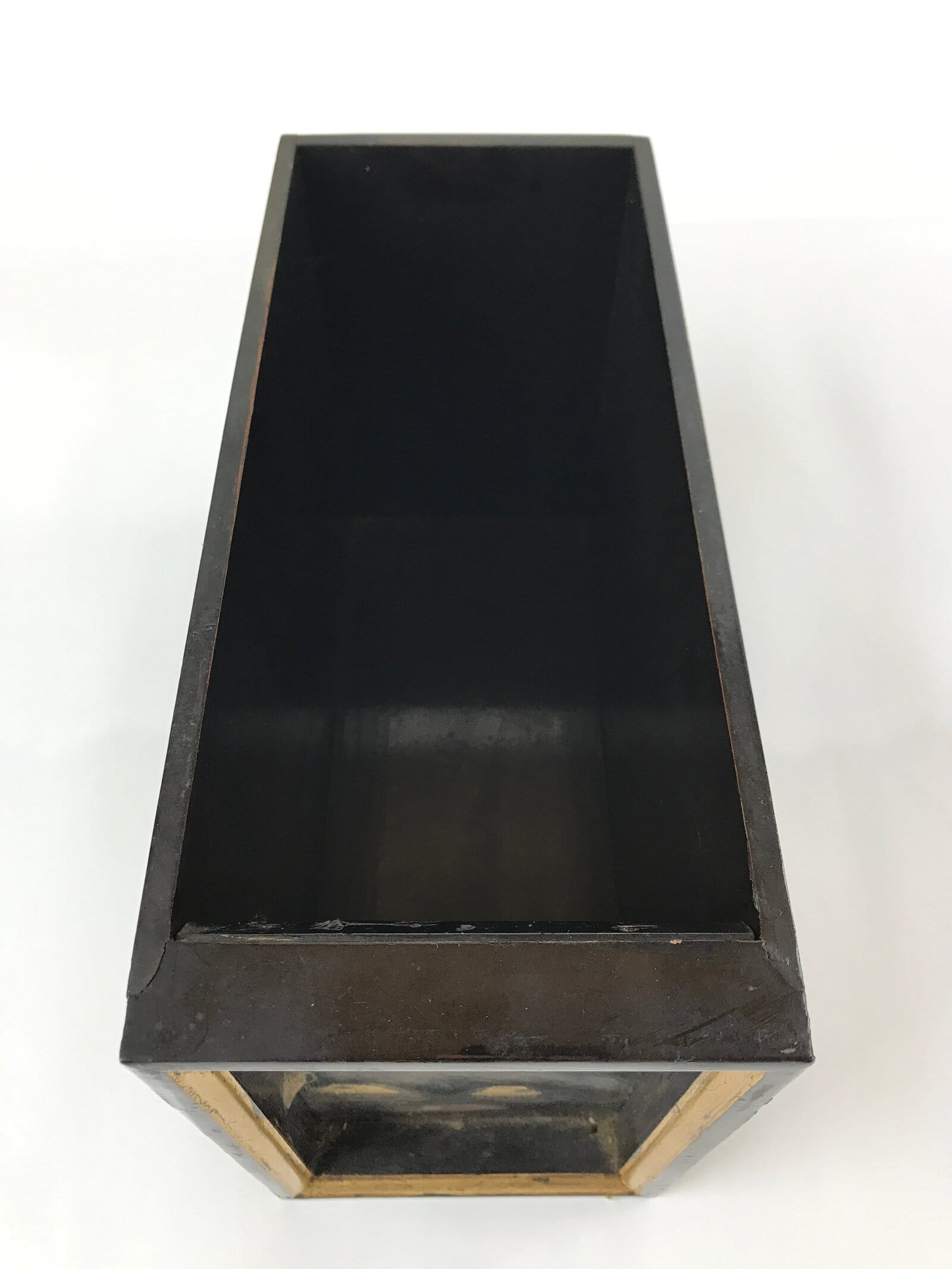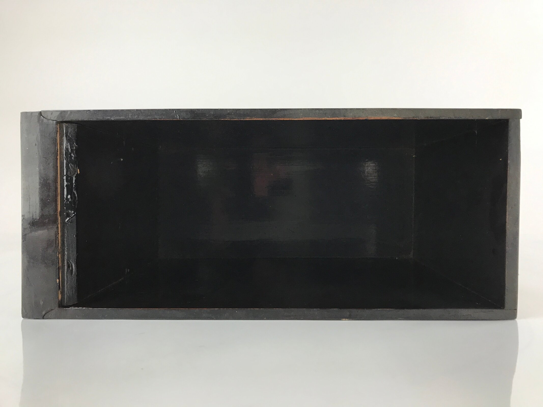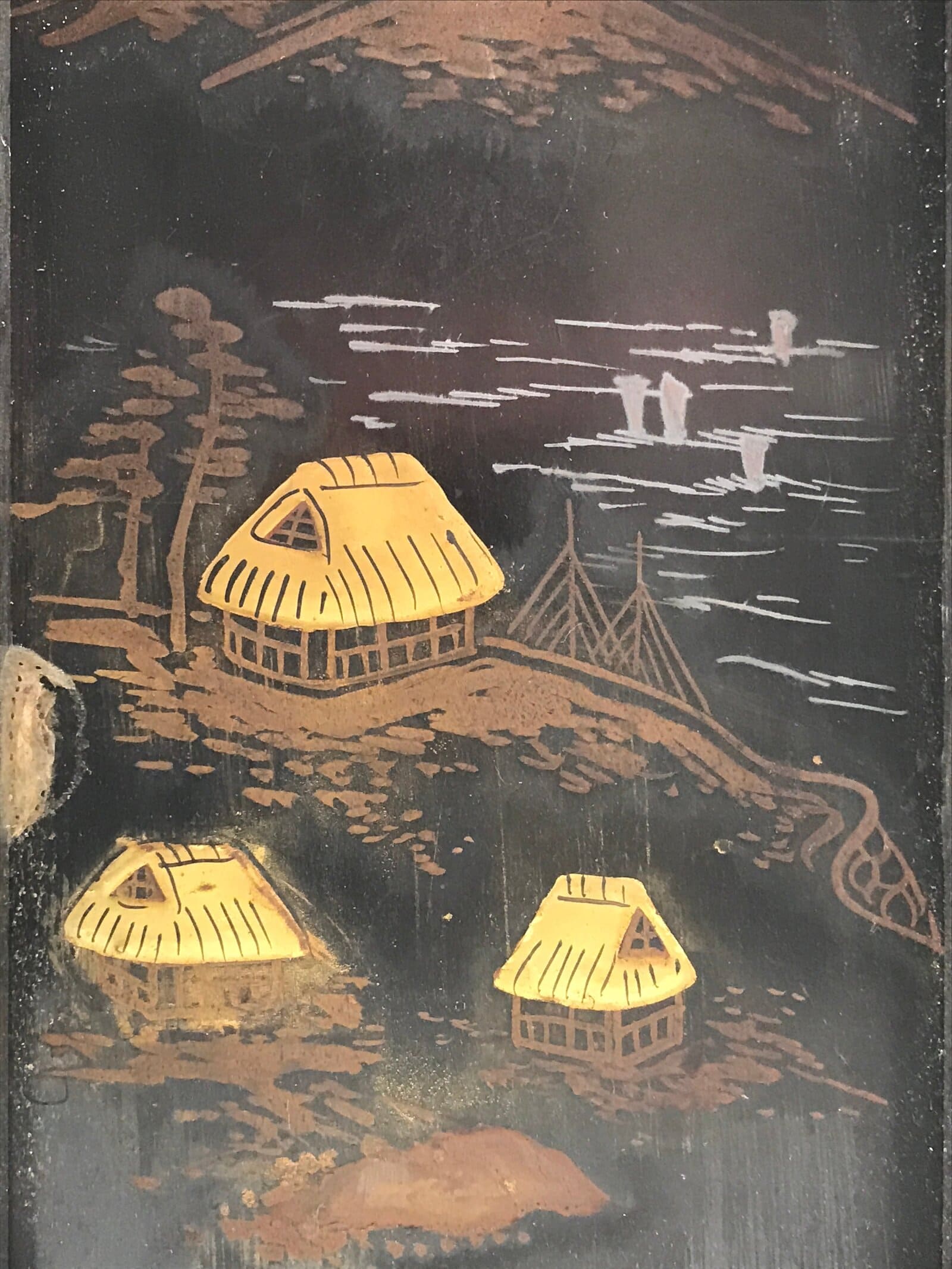 This item comes from a Japanese vintage wooden Buddhist altar cabinet. This deep, long drawer is mostly coated in classic black lacquer. The front contains an exquisite makie village scenery design with the sea, trees, and buildings.