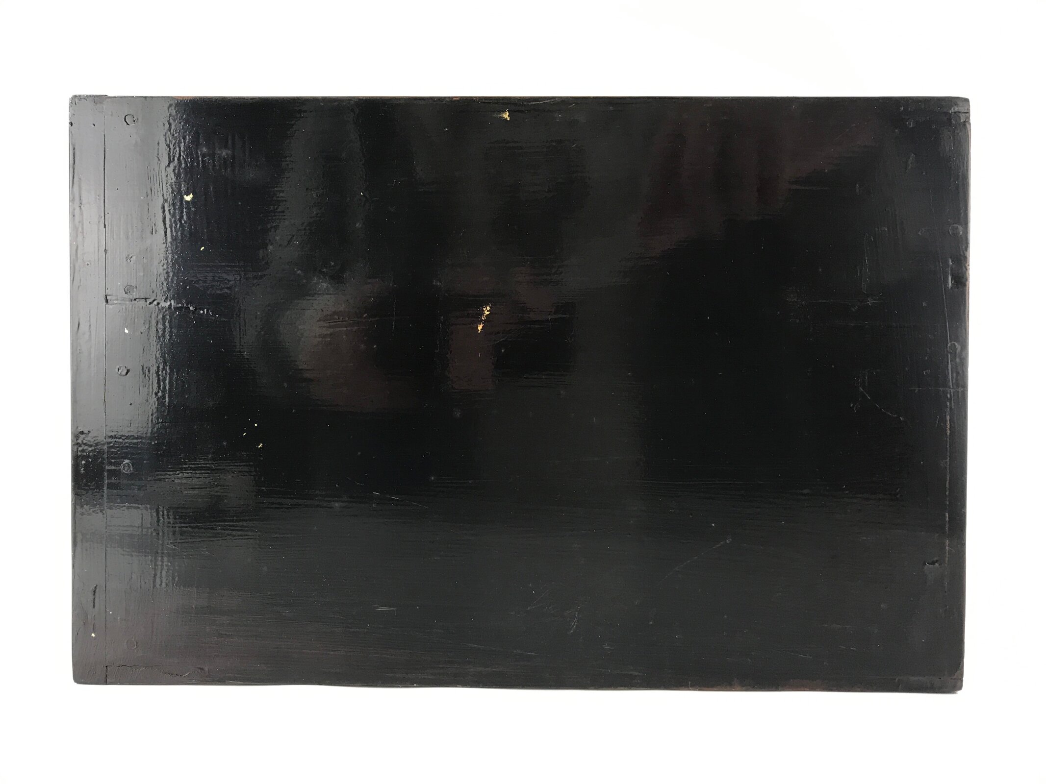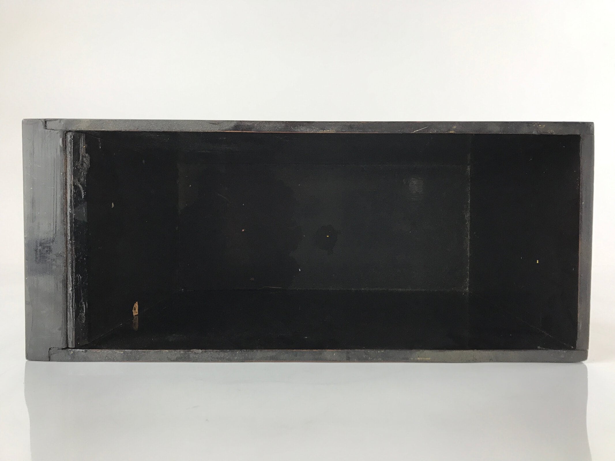 This item comes from a Japanese vintage wooden Buddhist altar cabinet. This deep, long drawer is mostly coated in classic black lacquer. The front contains an exquisite makie village scenery design with the sea, trees, and buildings.