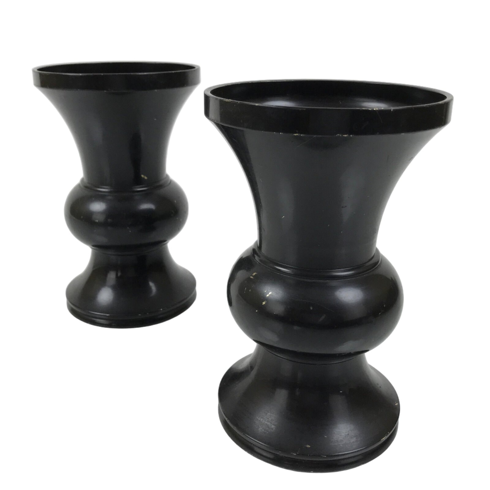 This is a pair of vintage Japanese metal flower vases, or hanatate, for Buddhist altars. This particular pair has some weight to it for stability. They have a traditional, simple shape with no other embellishments and are painted a black color.