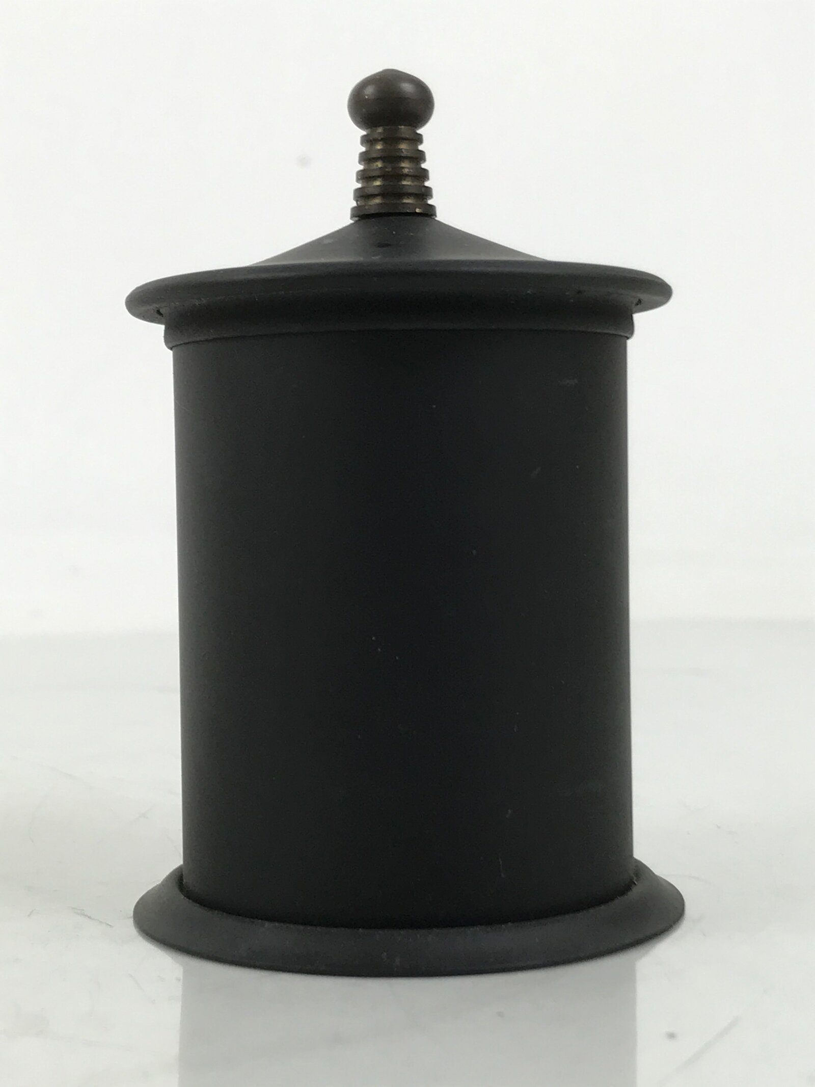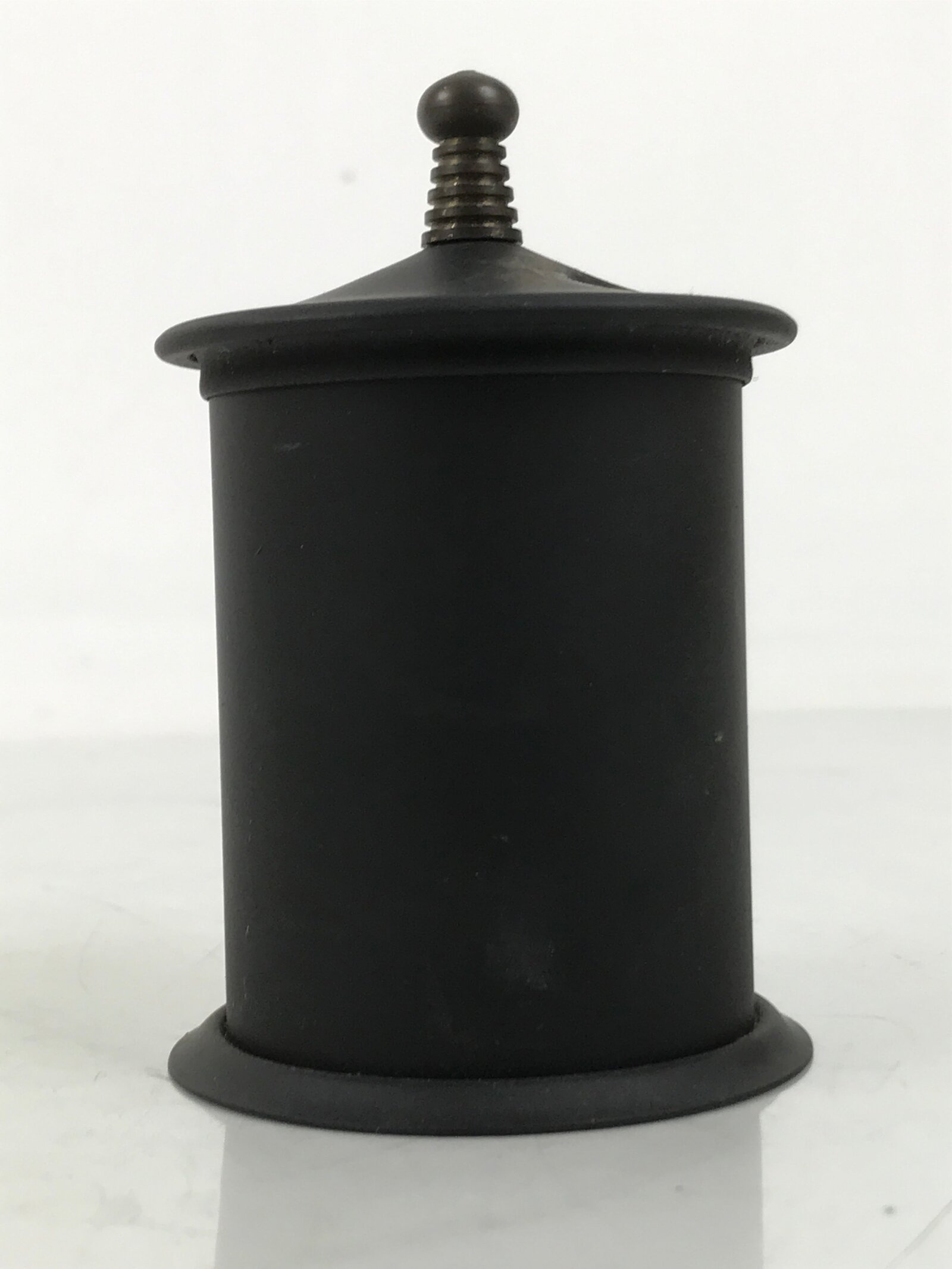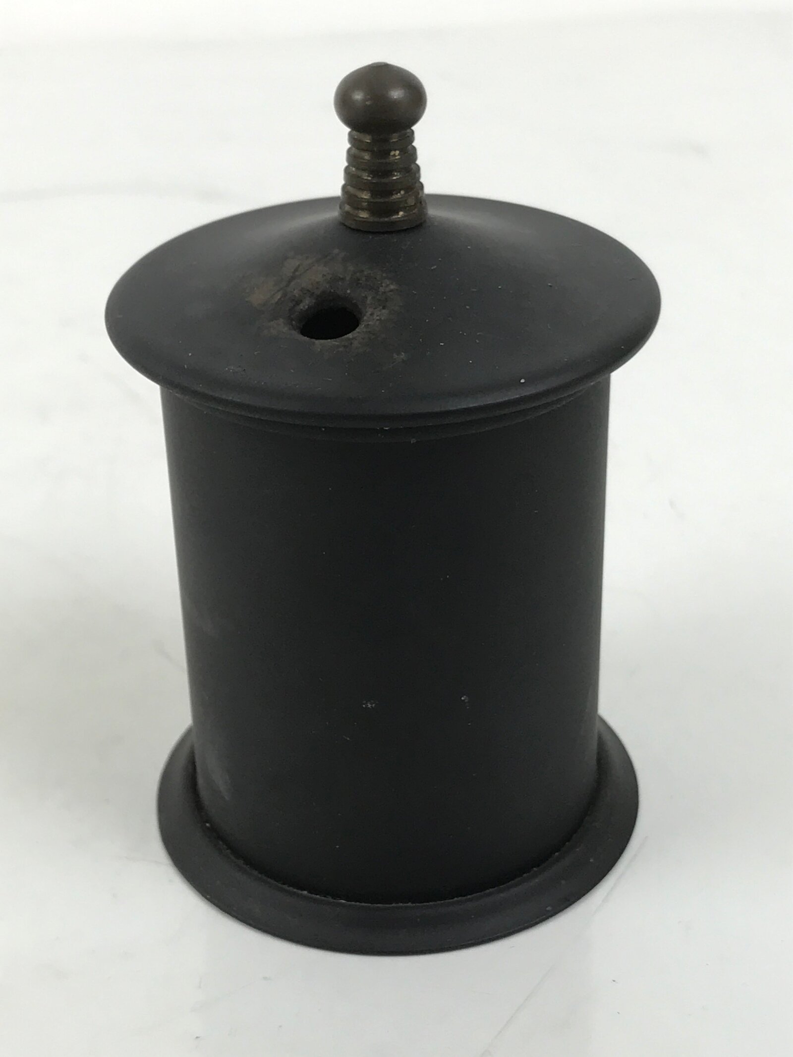 This item is a vintage metal matchstick extinguisher jar (hikeshi) made for use as an altar fitting in a Japanese Buddhist altar. It is a tool that can safely dispose of matches after lighting candles or incense by inserting a used matchstick into the hole in the lid. It is mostly black and cylindrical with the exception of the brown metal finial on the lid.
