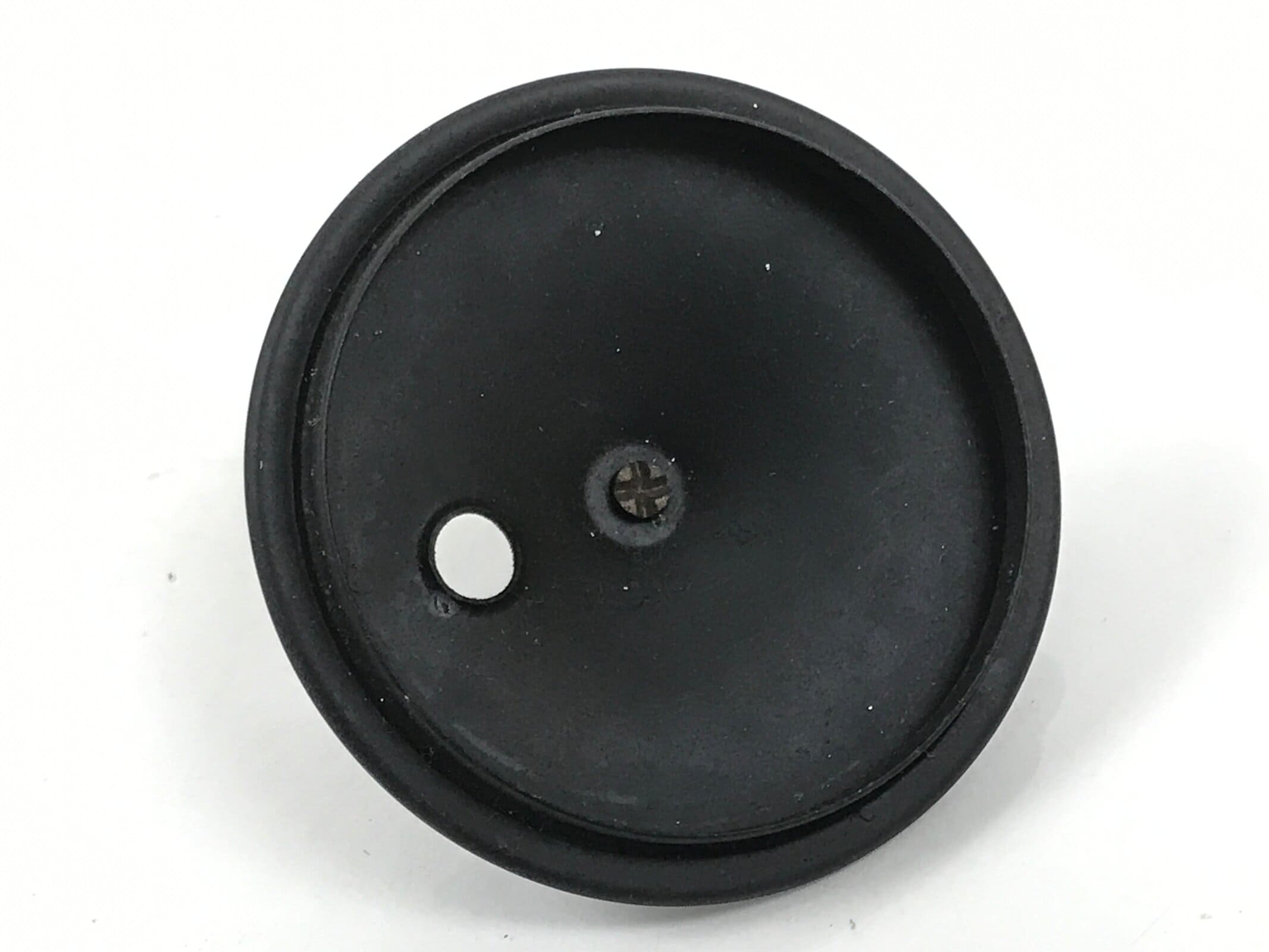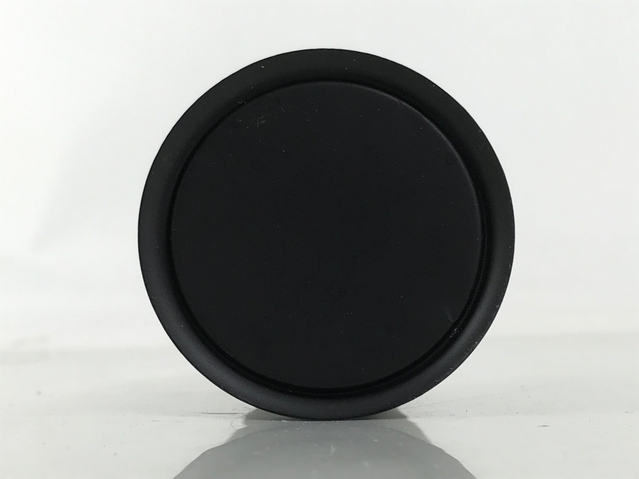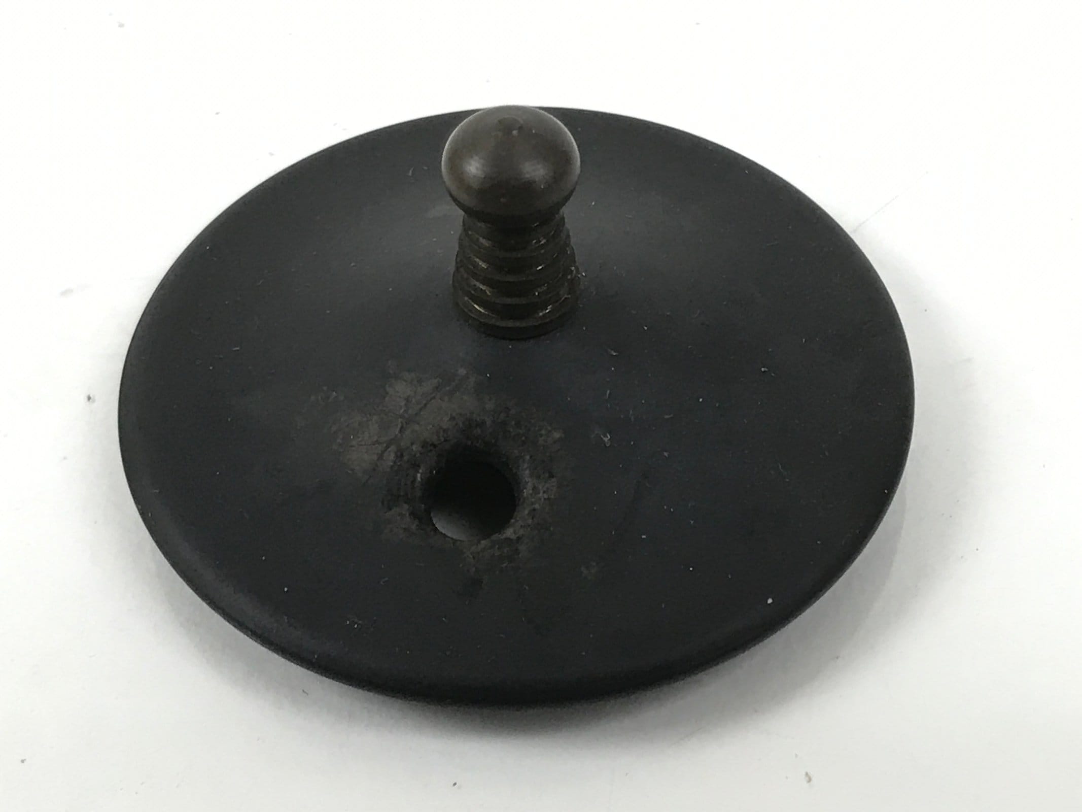 This item is a vintage metal matchstick extinguisher jar (hikeshi) made for use as an altar fitting in a Japanese Buddhist altar. It is a tool that can safely dispose of matches after lighting candles or incense by inserting a used matchstick into the hole in the lid. It is mostly black and cylindrical with the exception of the brown metal finial on the lid.