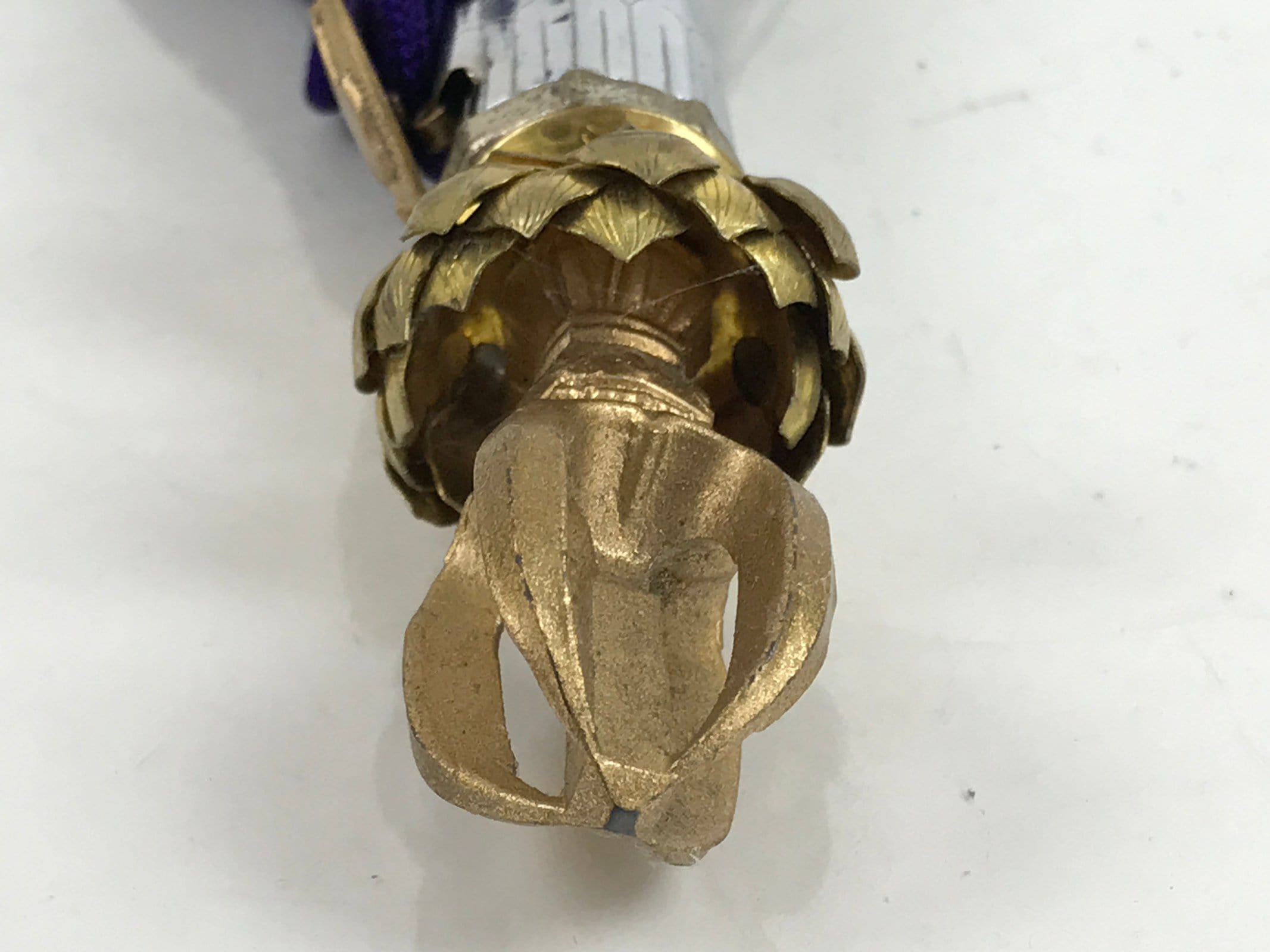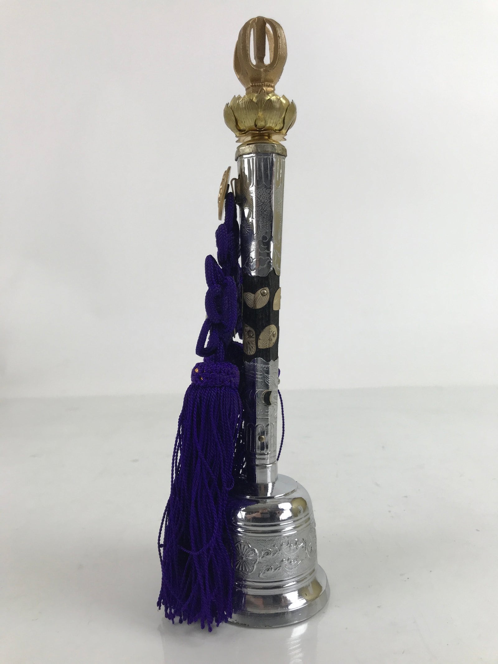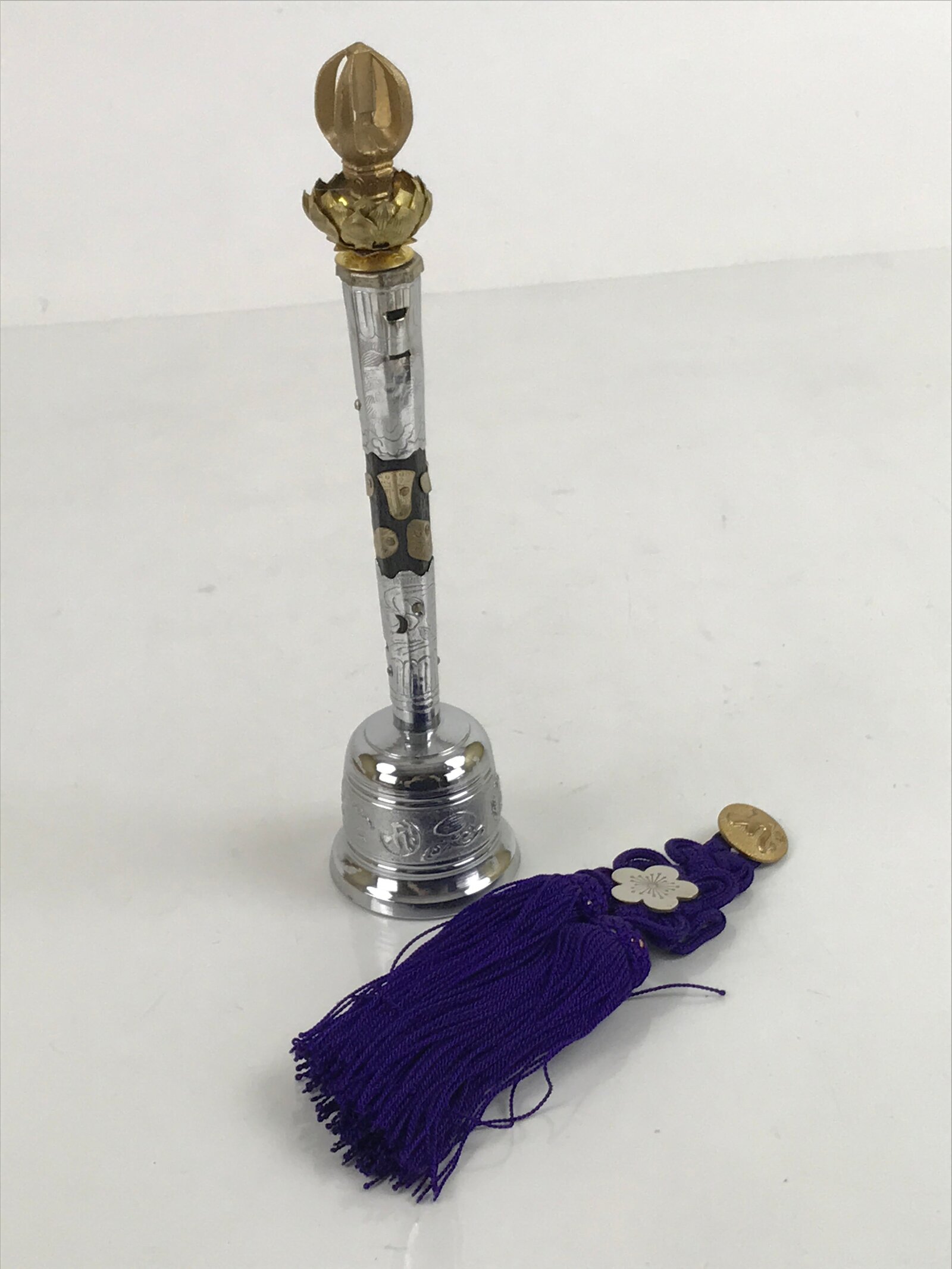 This is a vintage Japanese Buddhist five-pronged handbell, or kongorei, used primarily during Buddhist ritual ceremonies and prayer. It is a Soto Zen bell and is made mostly of silver-colored metal. It features embossed plum blossoms along the handle as well as a shouchikubai motif on the bell part. At the very top is a gold metal lotus flower. The front has a removable royal purple braided and knotted cord and tassels with a silver plum blossom pin. The sound is very bright and cheery.