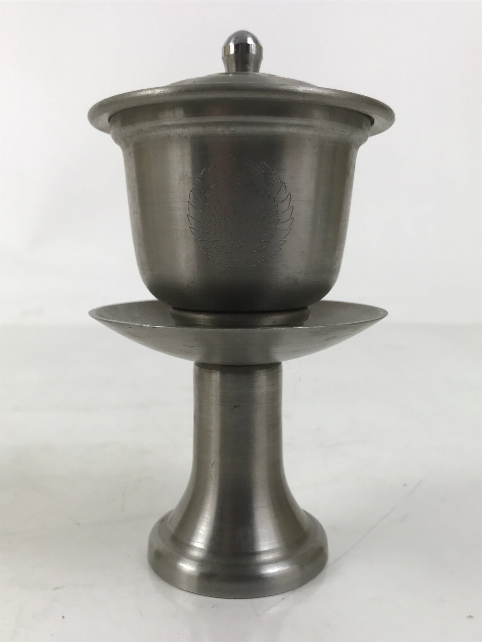 This is a vintage Japanese Buddhist metal water/tea offering cup (chaki) commonly used in Buddhist altars. It is a unique chalice shape that consists of a platform base, a cup and a lid all made of the same metal. There is an engraved crane on the front side. The crane is the Nichiren Shoshu sect mon symbol.