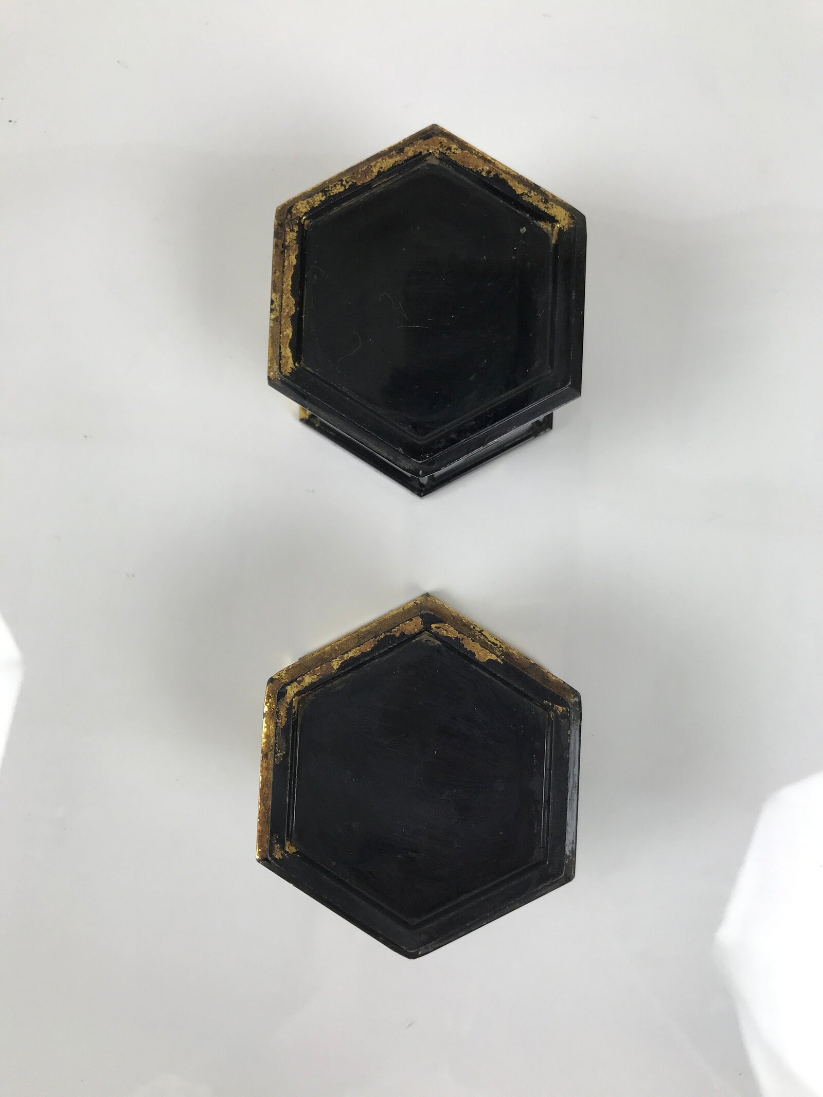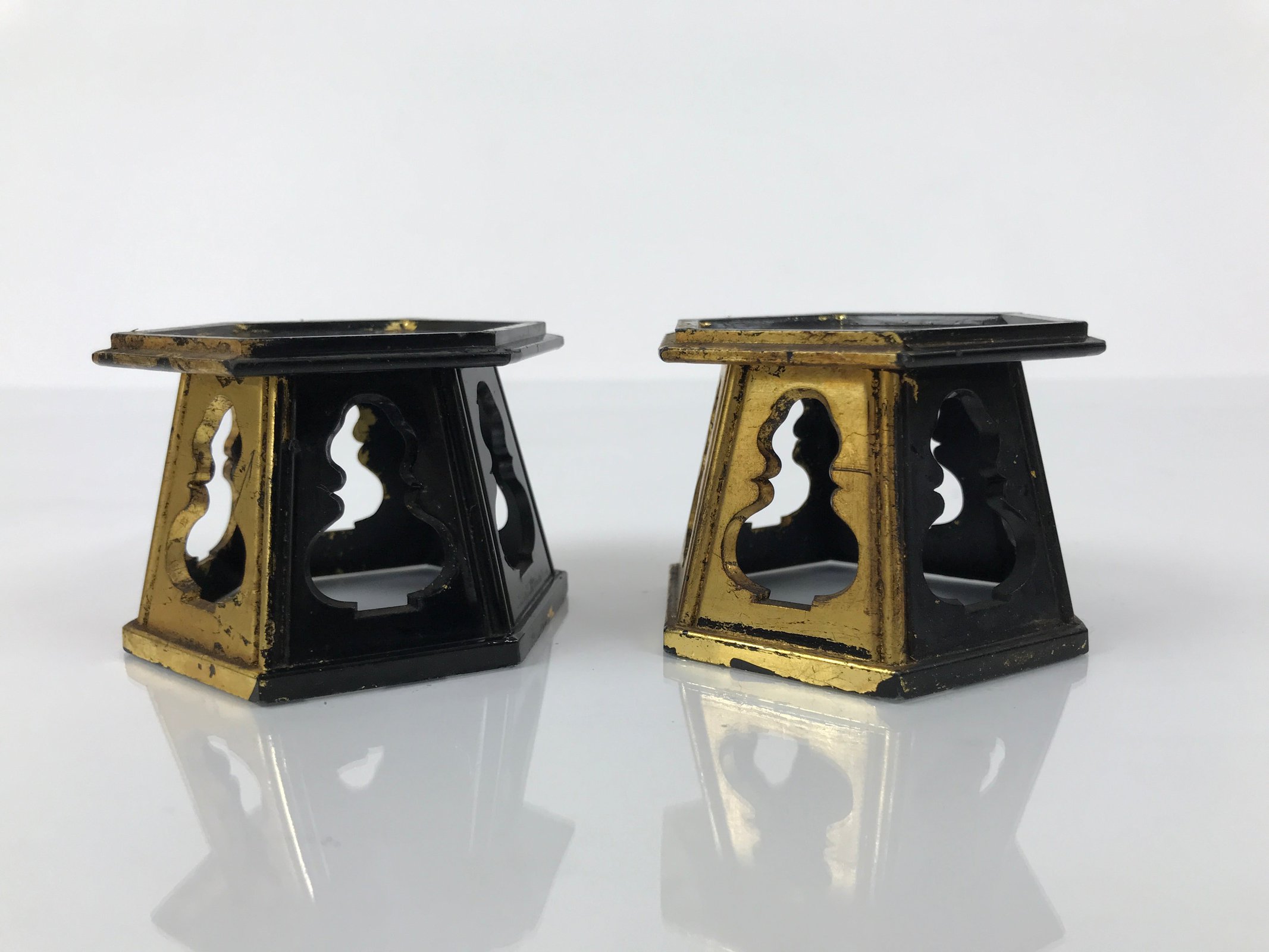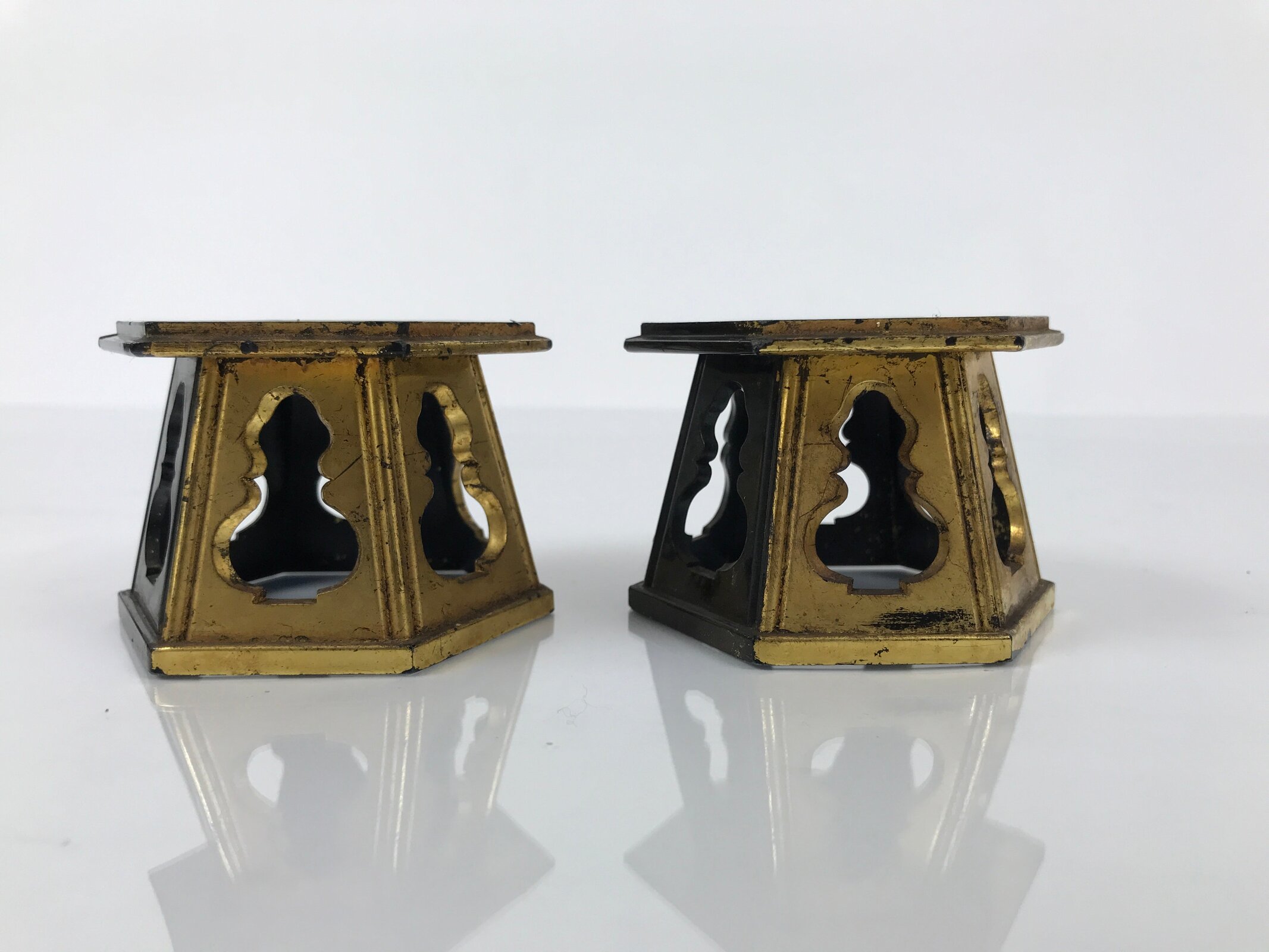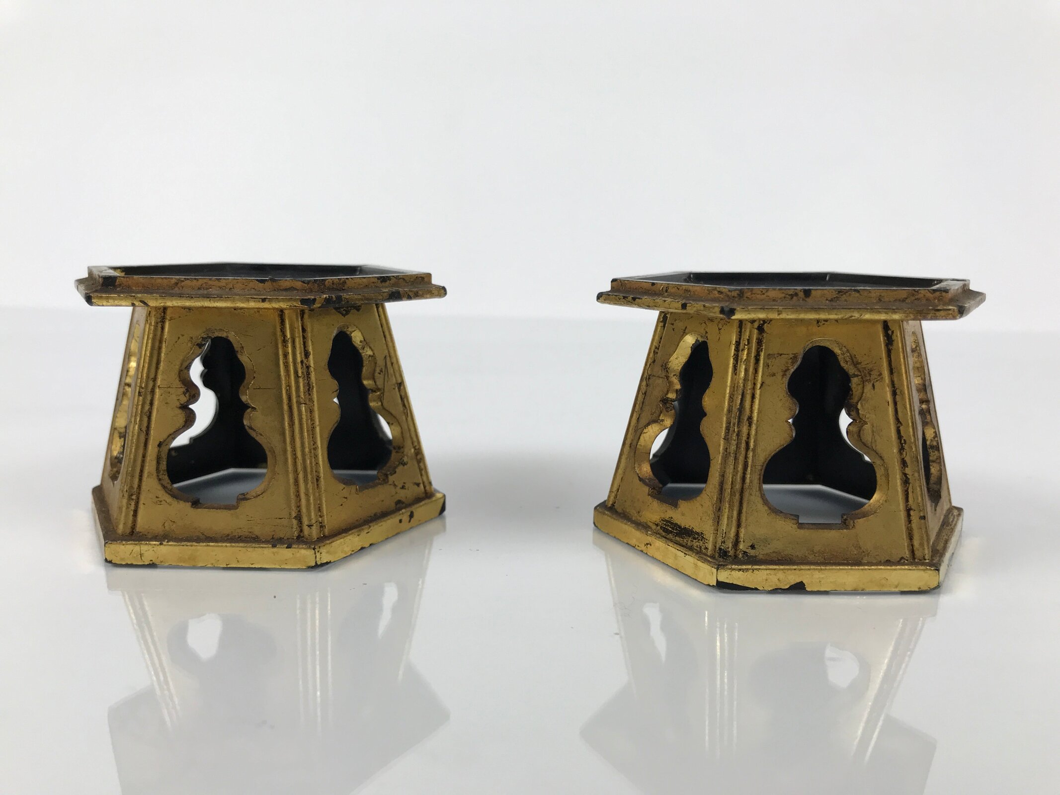 This is a pair of Japanese offering cup stands for a Buddhist altar. Also called bukki, this important altar accessory is made of resin and coated with gold and black paint. It has a simple hexagonal shape with cutouts on the sides. It is used often in pairs to hold small cups of rice, sake, and more as an offering to Buddha and one’s ancestors.