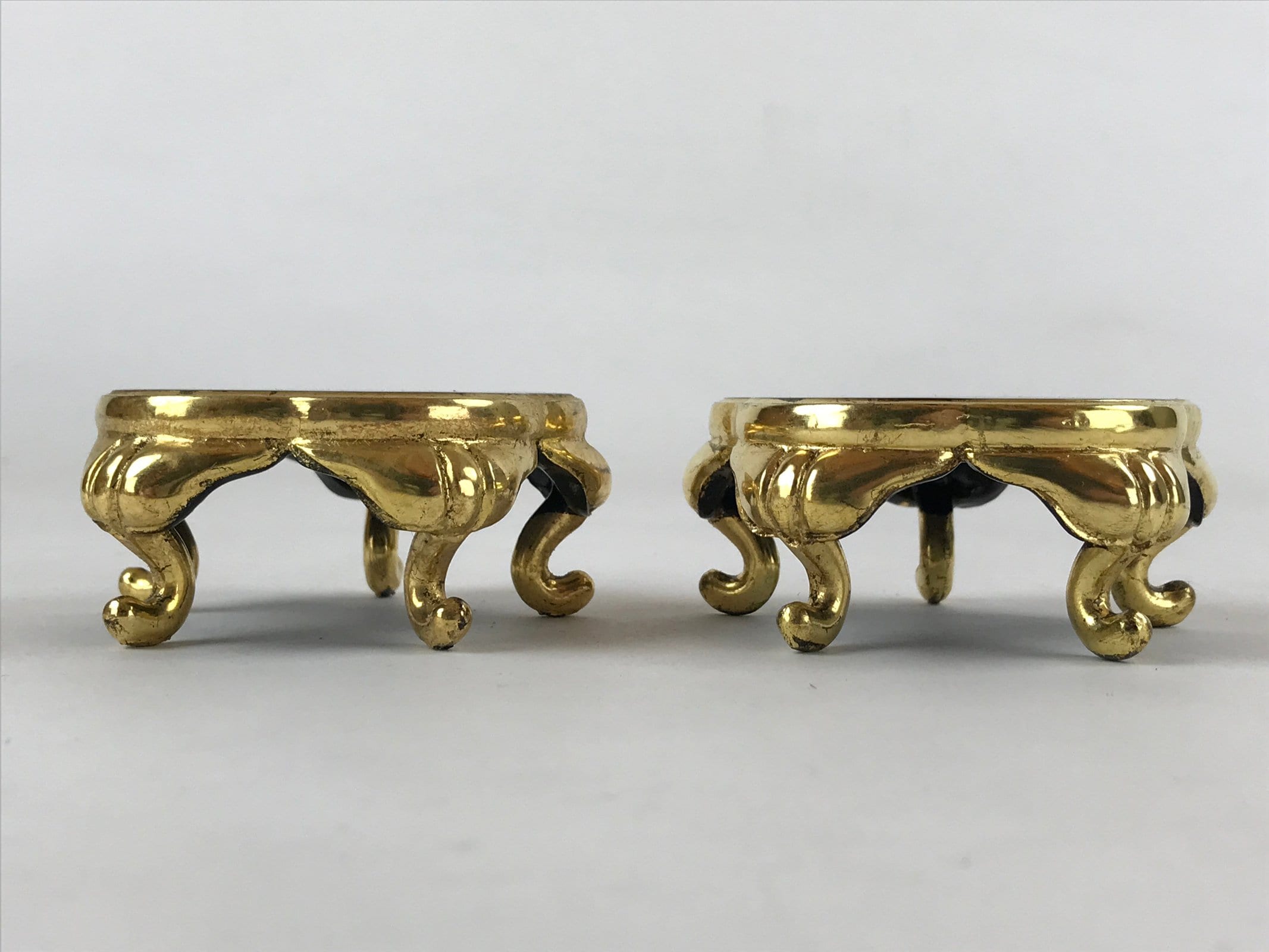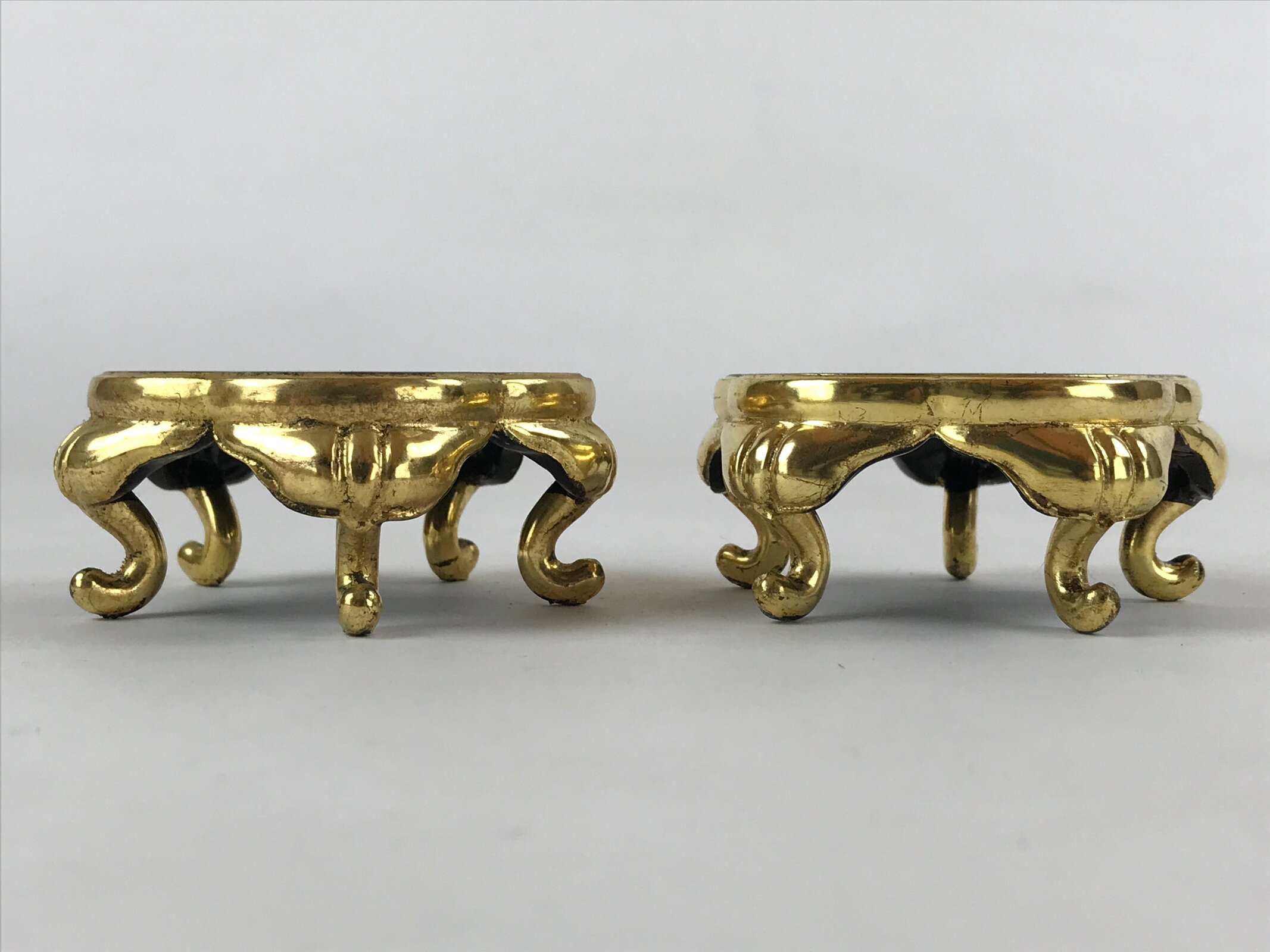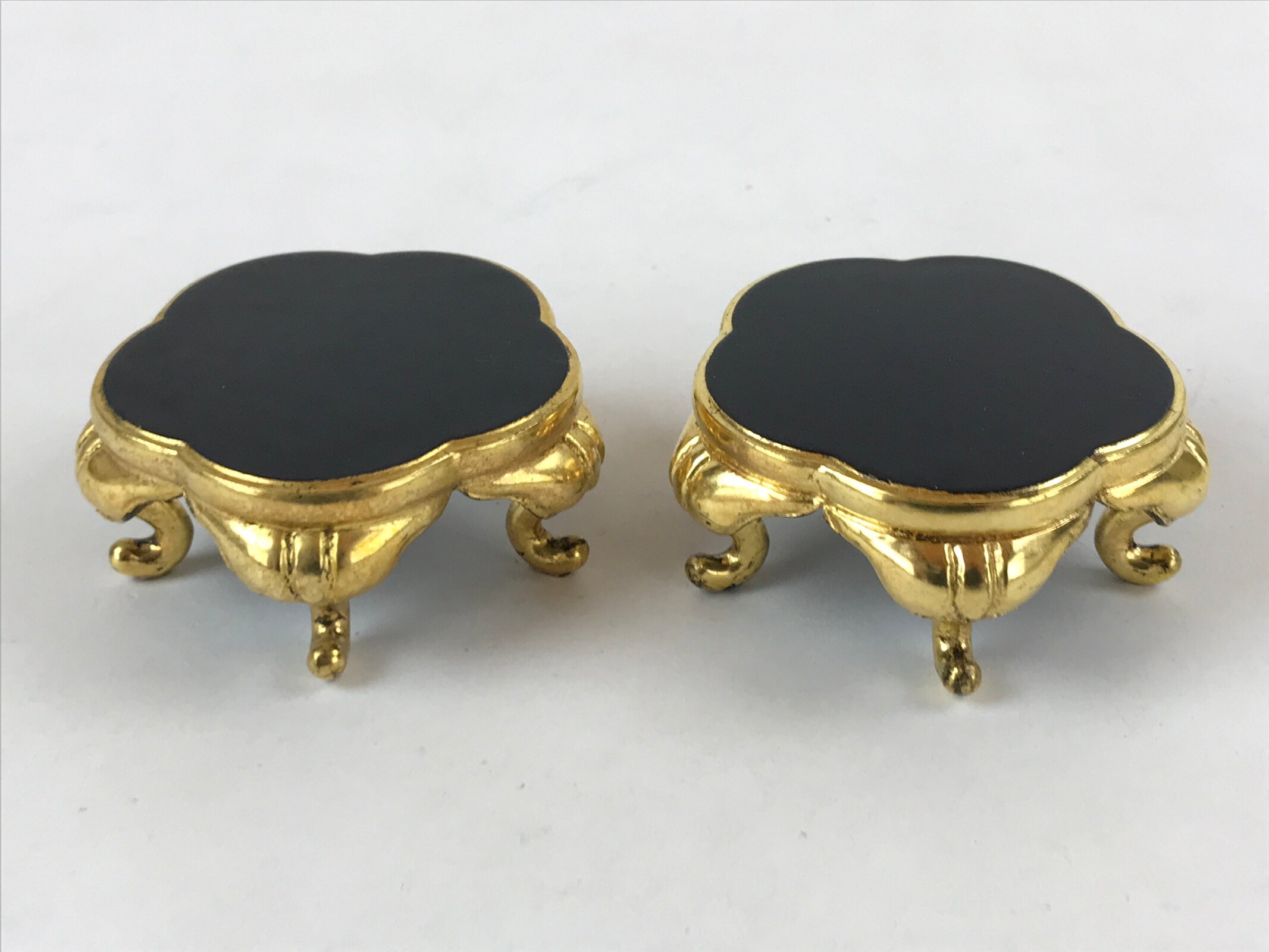 This is a pair of Japanese offering cup stands for a Buddhist altar. Also called bukki, this important altar accessory is gold and black and has an elegant plum blossom-shaped top surface. It stands on five curved gold legs. It is used often in pairs to hold small cups of rice, sake, and more as an offering to Buddha and one’s ancestors.