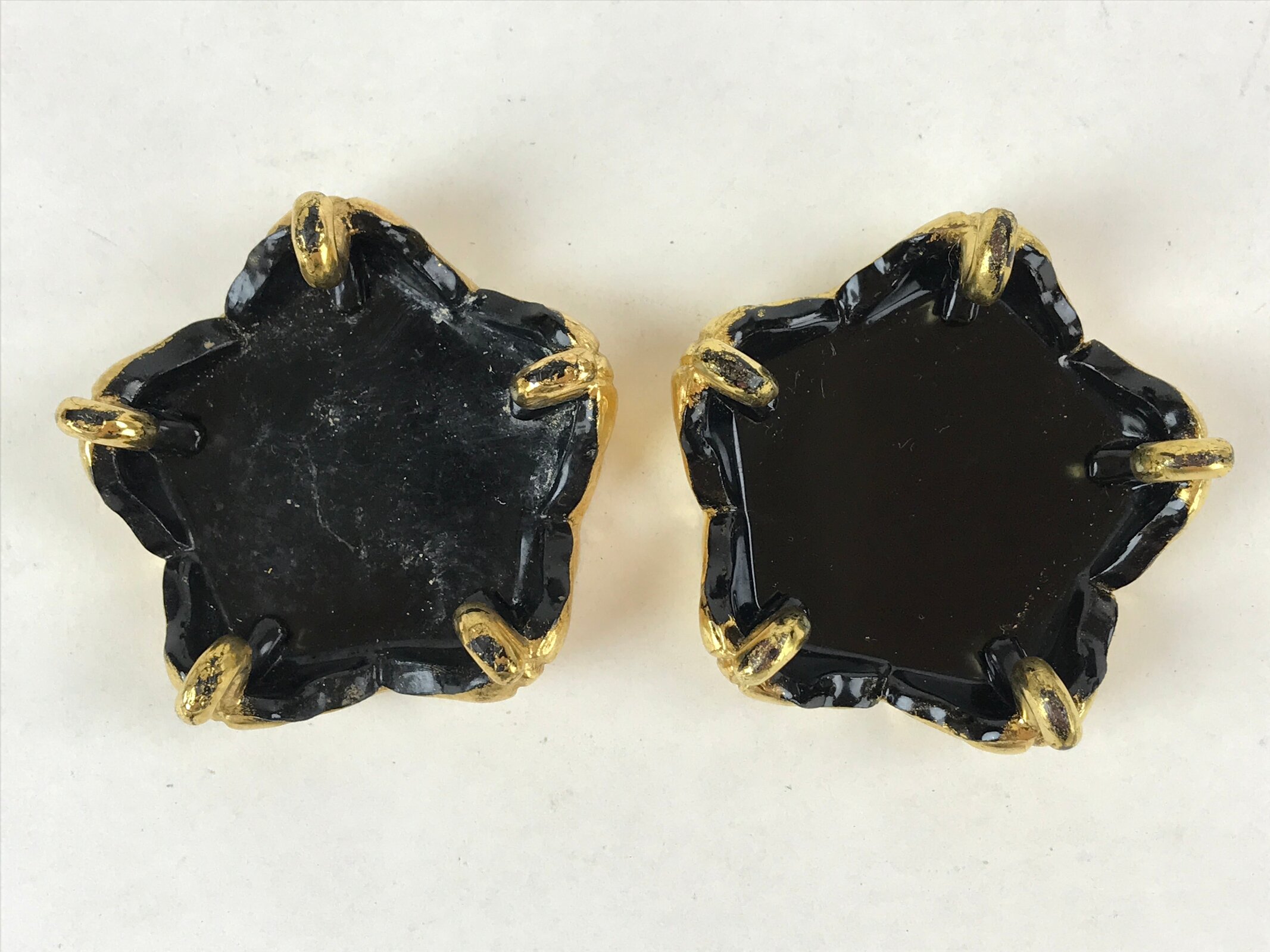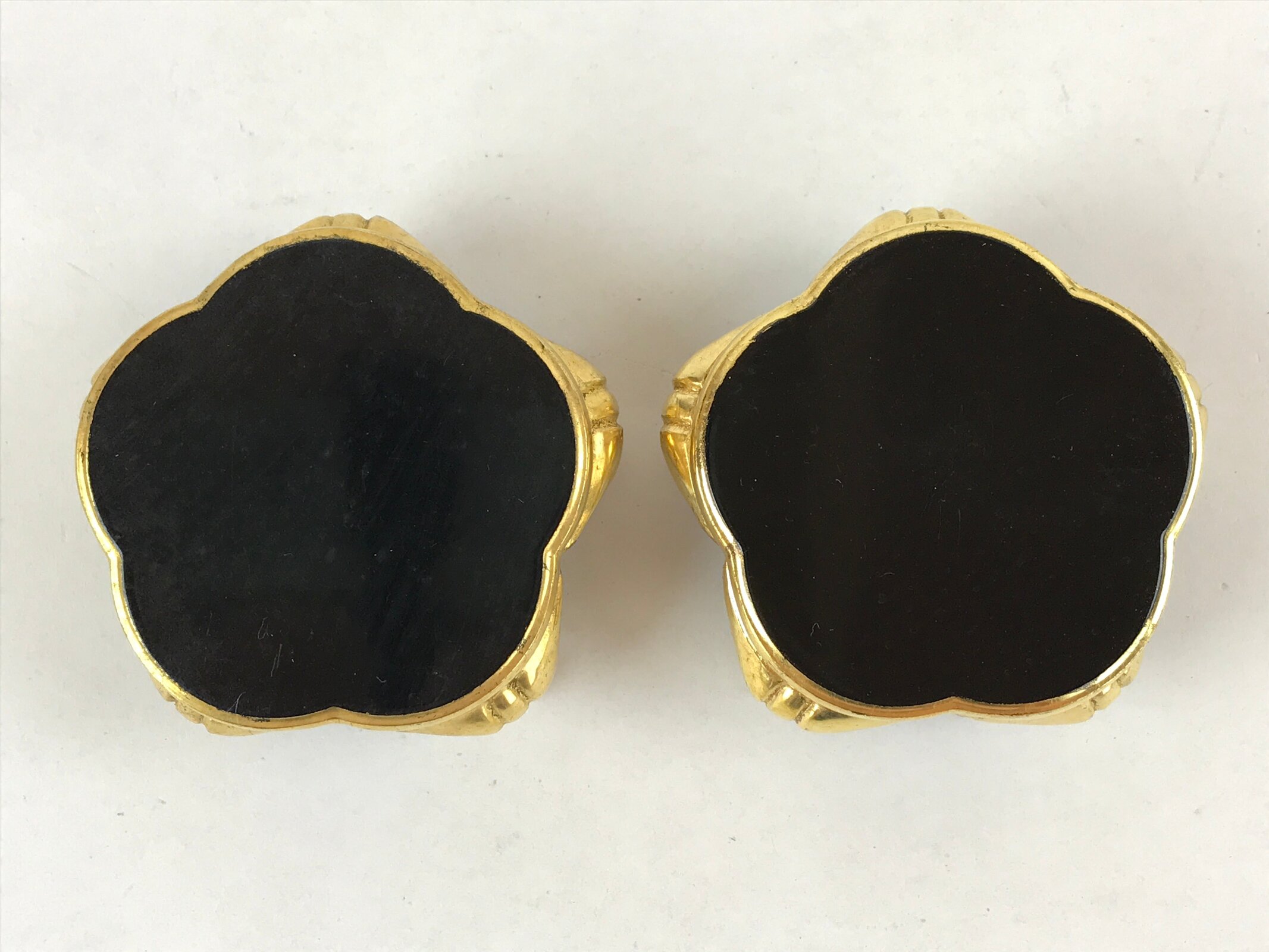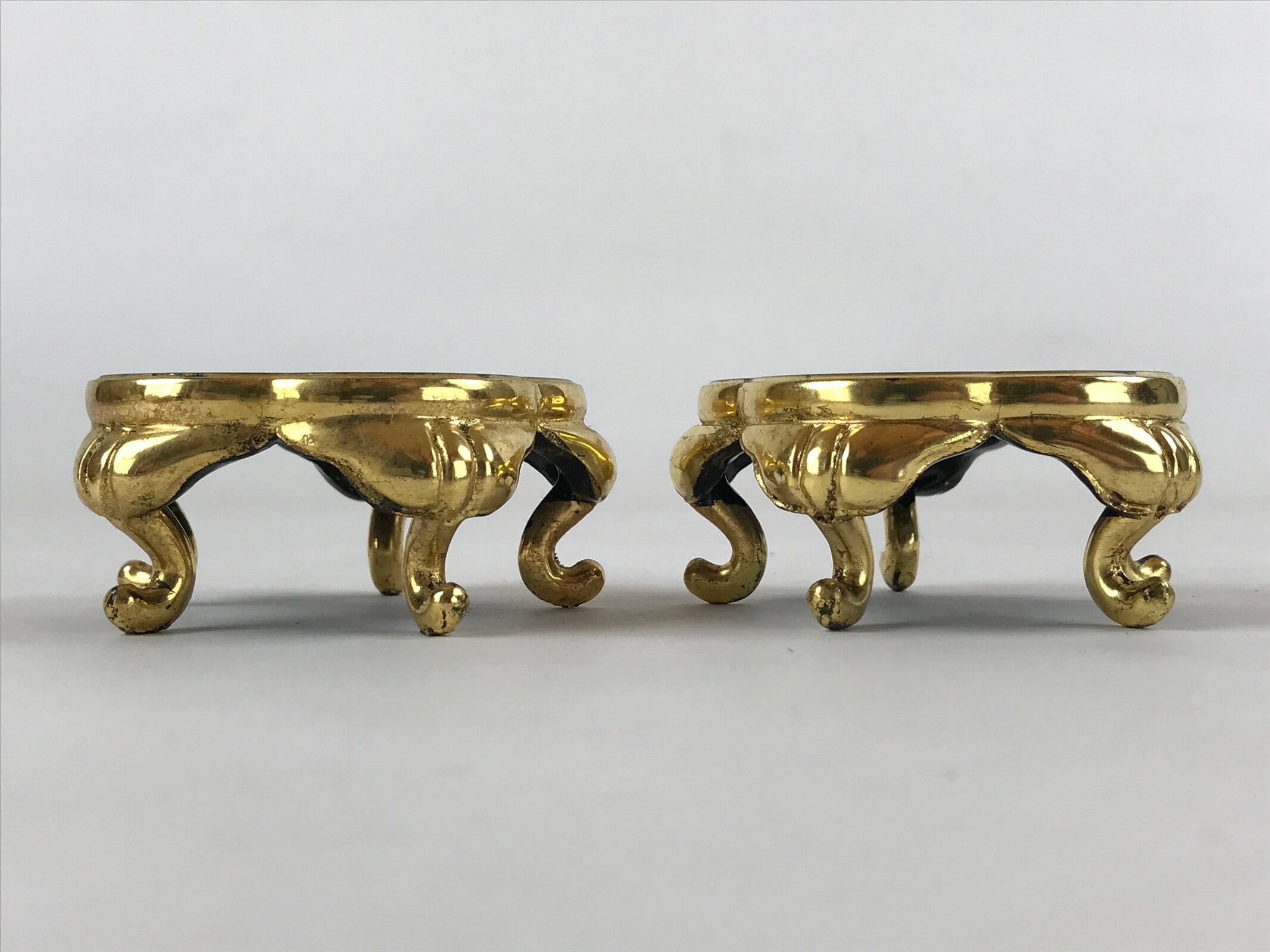 This is a pair of Japanese offering cup stands for a Buddhist altar. Also called bukki, this important altar accessory is gold and black and has an elegant plum blossom-shaped top surface. It stands on five curved gold legs. It is used often in pairs to hold small cups of rice, sake, and more as an offering to Buddha and one’s ancestors.