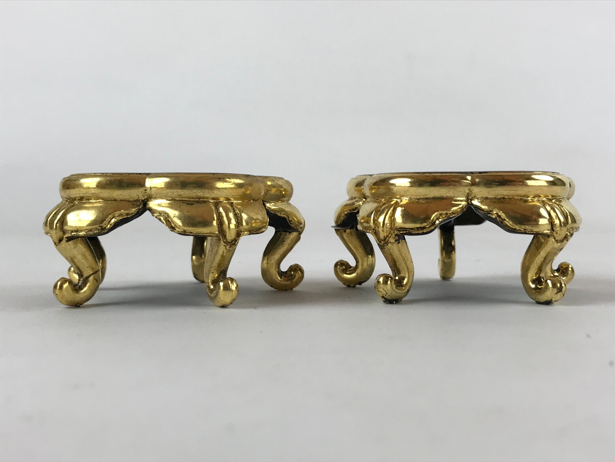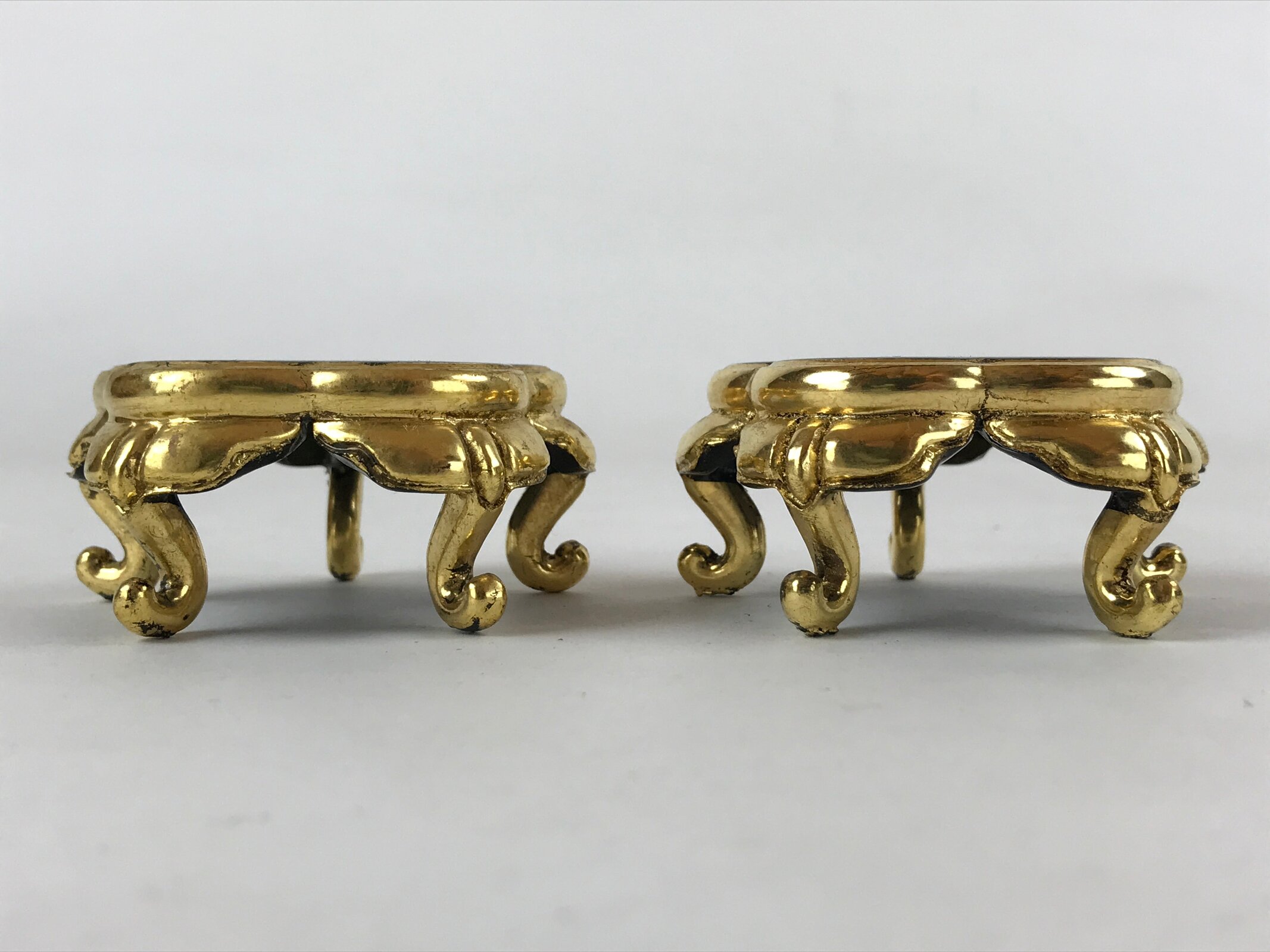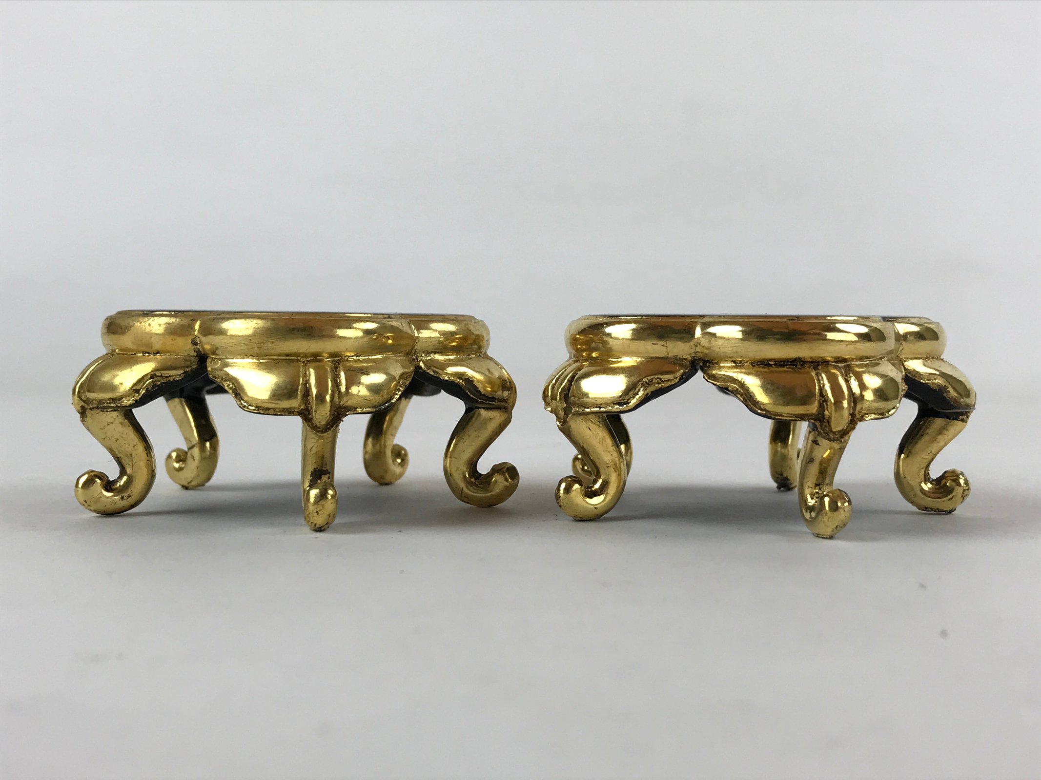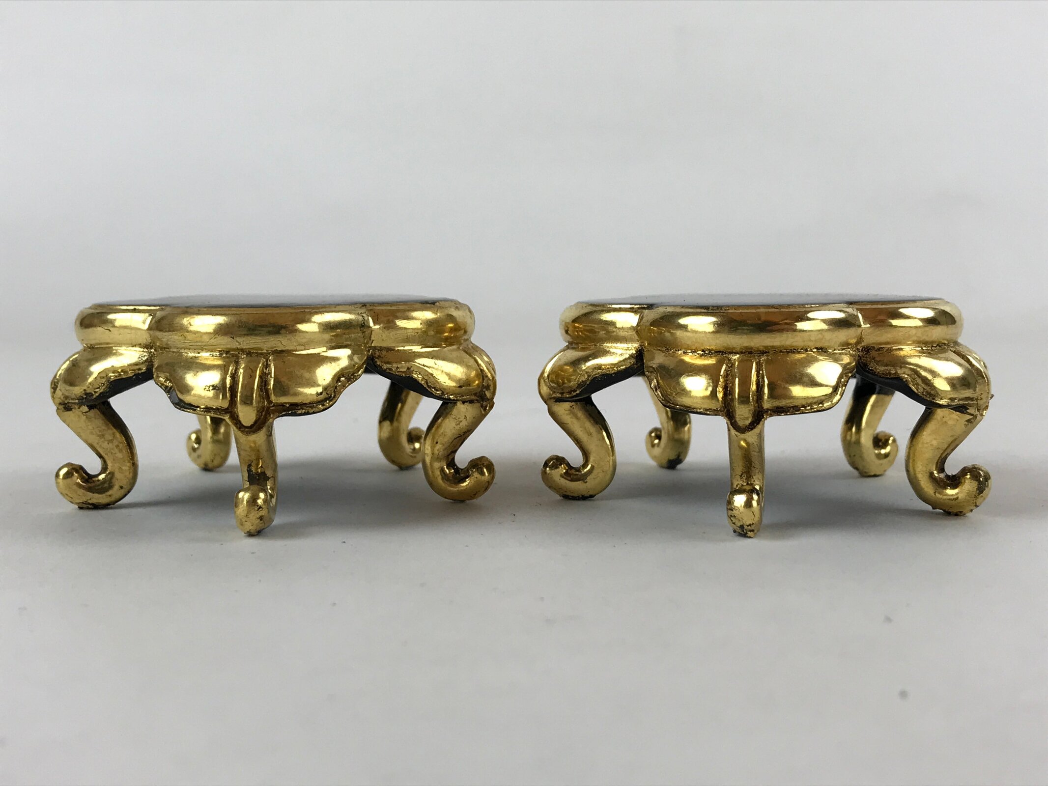 This is a pair of Japanese offering cup stands for a Buddhist altar. Also called bukki, this important altar accessory is gold and black and has an elegant plum blossom-shaped top surface. It stands on five curved gold legs. It is used often in pairs to hold small cups of rice, sake, and more as an offering to Buddha and one’s ancestors.