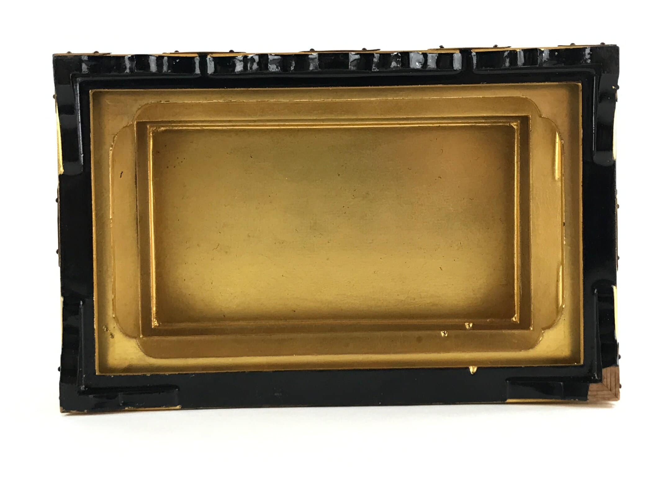 Coated with black and radiant gold lacquer, this small, lightweight antique Japanese Buddhist offering table is an important main feature in any home altar. It features charming scalloped corners and gold metal embellishments. The removable top panel is black lacquer on the bottom side and a unique reflective orange and brown lacquer on the other (ripple/wood grain pattern).