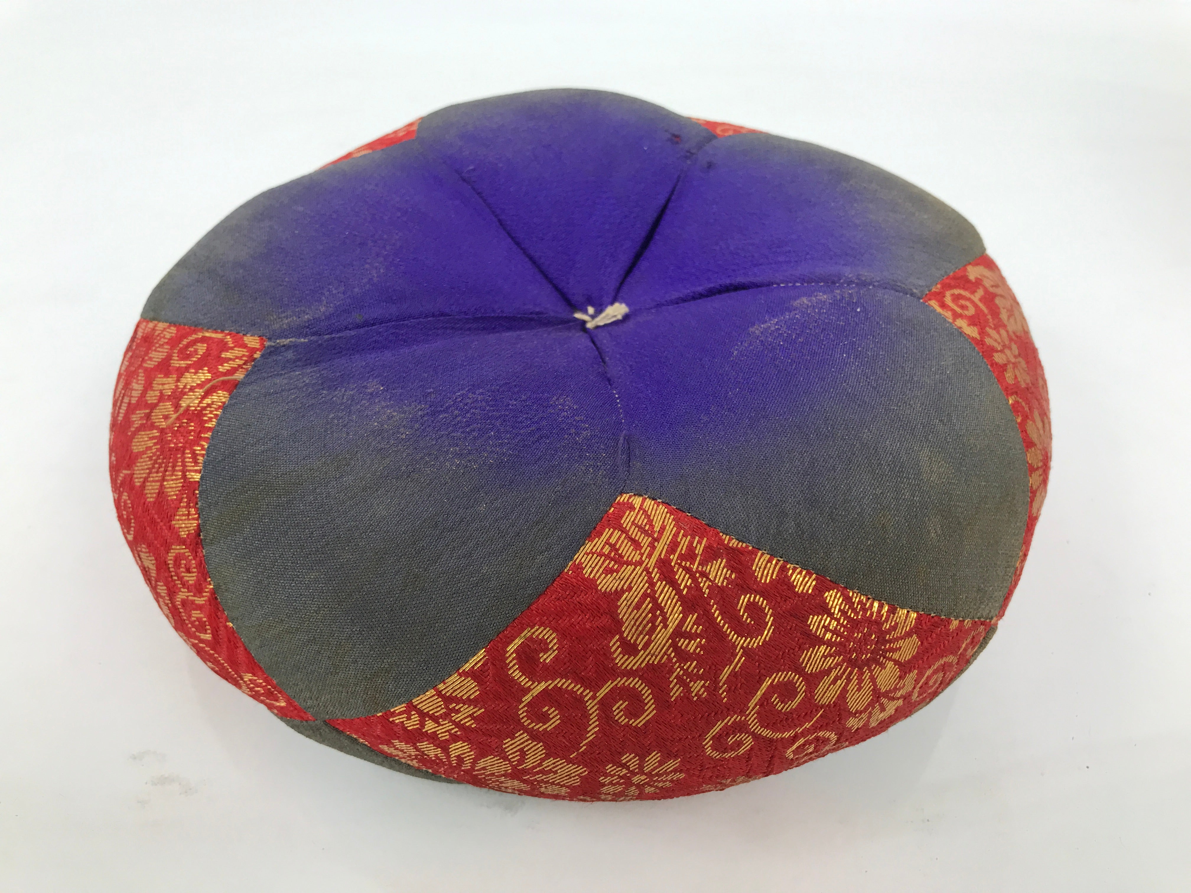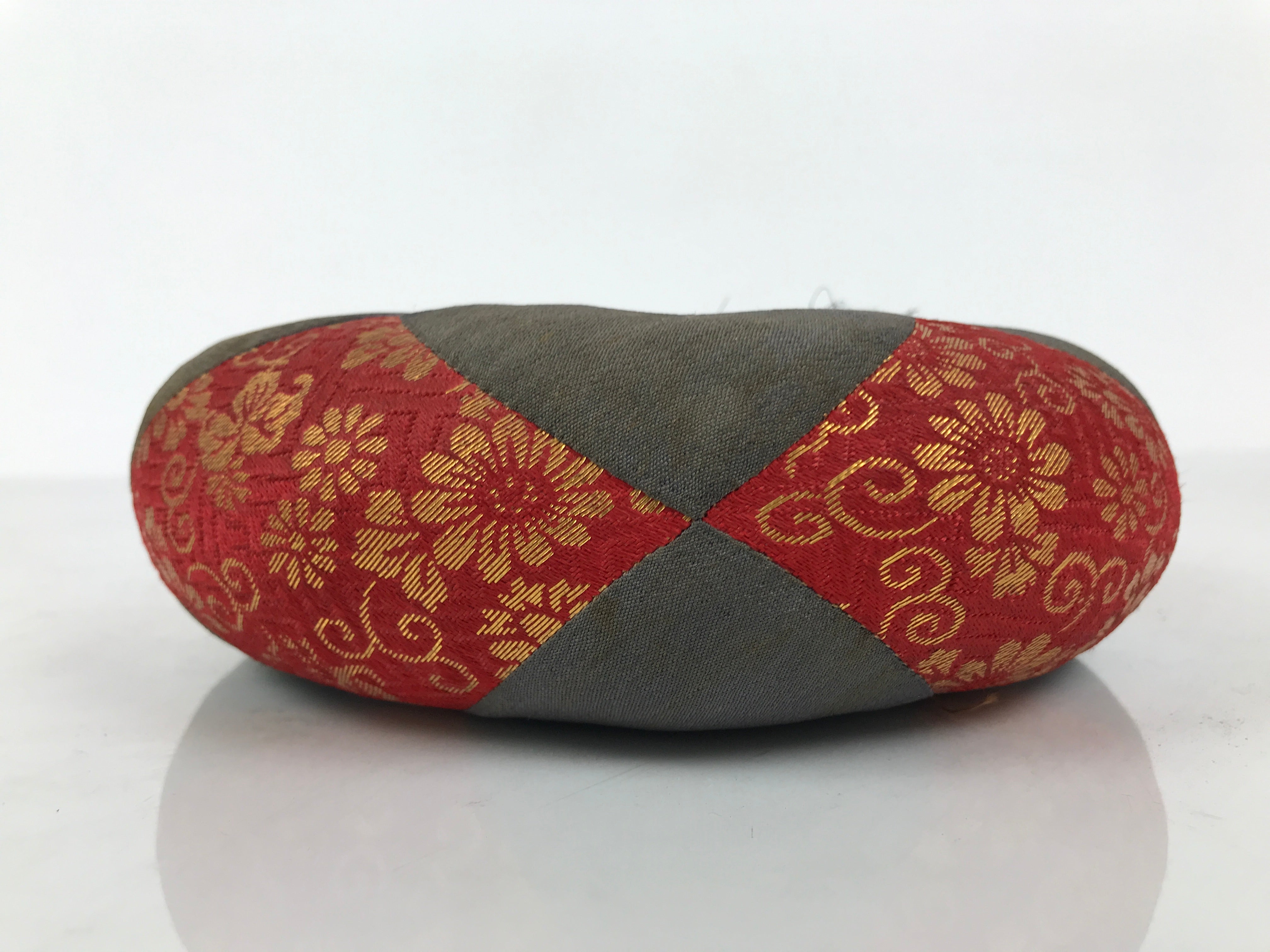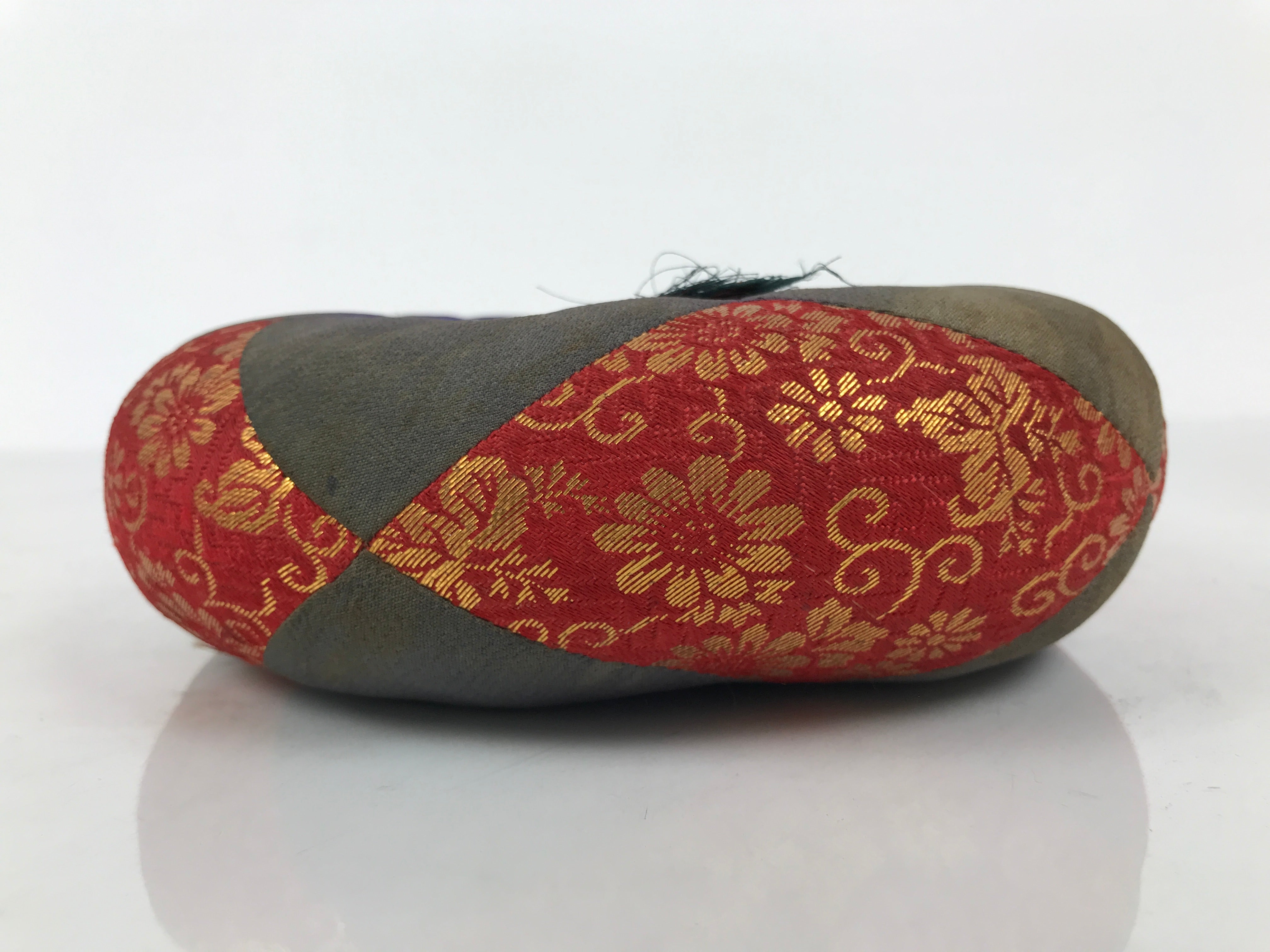 This is a vintage Japanese orin bell pillow or cushion for Buddhist altars. It is made of a combination of purple and red with gold silk fabrics featuring a traditional chrysanthemum (kiku) and karakusa vines motif. It is in a classic round shape with a simple teal tassel on one side.