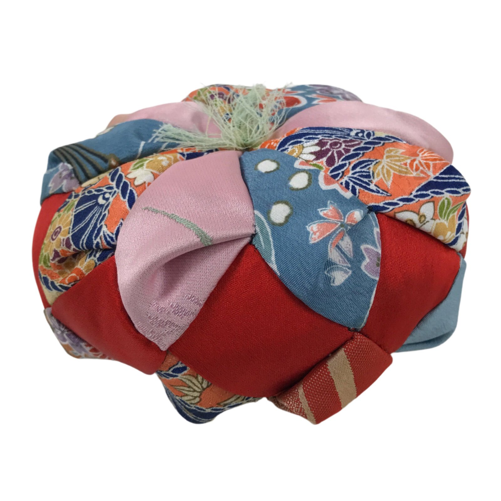 This is a vintage Japanese orin bell pillow or cushion for Buddhist altars. The cushion uses a variety of silk fabrics in a light purple, red, and a selection of blue woven fabrics with various floral motifs (cherry blossom, bellflower/ballon flower, and chrysanthemum). The piece is a round shape and finished with a light blue tassel on one side, and a beige tassel on the other. Either side can be used as the top.