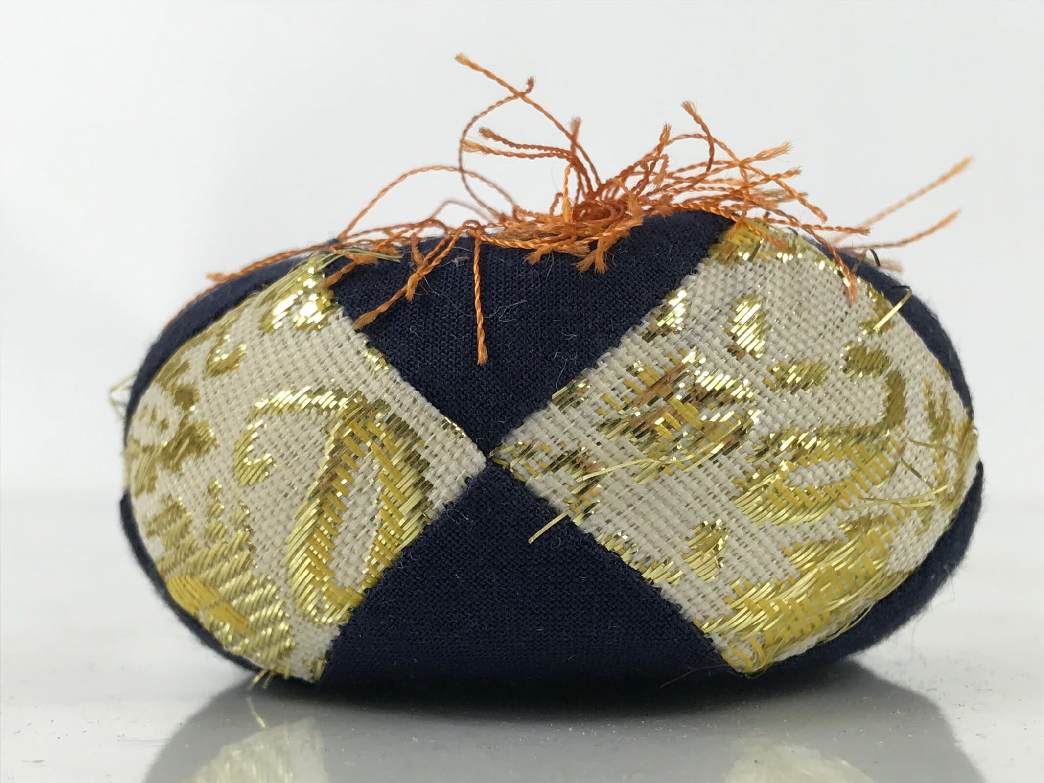 This is a vintage Japanese orin bell pillow or cushion for Buddhist altars. It is made of a combination of a navy blue with gold and beige with gold silk fabrics featuring a floral motif. It is in a classic round shape with a simple orange tassel on one side.