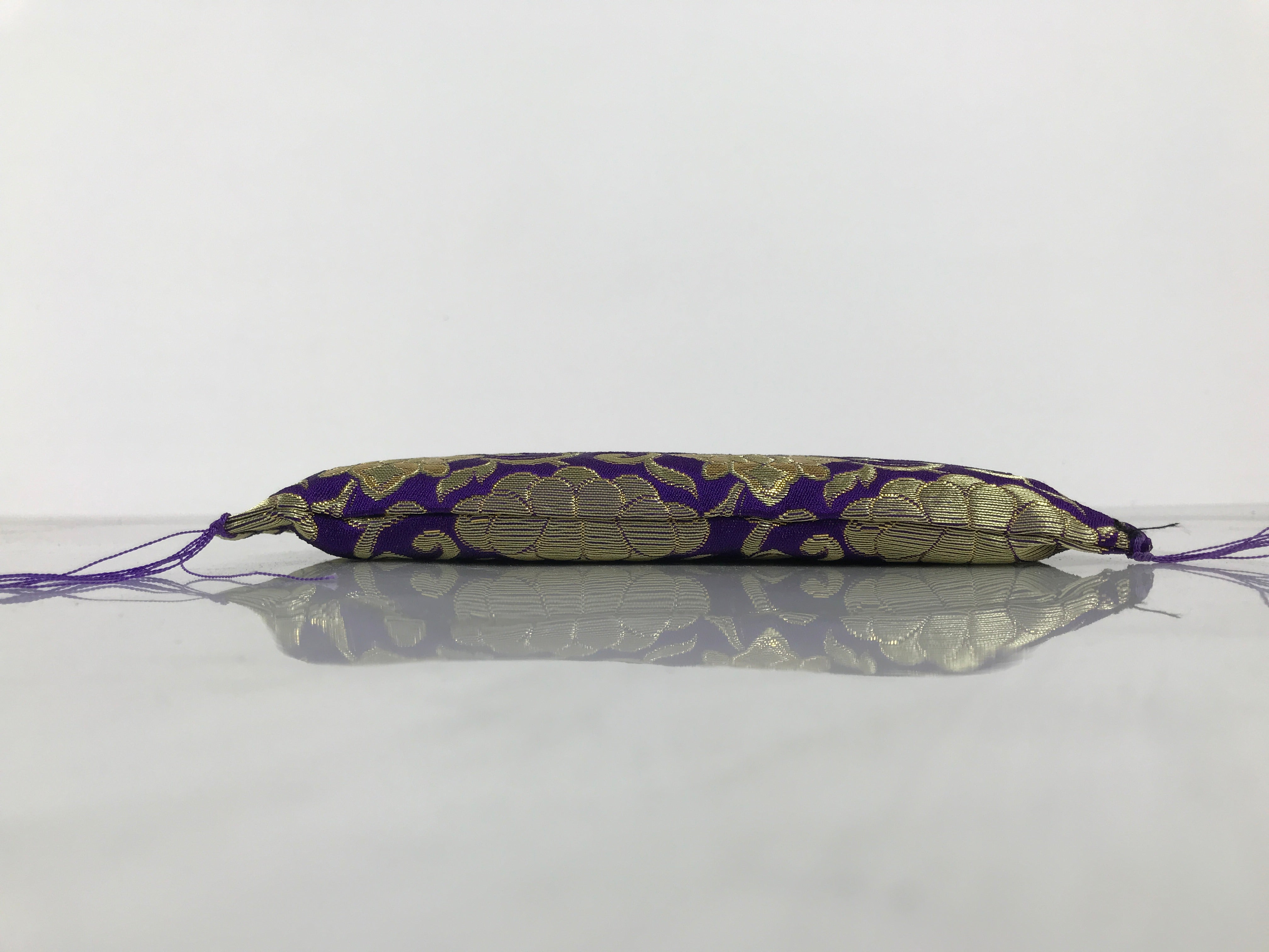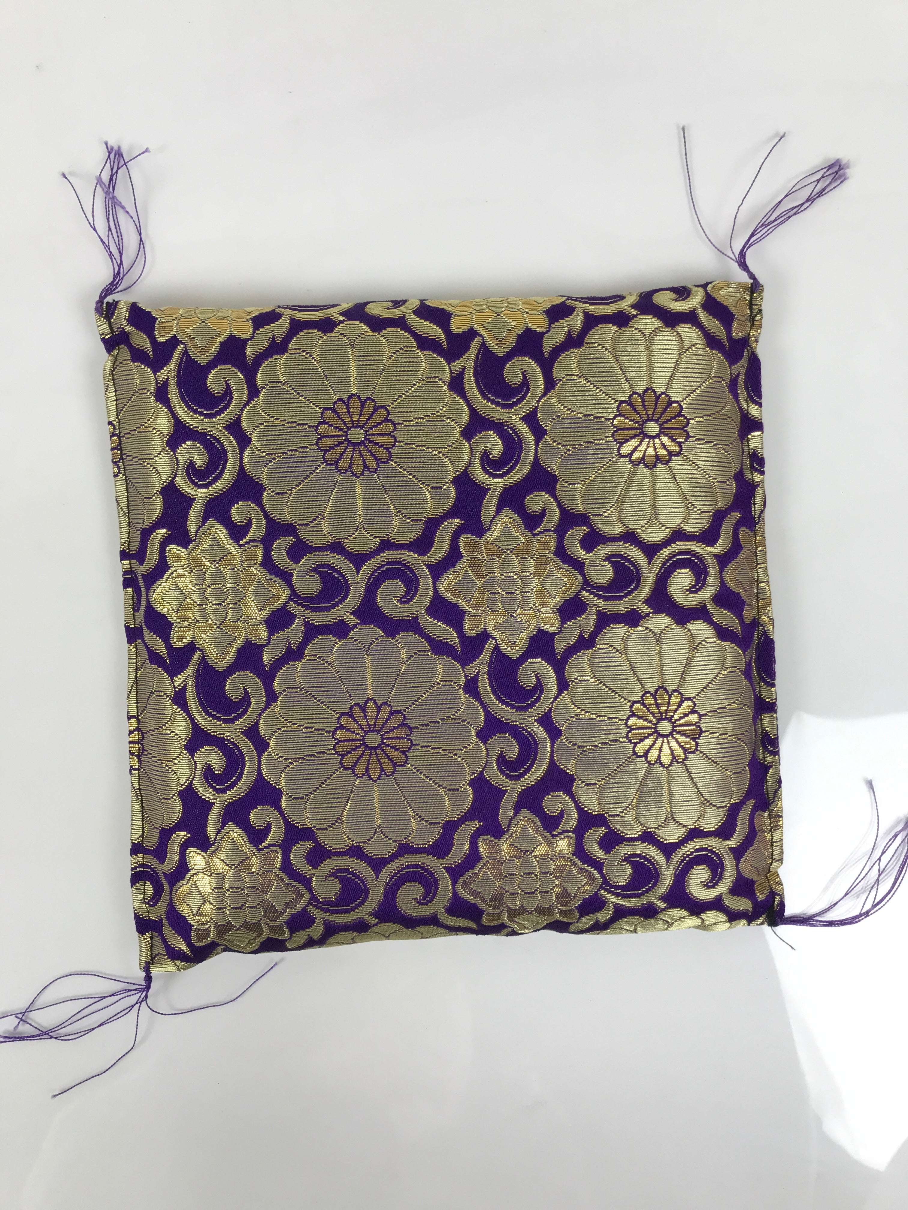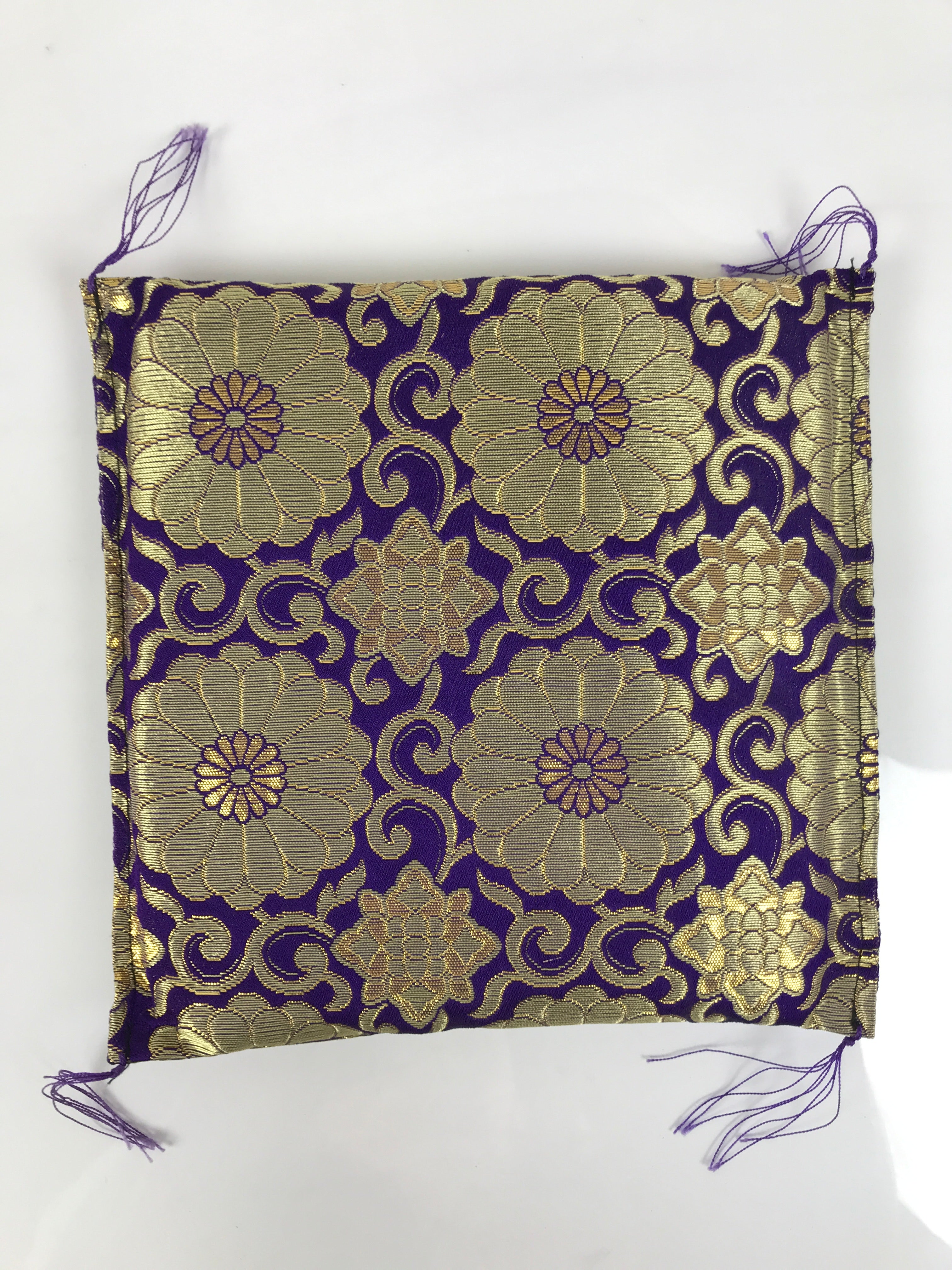 This is a vintage Japanese pillow/cushion stand. It is used for decorating Buddhist altars and acts as an accessory to important religious items. Due to its square shape, this particular piece is likely used for mokugyo, a fish-shaped wooden drum used to keep time during chants. It is purple with beautiful gold chrysanthemum and vine design and has small tassels on each corner. There is a rigid material inside to keep the stand firm, but still has some plushness to it.