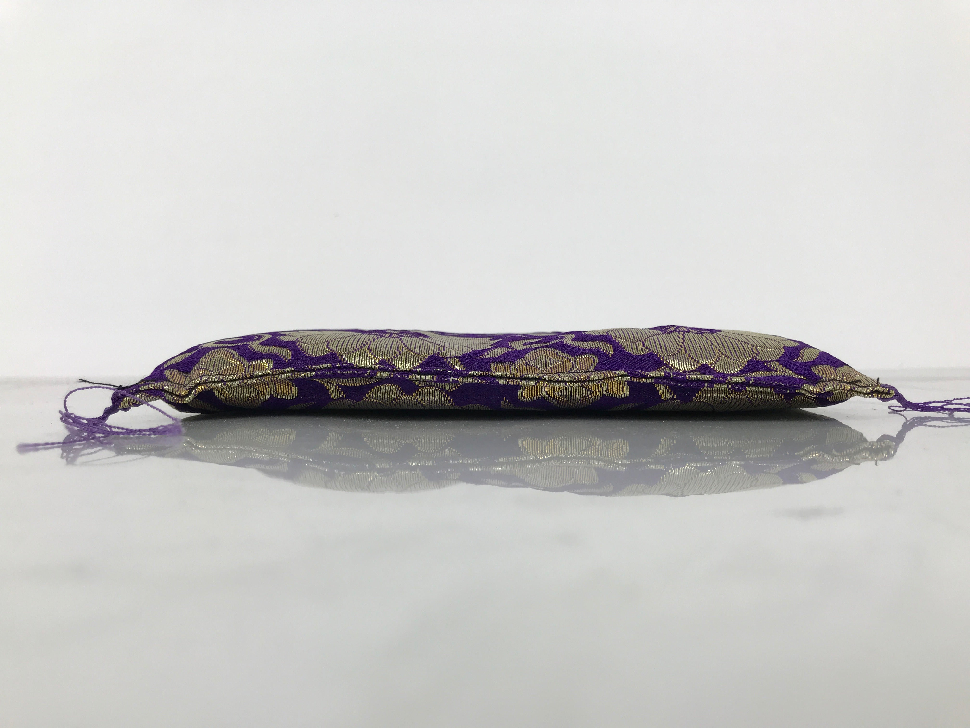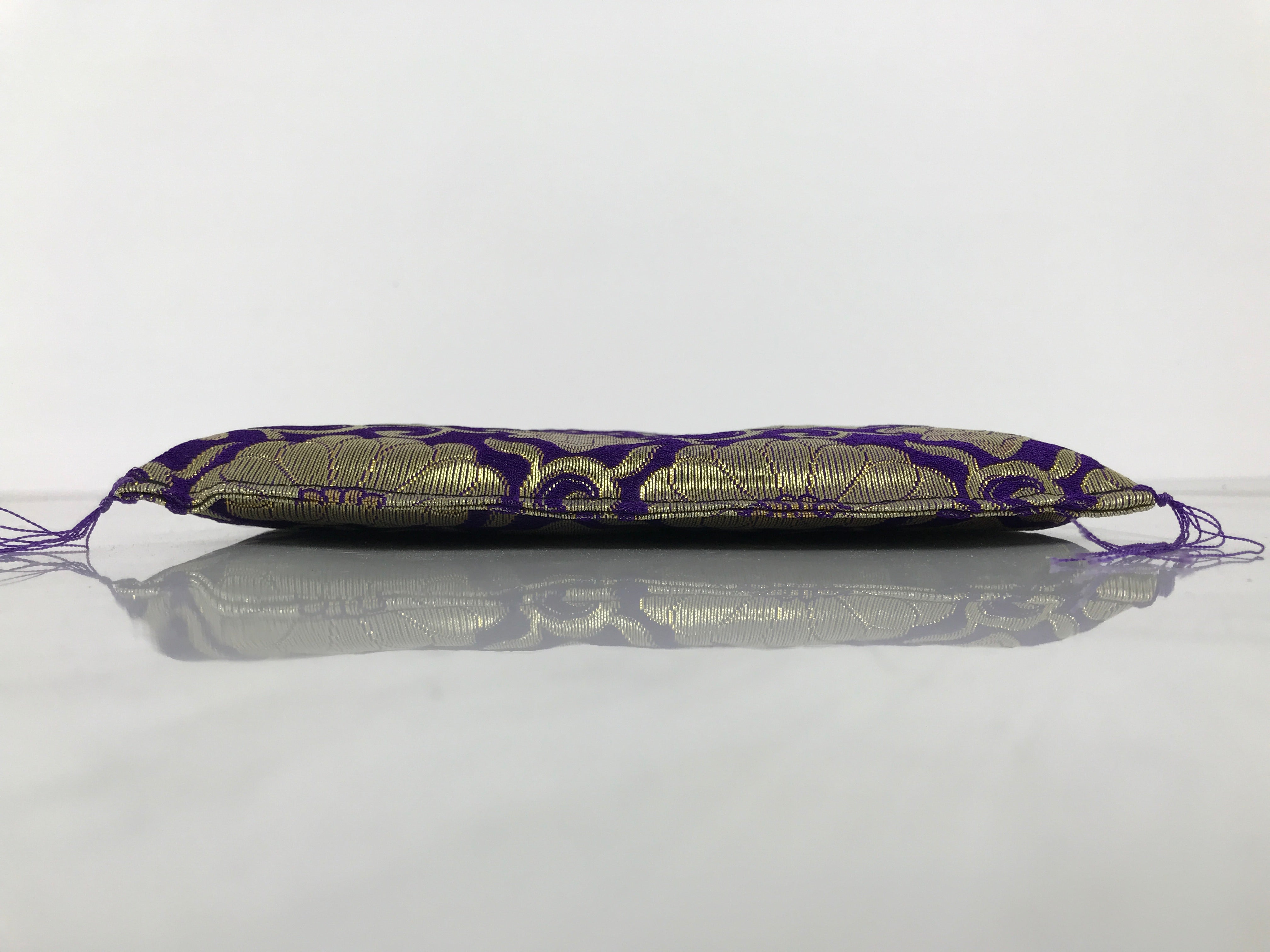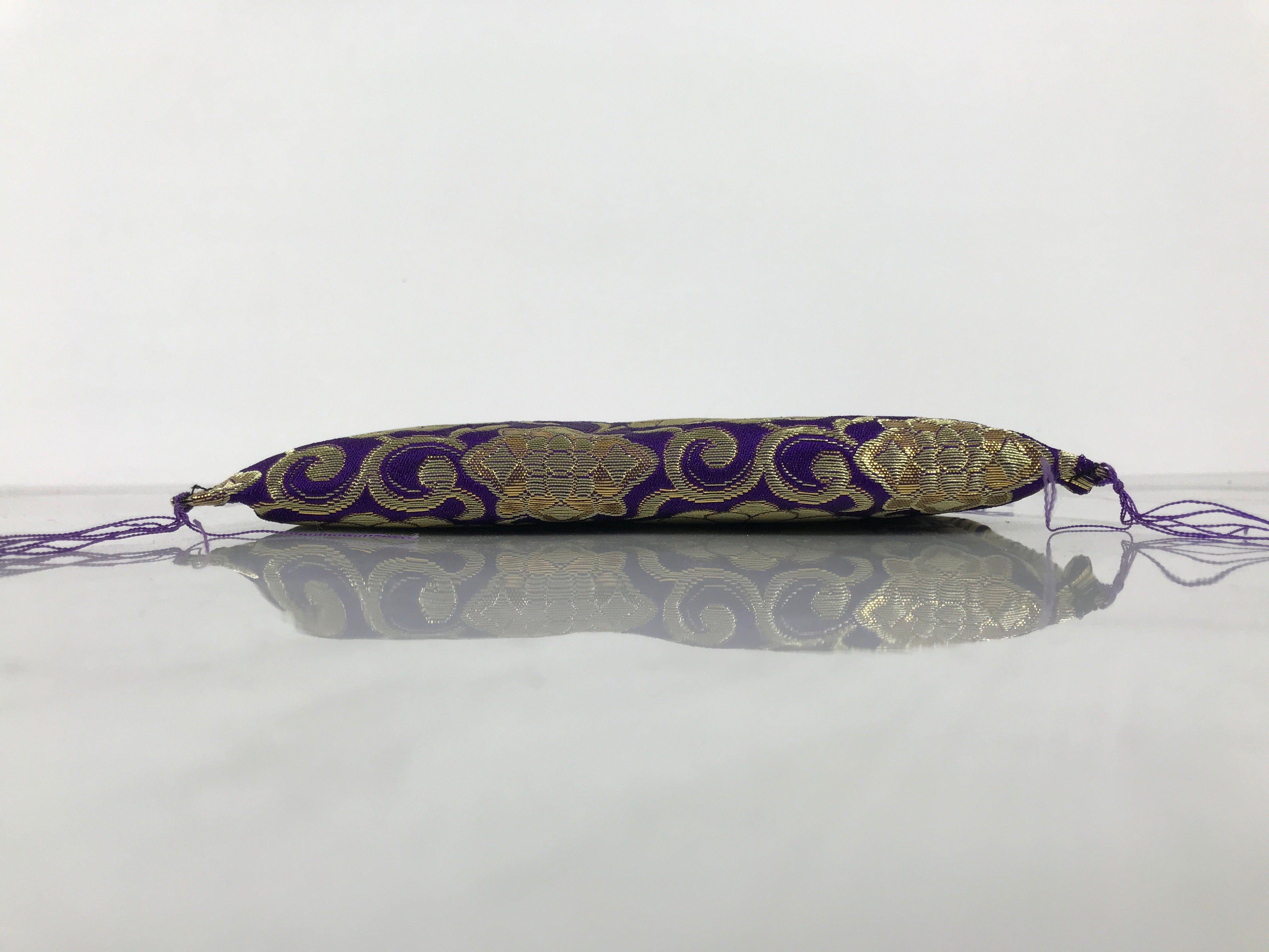 This is a vintage Japanese pillow/cushion stand. It is used for decorating Buddhist altars and acts as an accessory to important religious items. Due to its square shape, this particular piece is likely used for mokugyo, a fish-shaped wooden drum used to keep time during chants. It is purple with beautiful gold chrysanthemum and vine design and has small tassels on each corner. There is a rigid material inside to keep the stand firm, but still has some plushness to it.