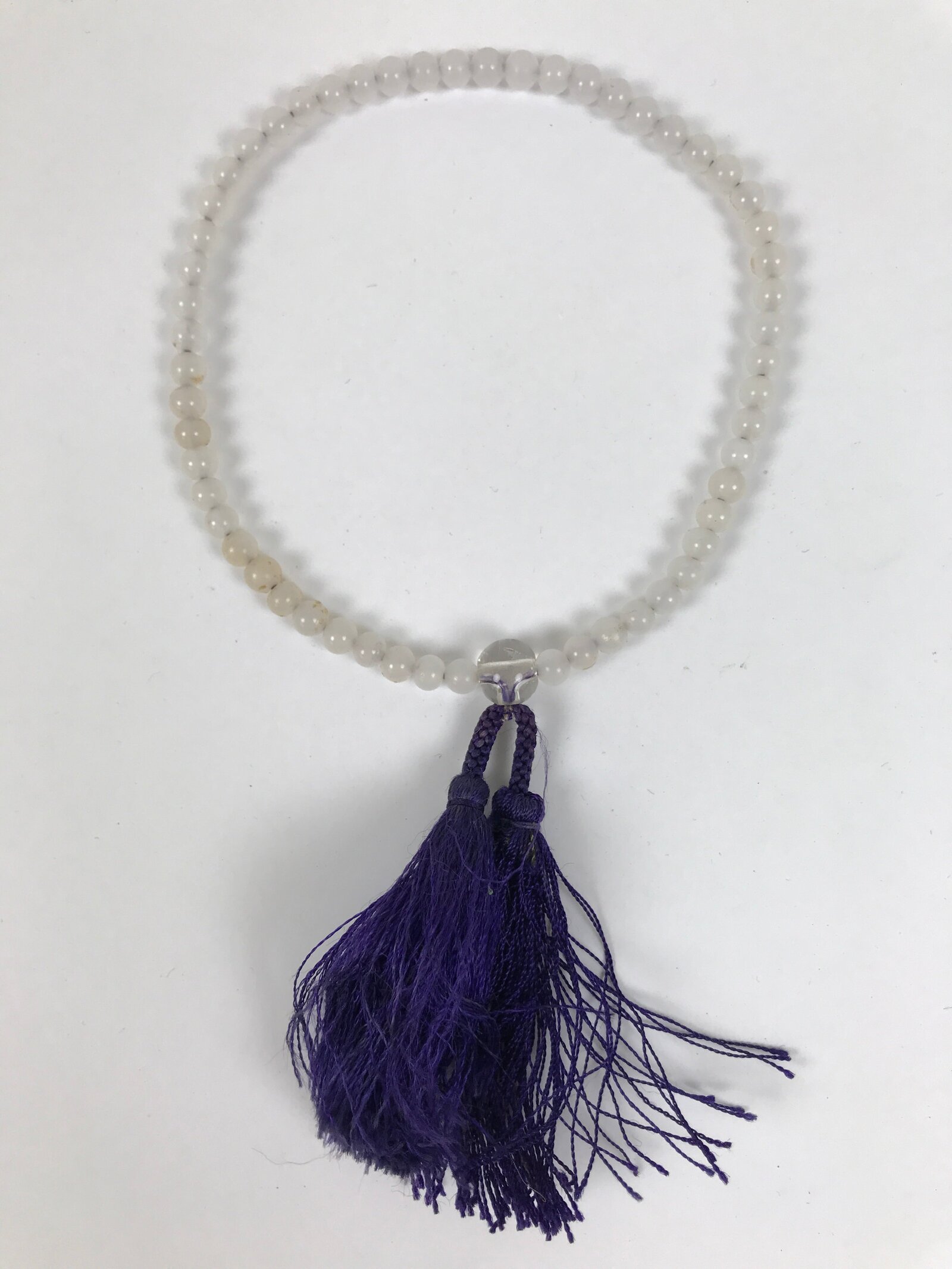 This is a vintage Japanese Buddhist prayer rosary bracelet, Juzu. It is made of small, semi-opaque white glass beads. At the bottom is a large, clear glass bead, and there are purple tassels. This style is commonly used as a portable juzu for on-the-go and across various sects.