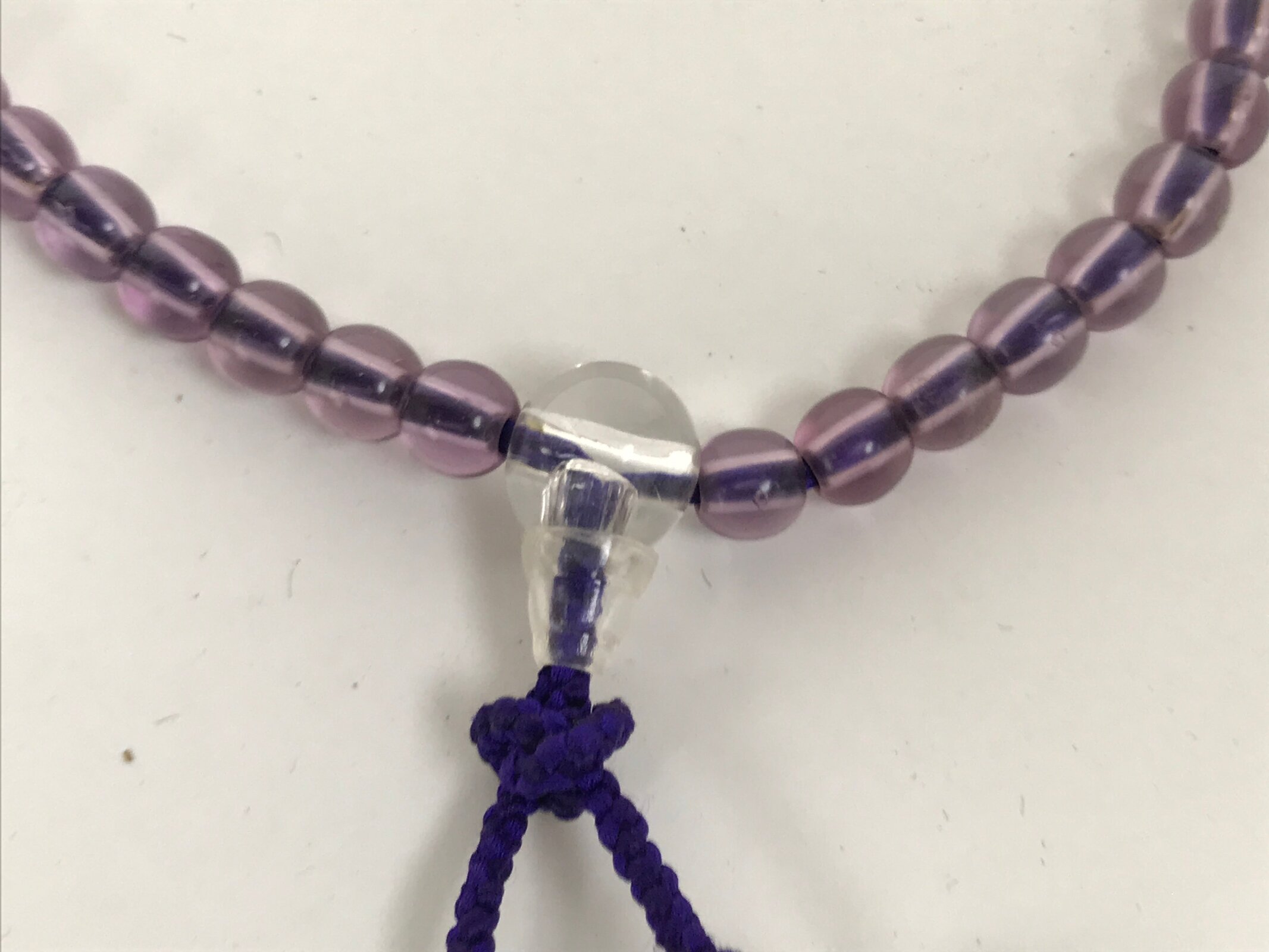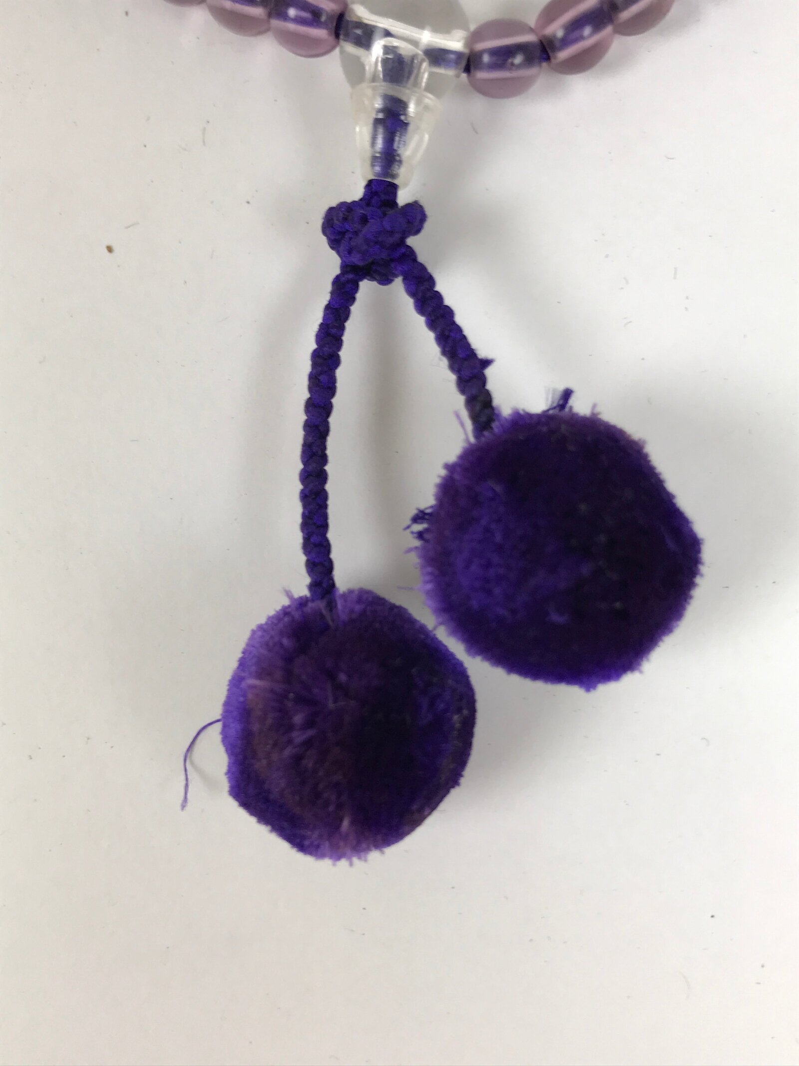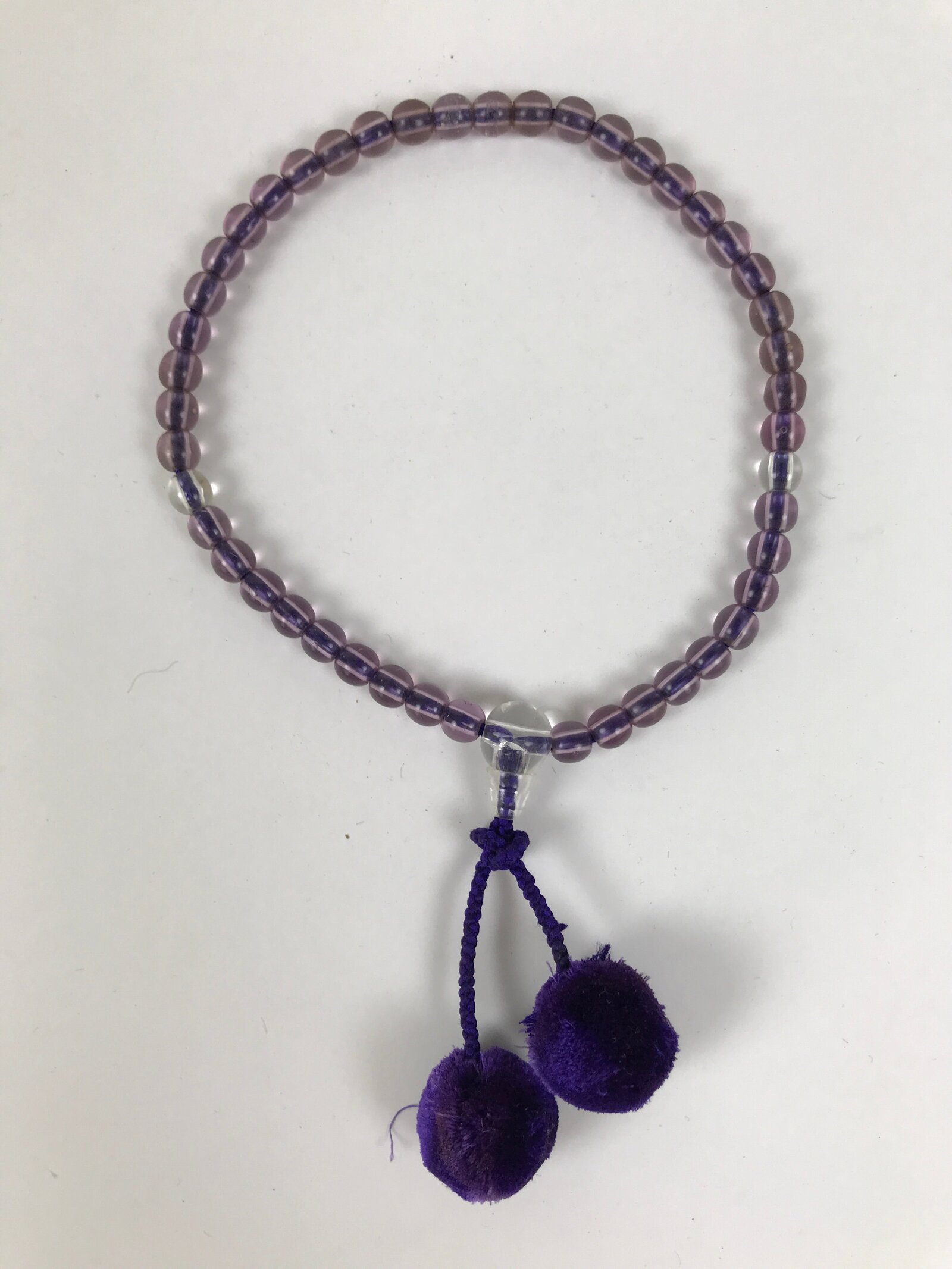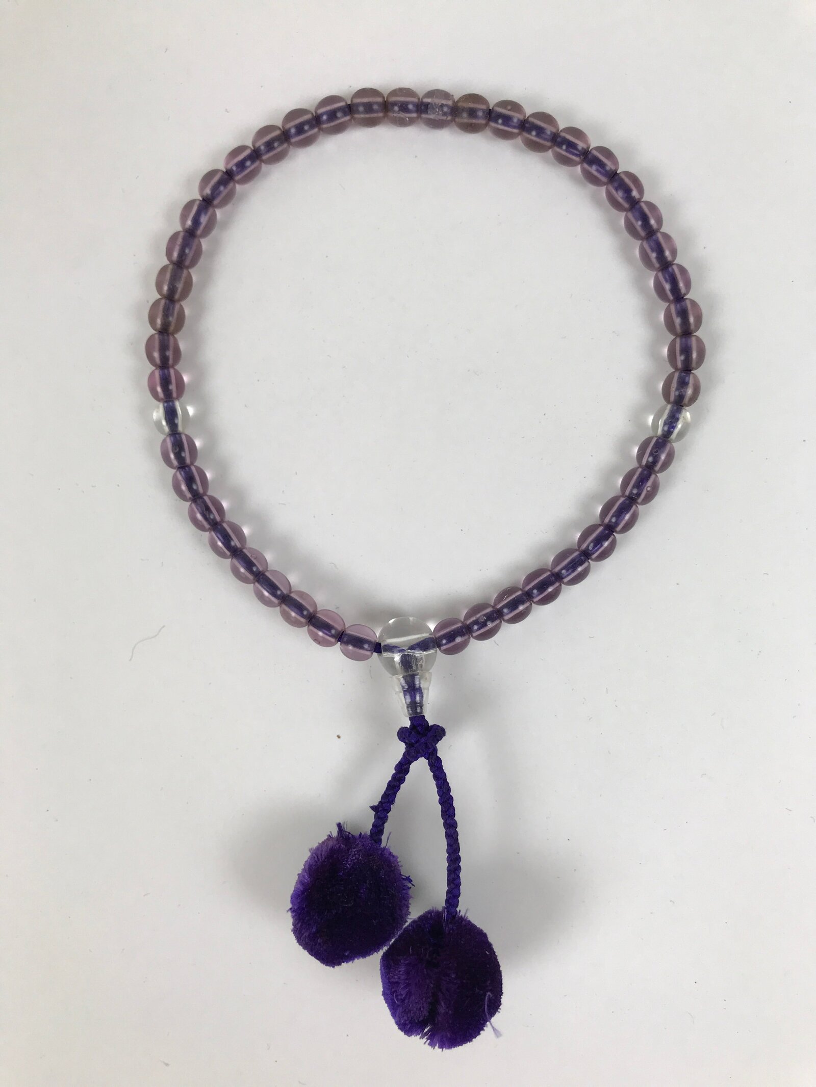 This is a vintage Japanese Buddhist prayer rosary bracelet, Juzu. It is made of transparent purple resin beads with a clear larger one at the bottom. The whole chain is held together by a purple string that goes through the larger bead and ends at purple pom pom ball-shaped tassels. This style is commonly used as a portable juzu for on-the-go and across various sects.