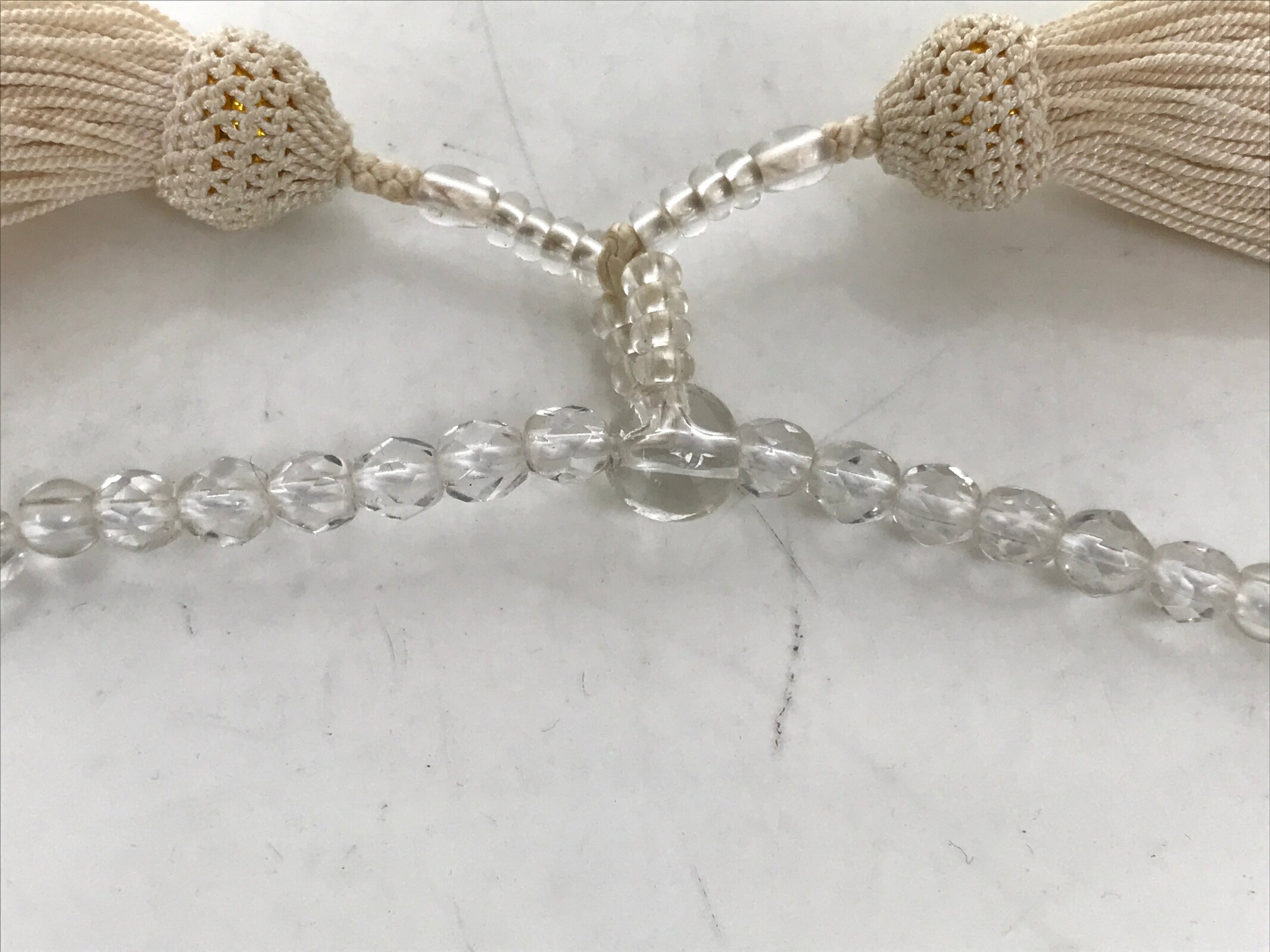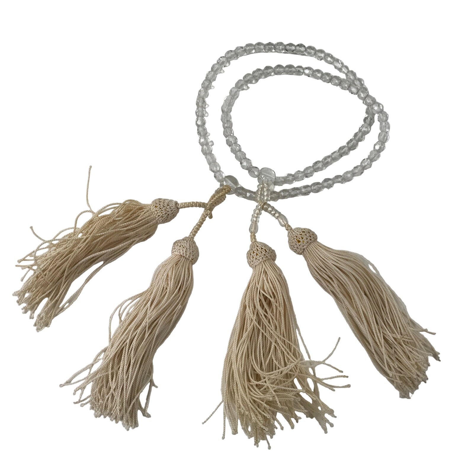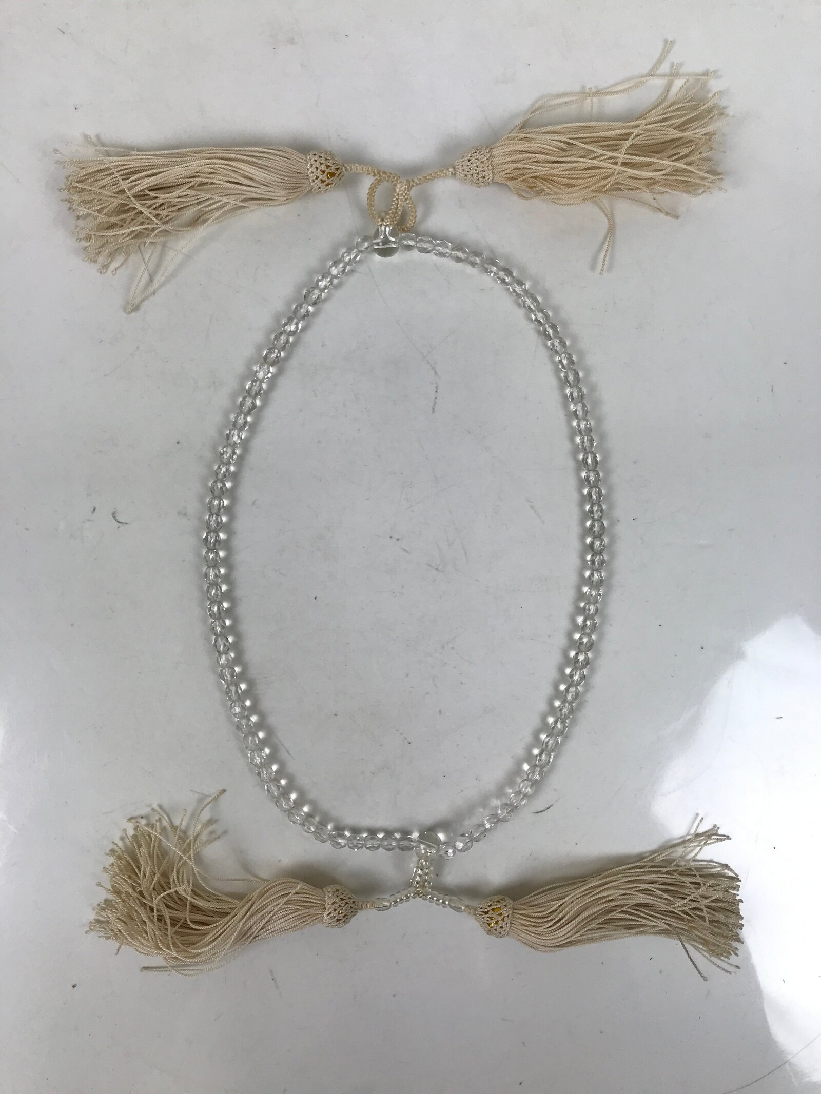 This is a vintage Japanese Buddhist prayer rosary bracelet, Juzu. It is made of small clear beads. The whole chain is held together by a white string going through two transparent main beads to which are attached two white tassels.