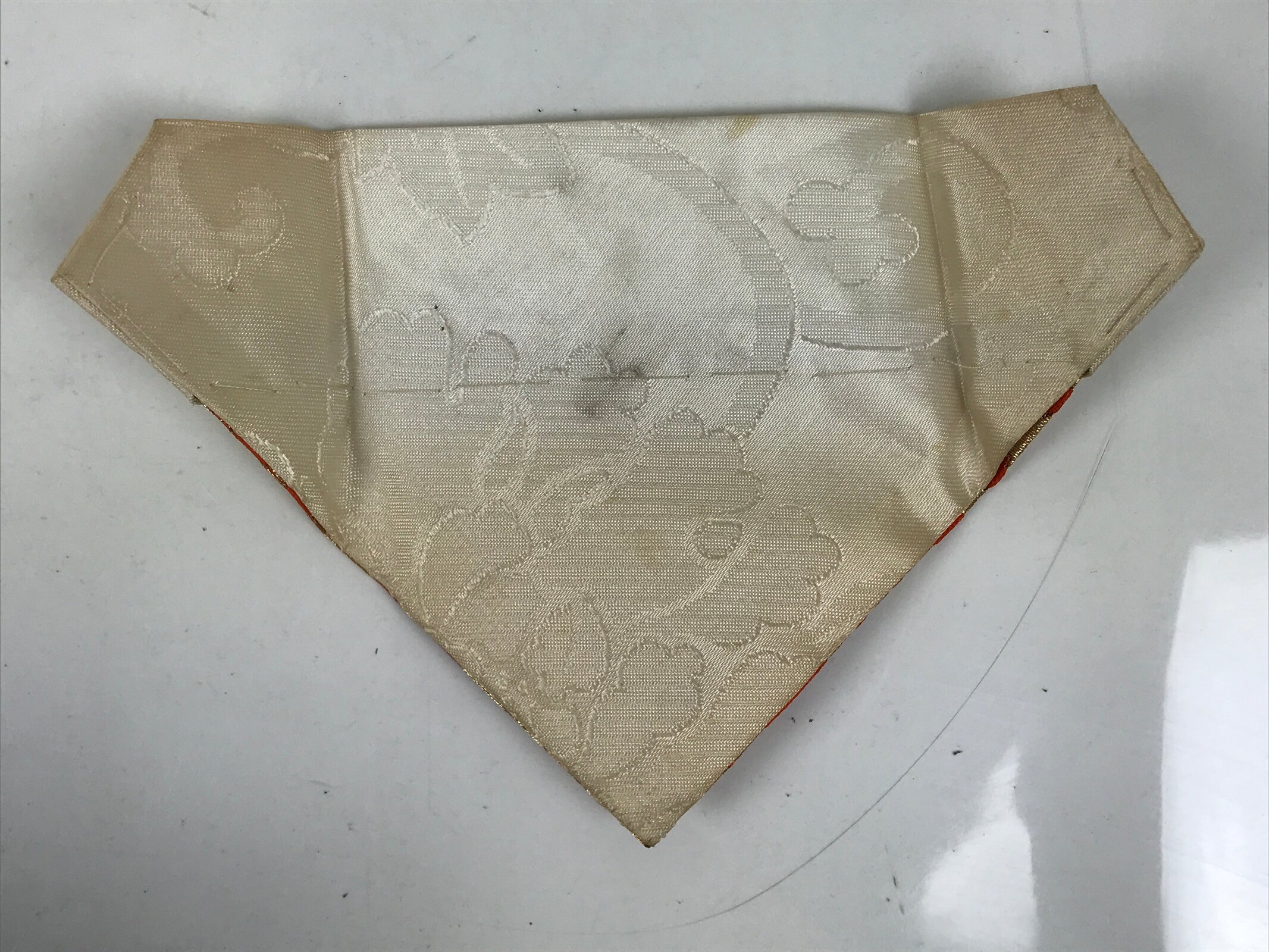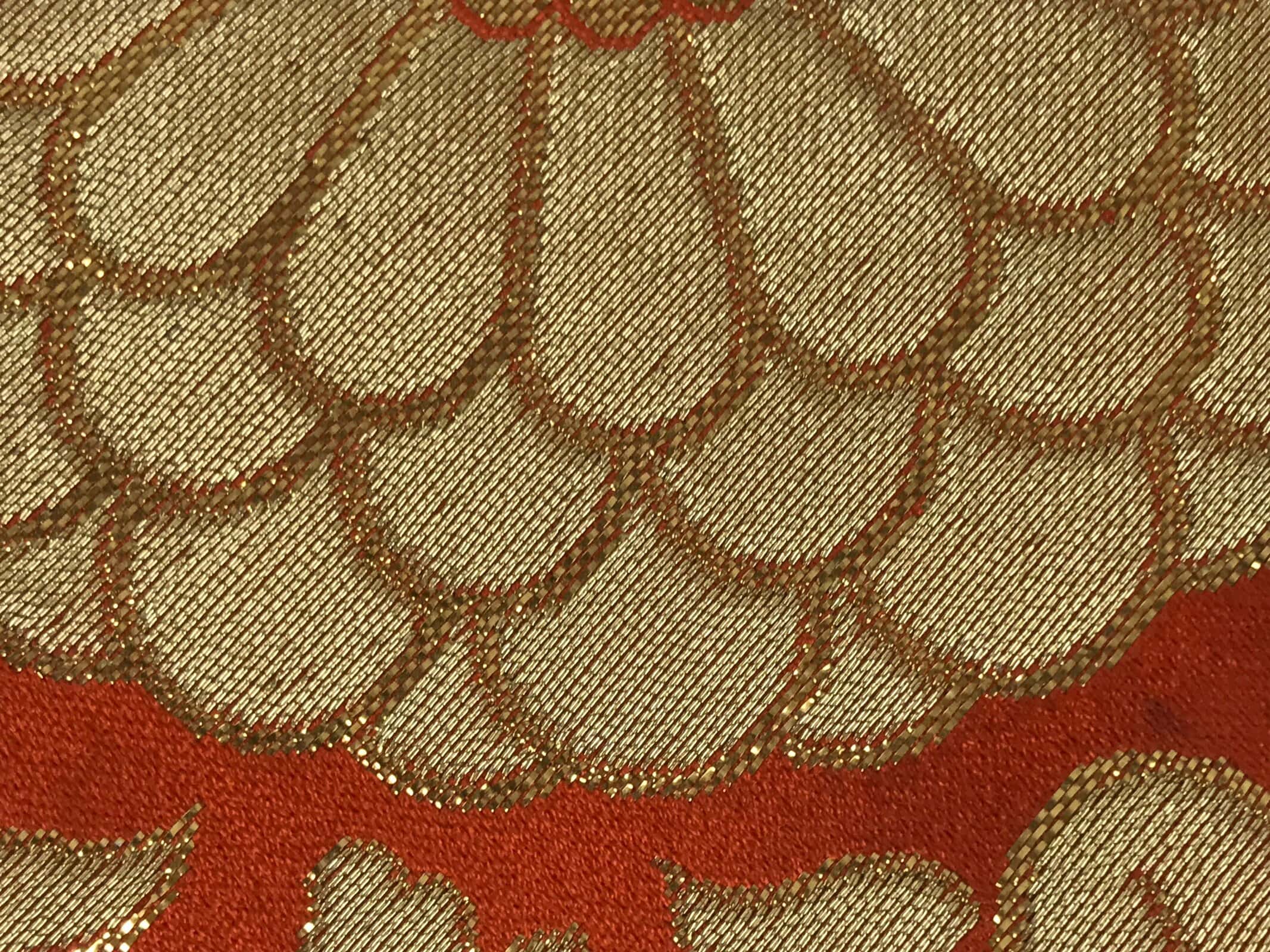 This is a vintage Japanese Buddhist altar tablecloth or uchishiki. Made of silk, the backside and the top border are white with a subtle peony and karakusa winding vines pattern, while the front side is a vibrant orange color with gold embroidered chrysanthemums (kiku) and paulownia flowers (kiri).