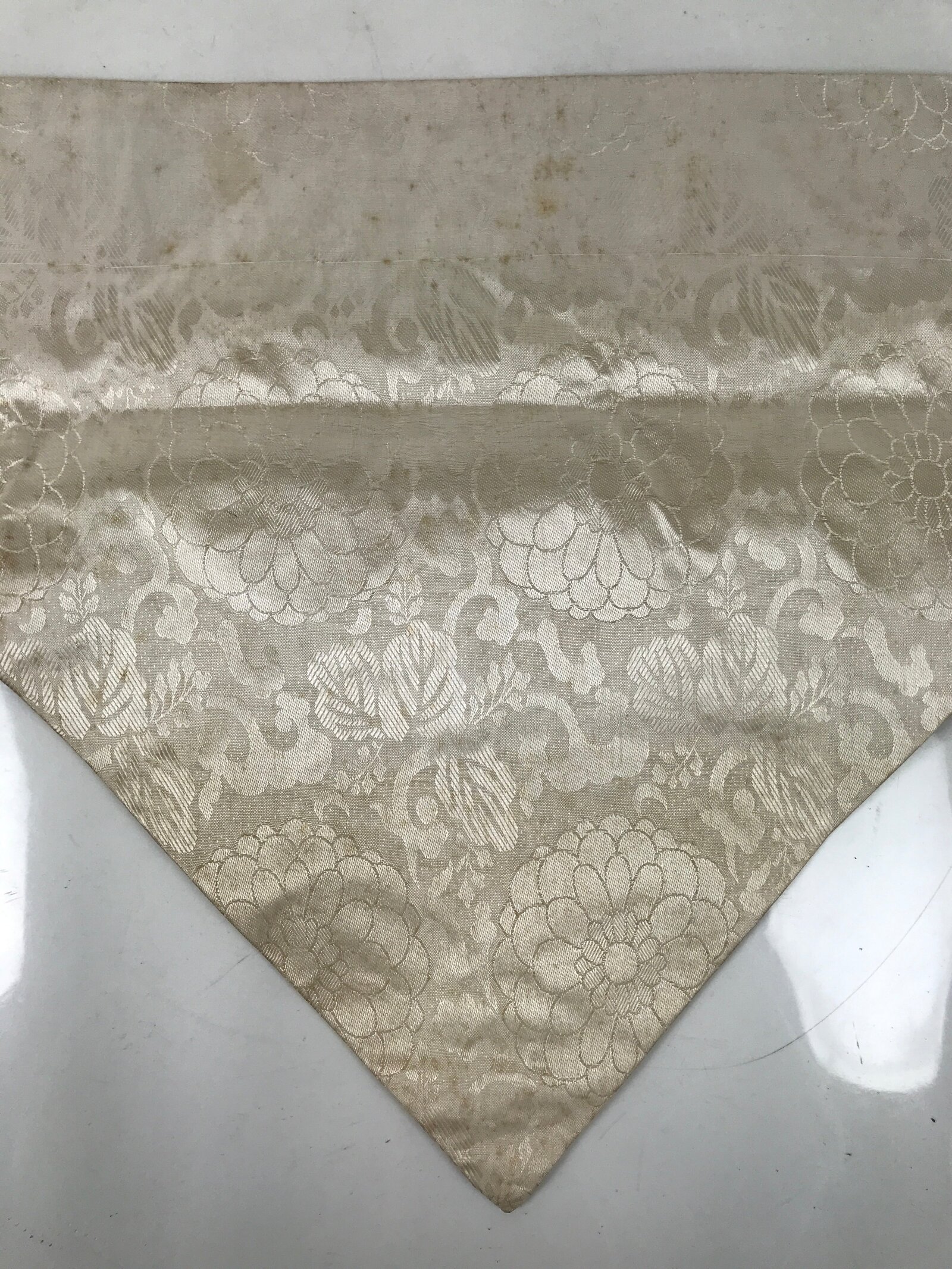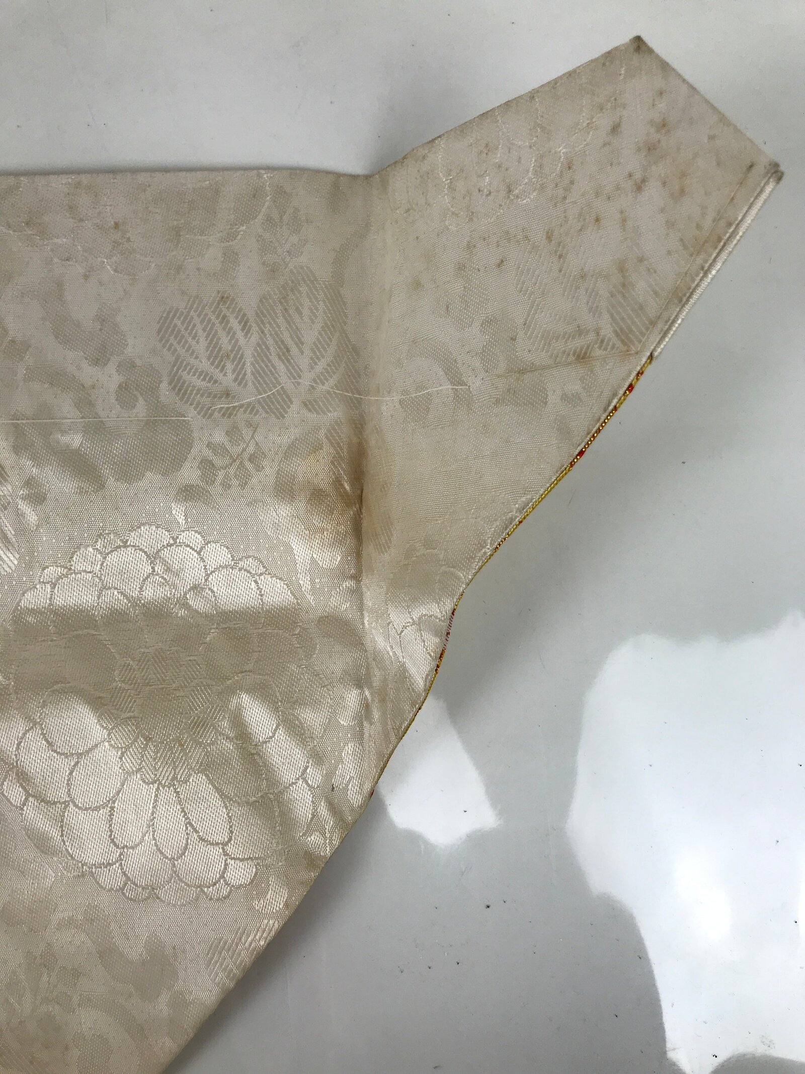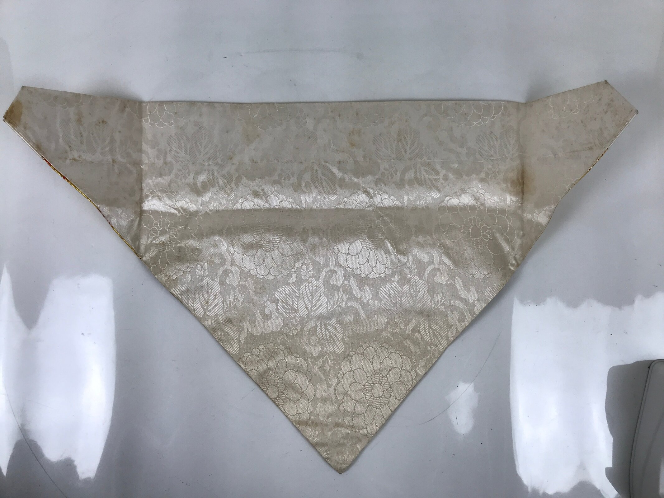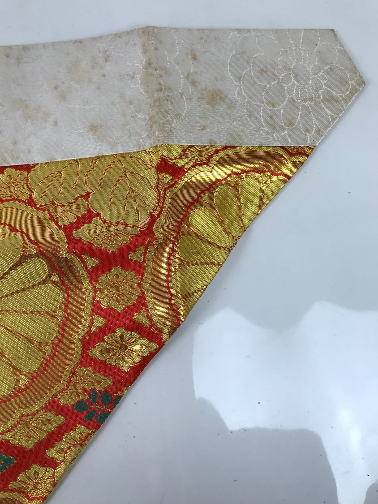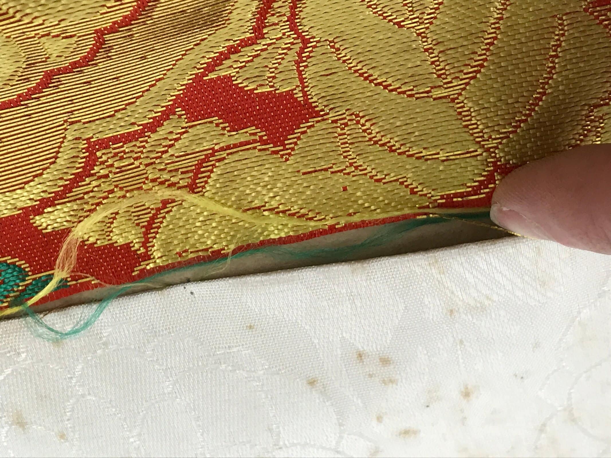 - Good condition considering its age. Red and gold fabric coming loose on top edge. Some light brown stains on white sections. Wear and tear due to age. Please see the photos carefully.