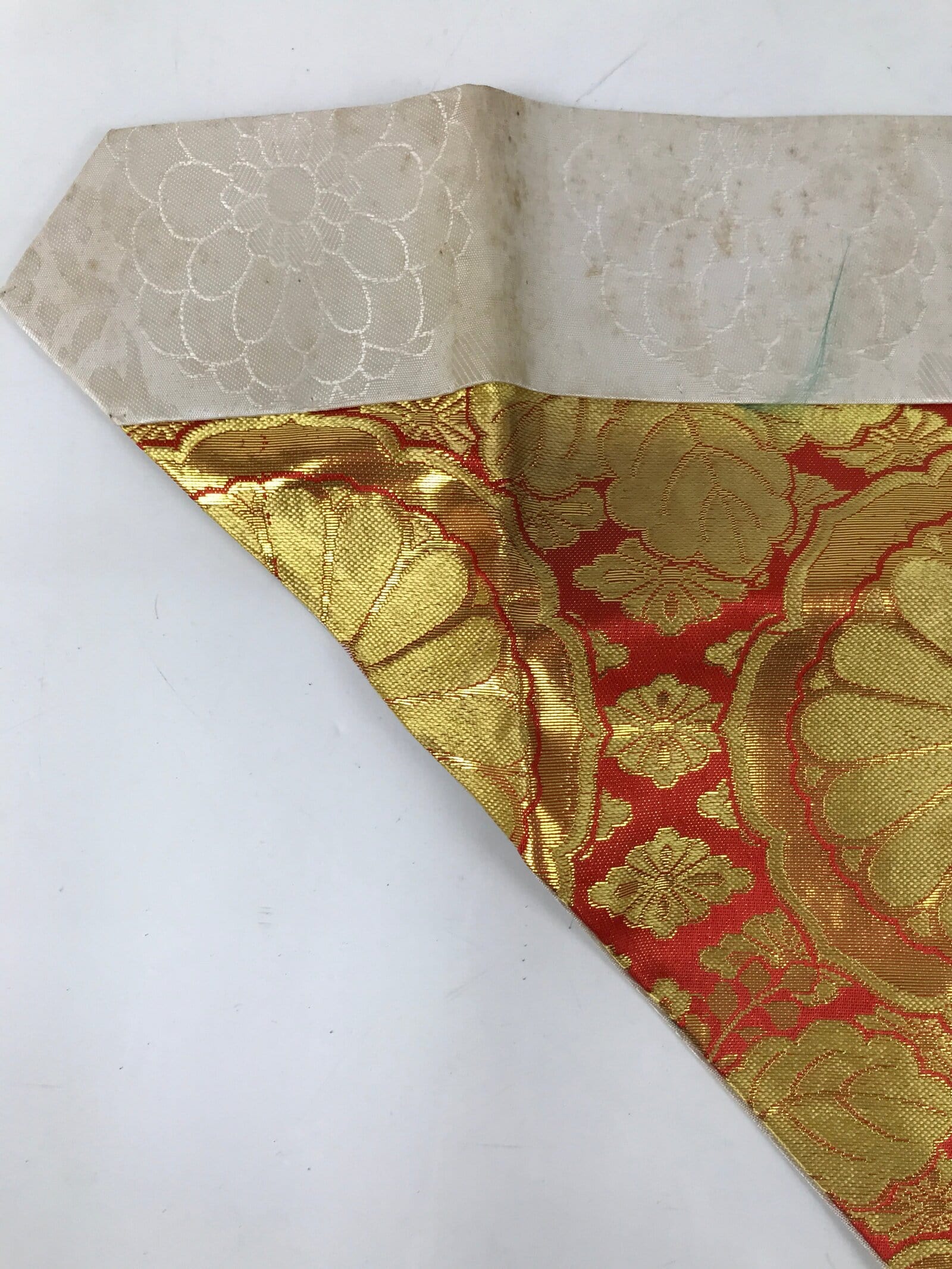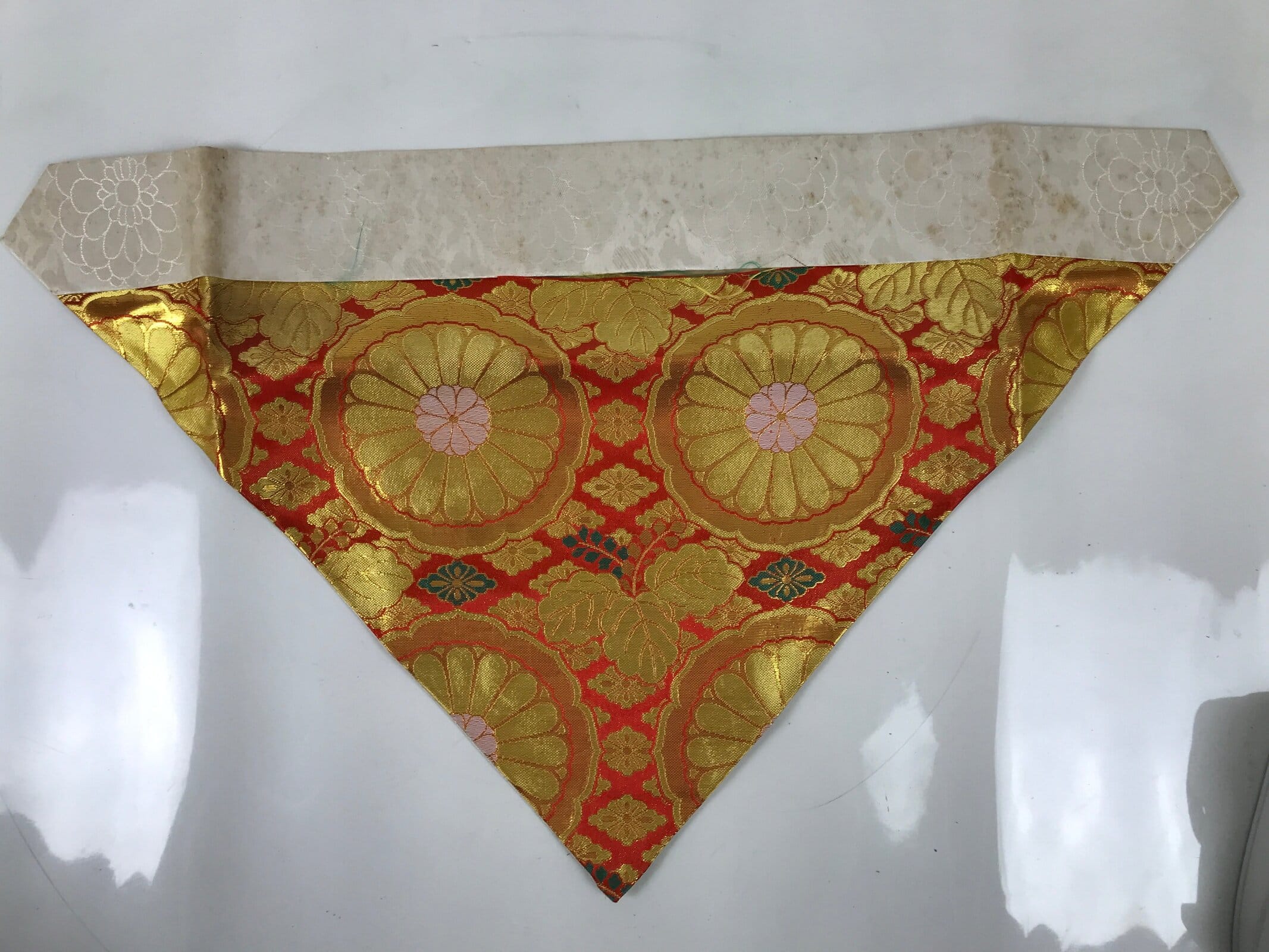 This is a large vintage Japanese Buddhist altar tablecloth or uchishiki. Made of silk, the backside and the top border are white with a large chrysanthemum and paulownia flower pattern, while the front side is a combination of bright red and gold featuring chrysanthemums and paulownia flowers.