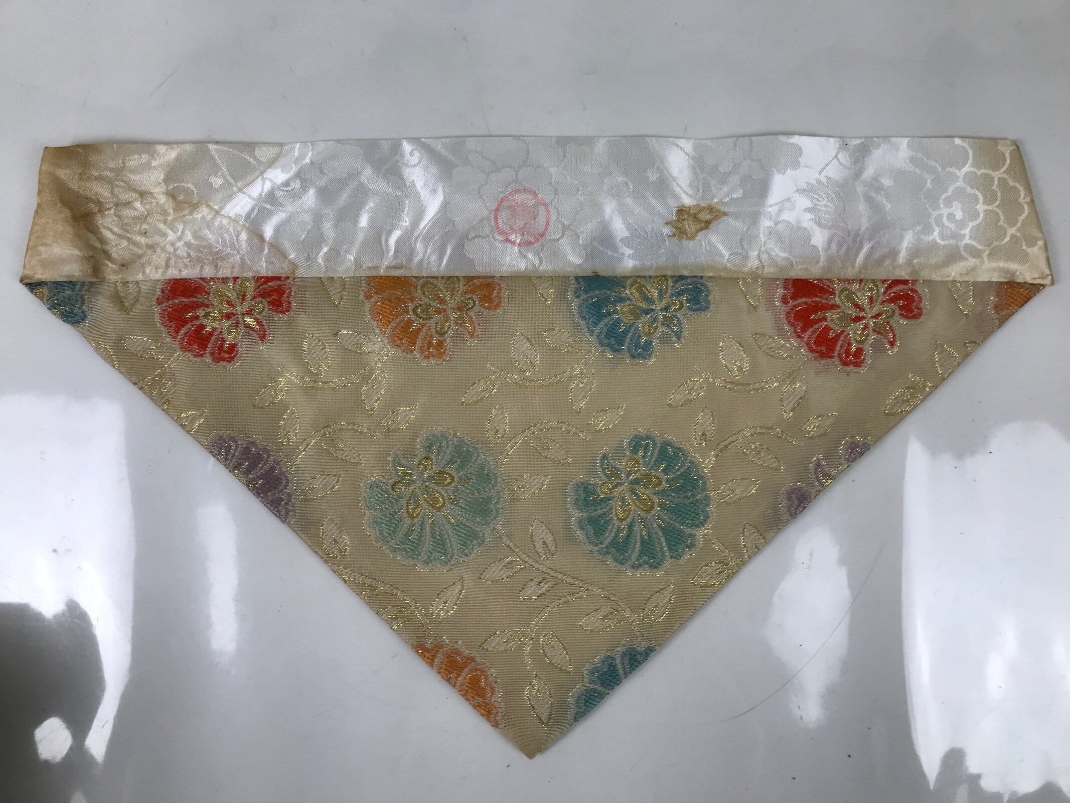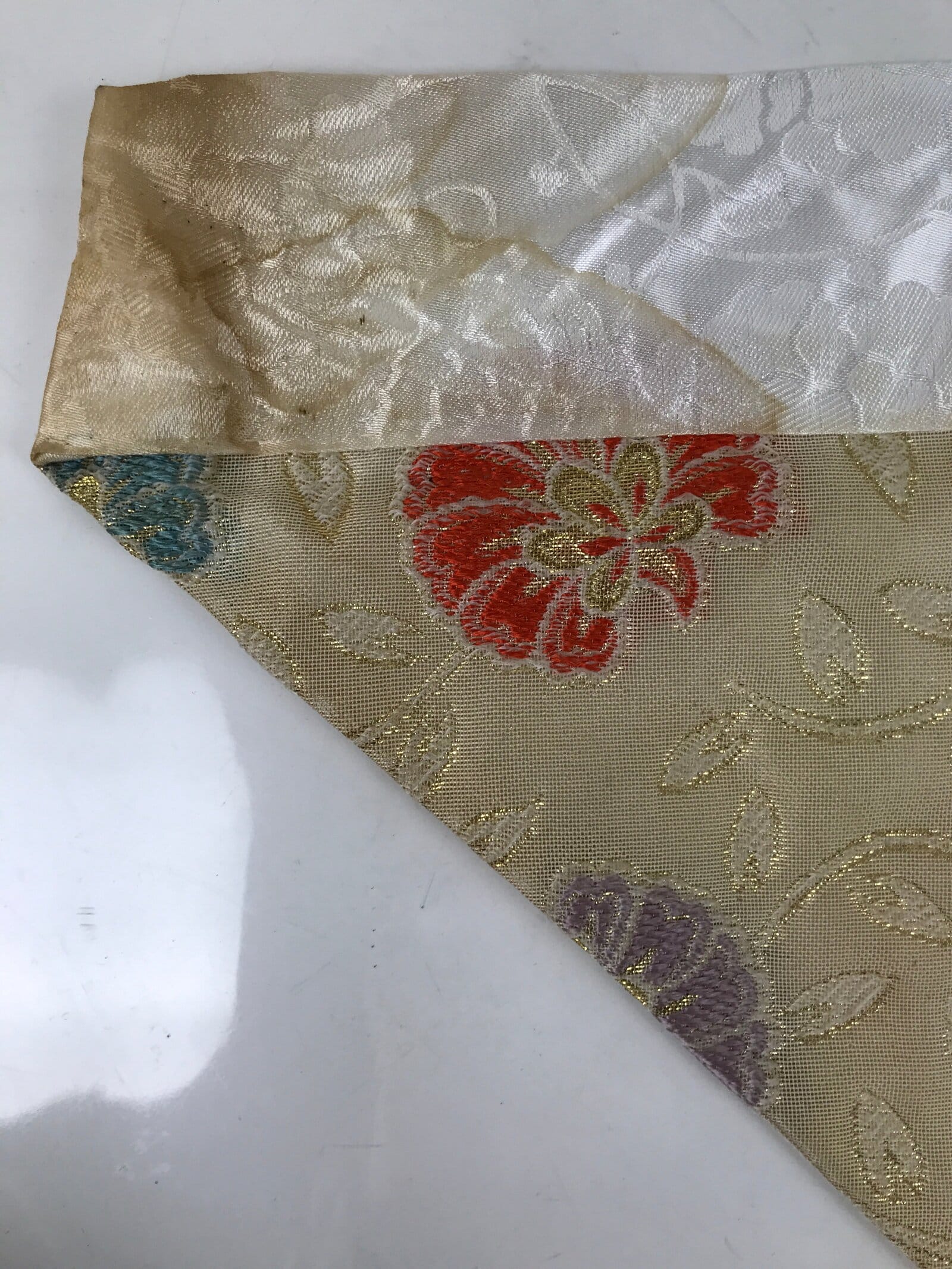 This is a vintage Japanese Buddhist altar tablecloth or uchishiki. Made of silk, the backside and the top border are white with a large peony pattern, while the front side is a gentle beige color with embroidered flowers in pastel blue, red, and orange with gold accents.