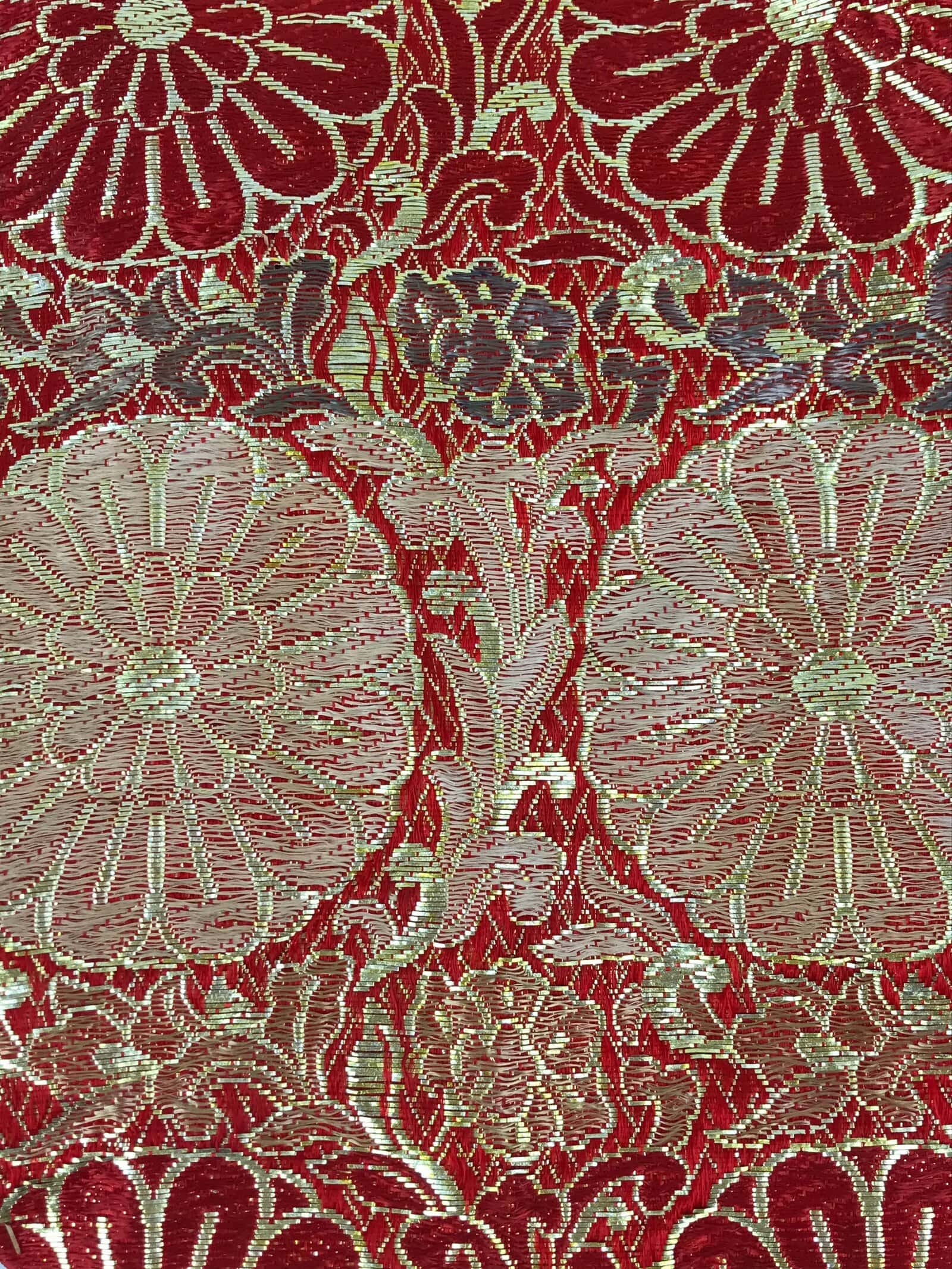 This is a vintage Japanese Buddhist altar tablecloth, or uchishiki. Made of silk, the top band and backside have a white floral design. The main part has rich red background with striking gold embroidered chrysanthemums (kiku). The chrysanthemum is one of many important symbols in Japanese culture.