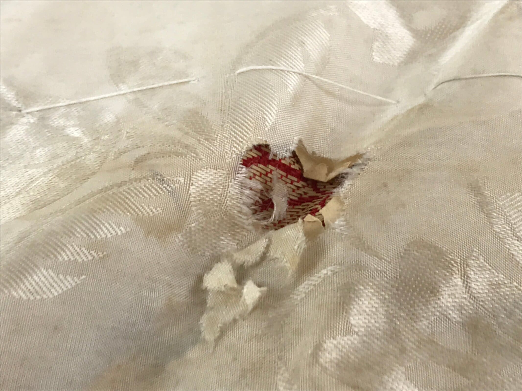 - Good condition considering its age. Staining and discoloration throughout. Holes on backside. Some fraying of embroidery and along borders. Wear and tear due to age. Please see the photos carefully.