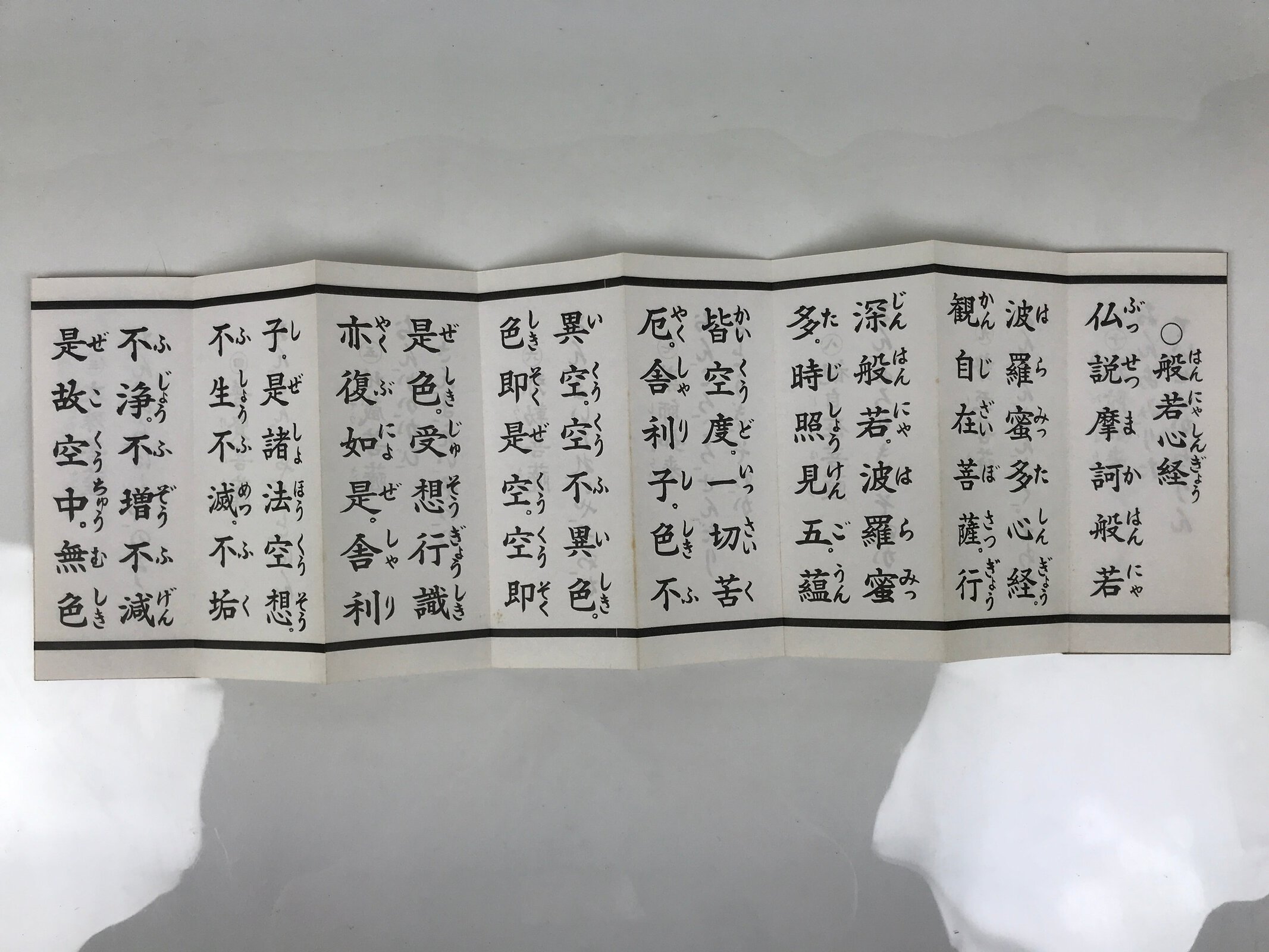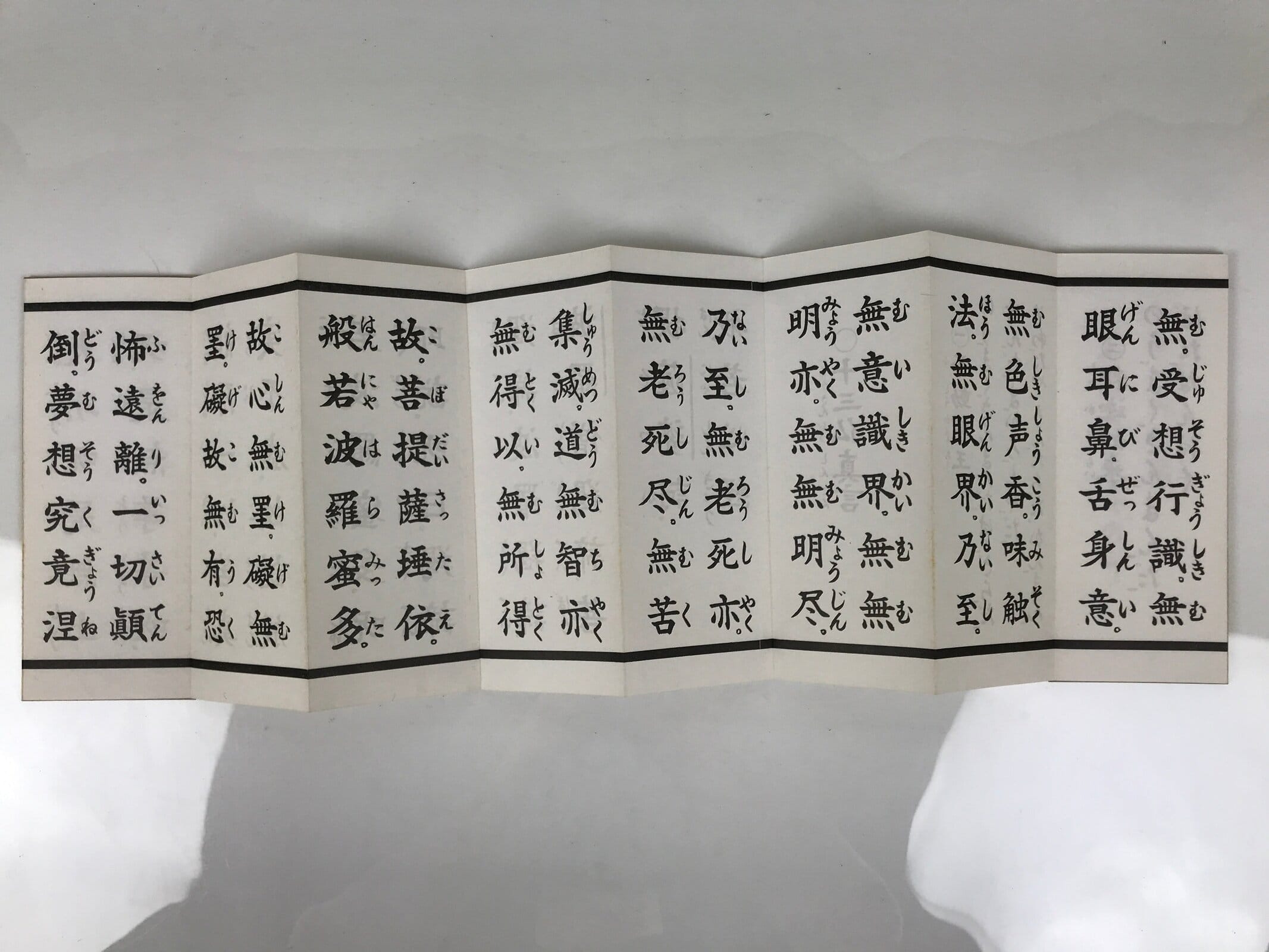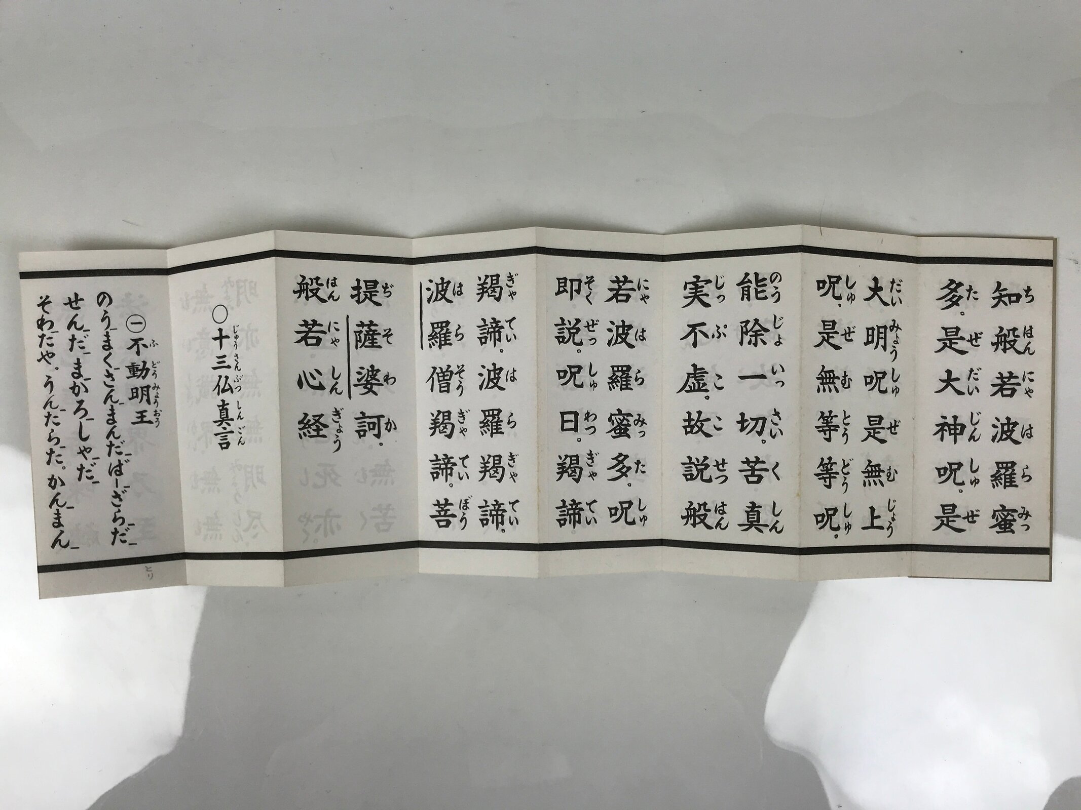 This vintage Japanese Buddhist accordion-style book is called Butsuzen Gongyo Shidai and contains several Buddhist texts such as the Heart Sutra (Hannya Shingyo). This book is from Idoji Temple., the 17th temple of the Shikoku Sacred Places pilgrimage. This book has a purple-blue cover. The pages are printed on both sides.