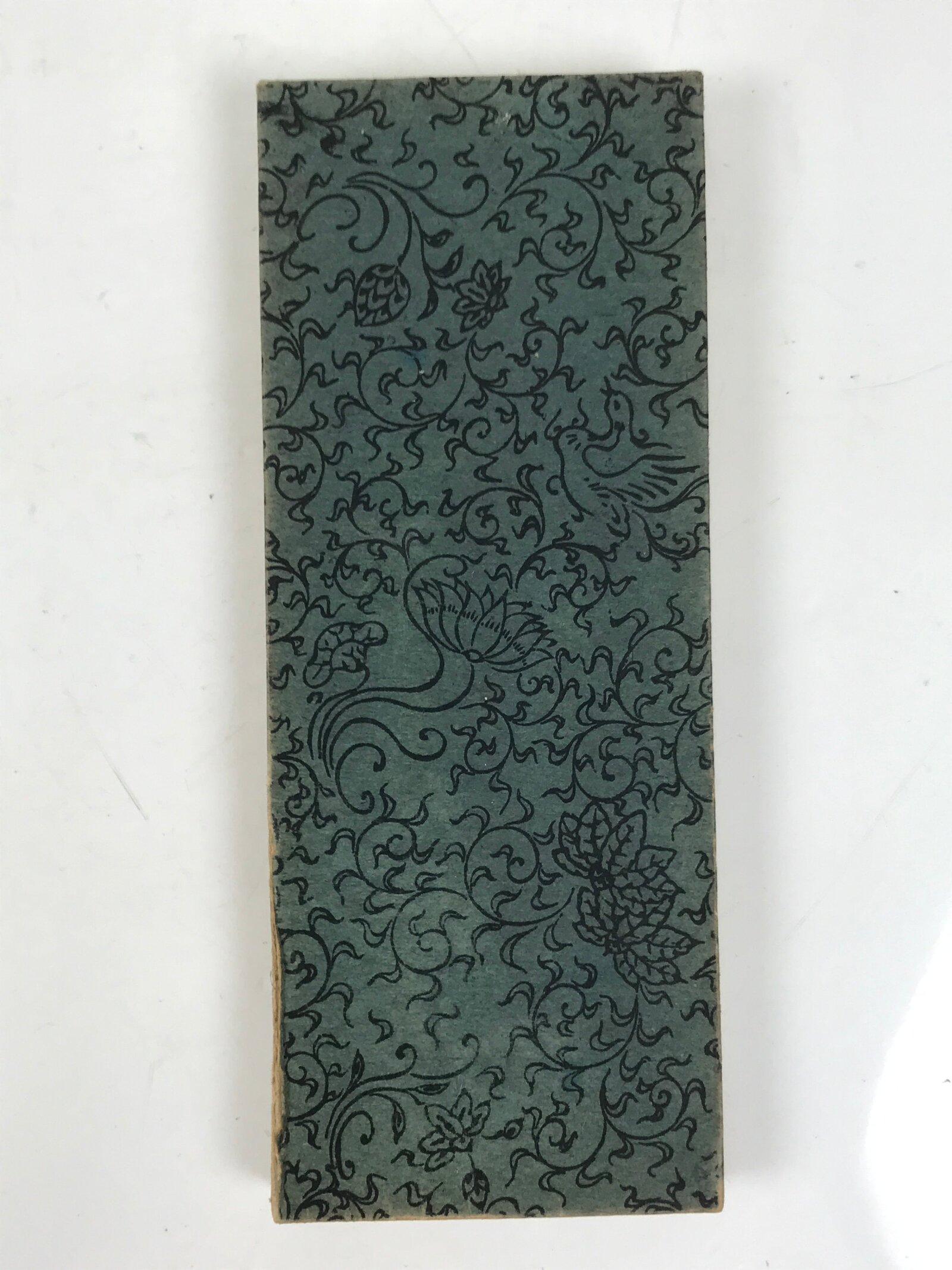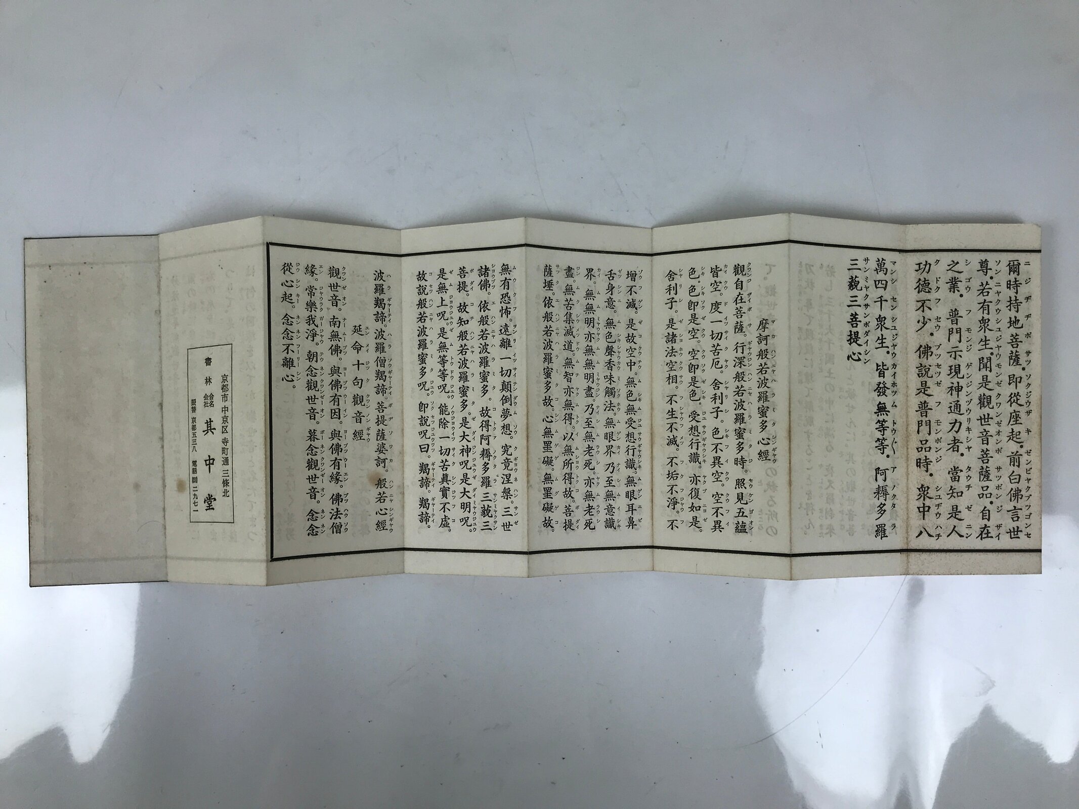 This vintage Japanese Buddhist book called Kannon-kyo (Universal Gateway, Chapter 25 of the Lotus Sutra) is an accordion-type book with a brown cover with a floral design.
